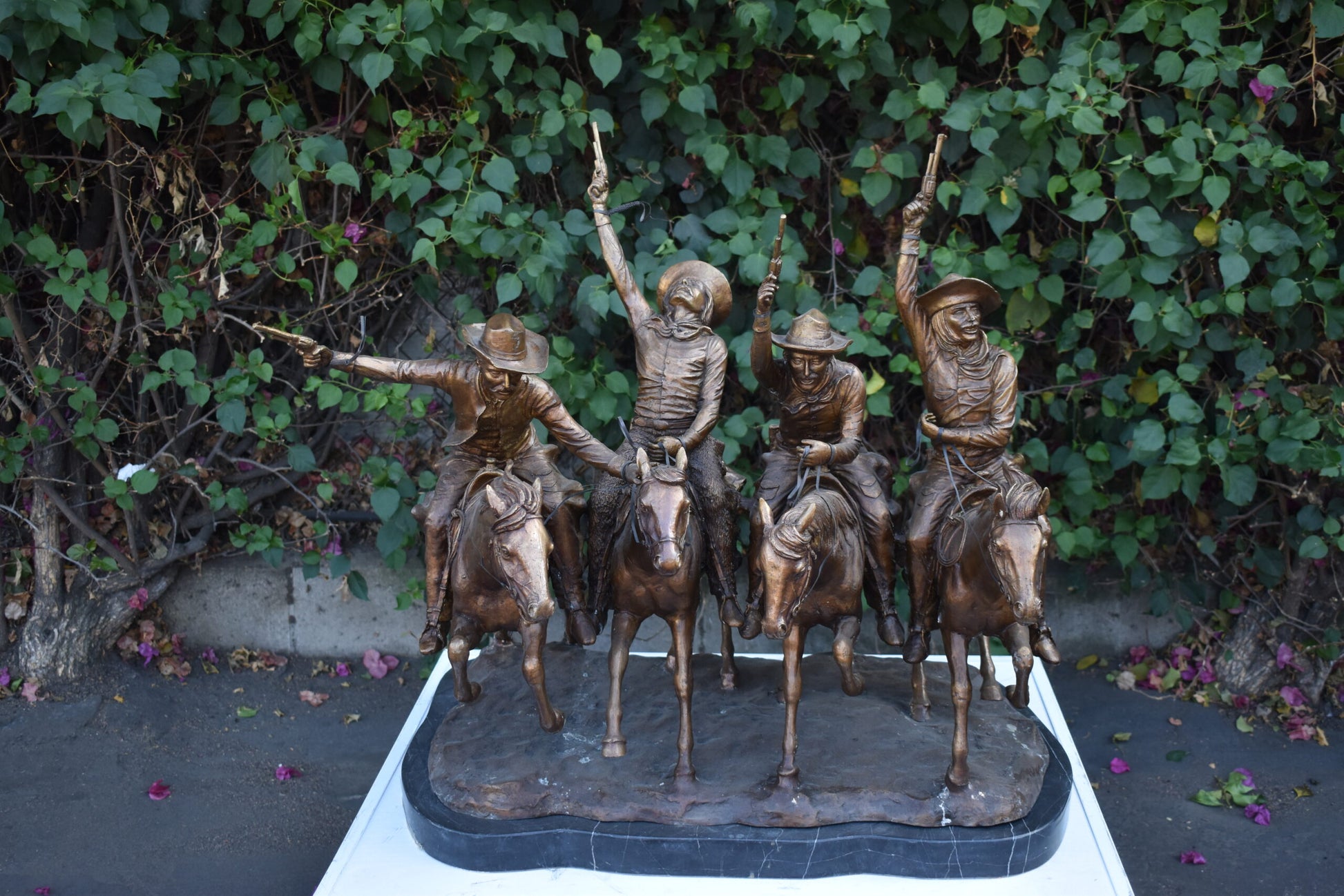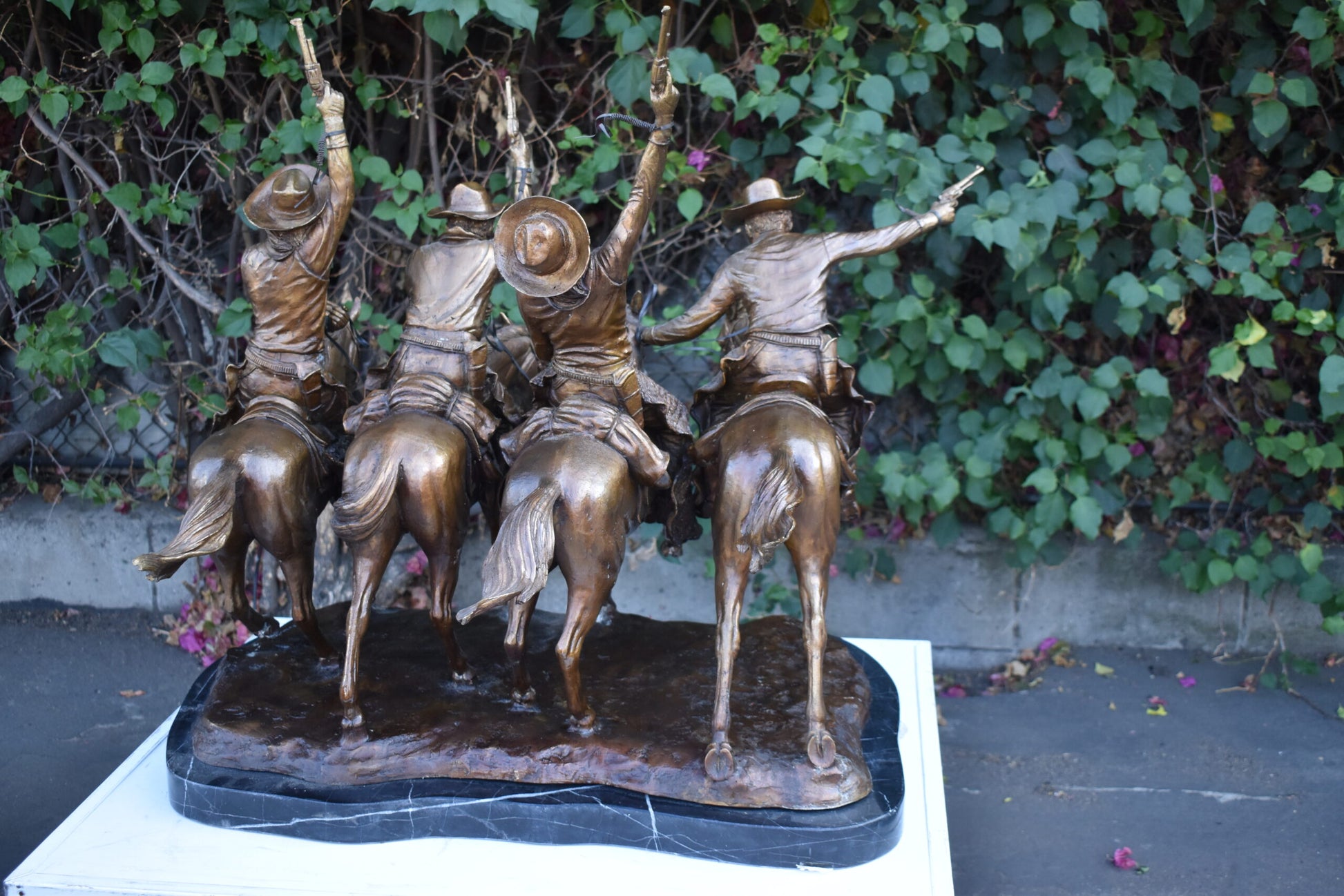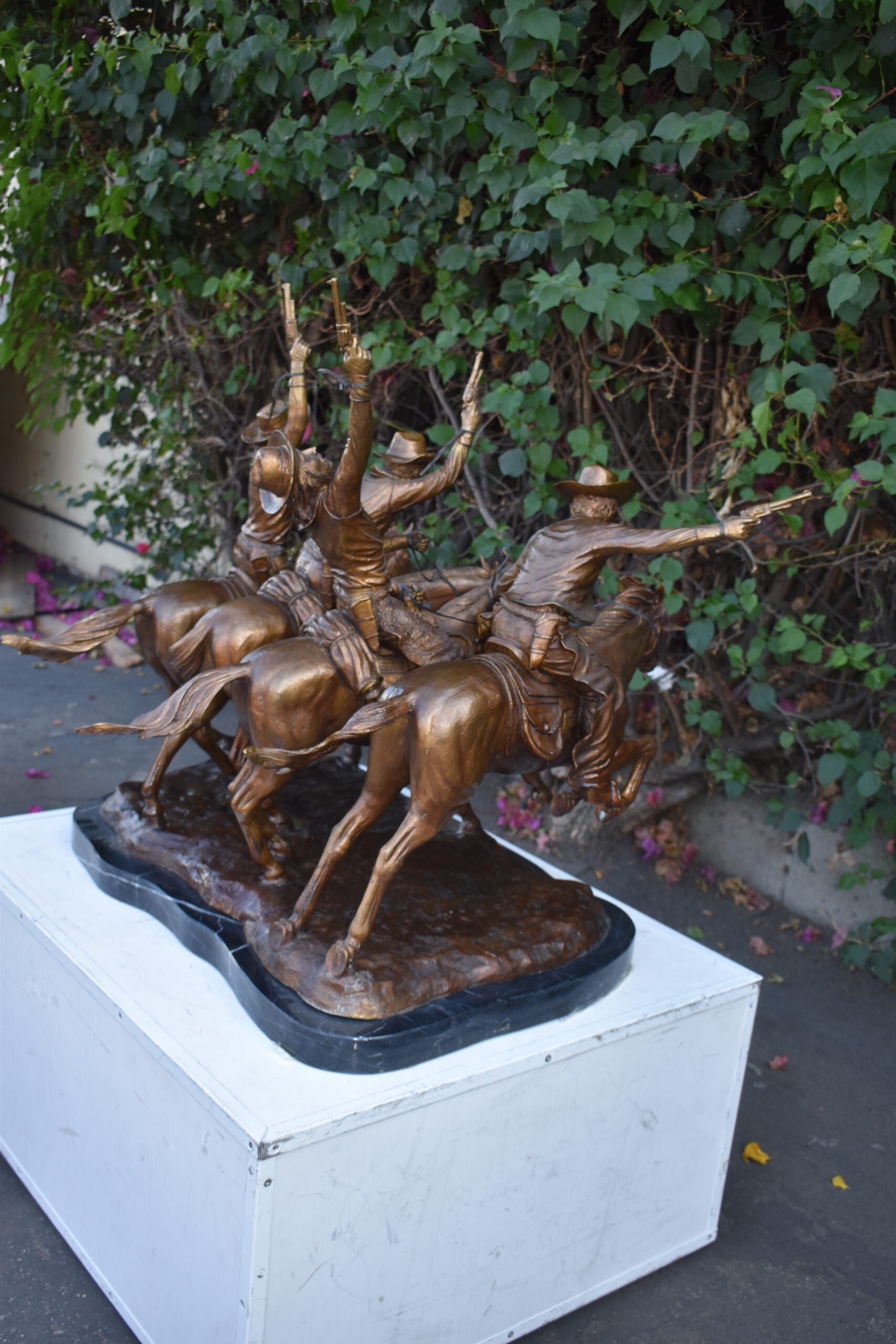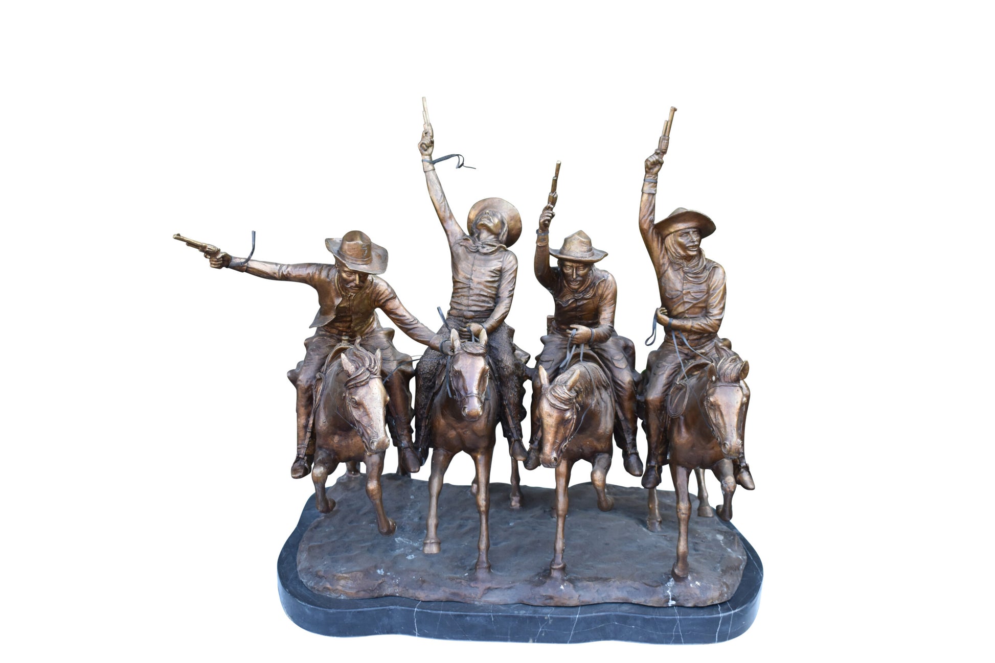 Pure Bronze sculpture Statue mounted on a marble base, Coming Through the Rye by Frederic Remington replica. The statue depicts four mounted cowboys, pistols raised aloft, keep a steady pace in a tight, boisterous group. The “Coming Through The Rye” is Frederic Remington’s most popular bronze statue, cast in the lost-wax technique, sharply delineated with a rich variety of textures, from the fringed buckskin garment to the animal’s hairy coat to the rocklike base. Size: 38"L x 27"W x 31"H. Weight is: 270Lb