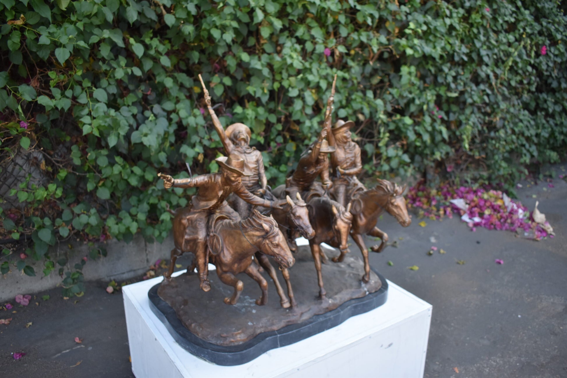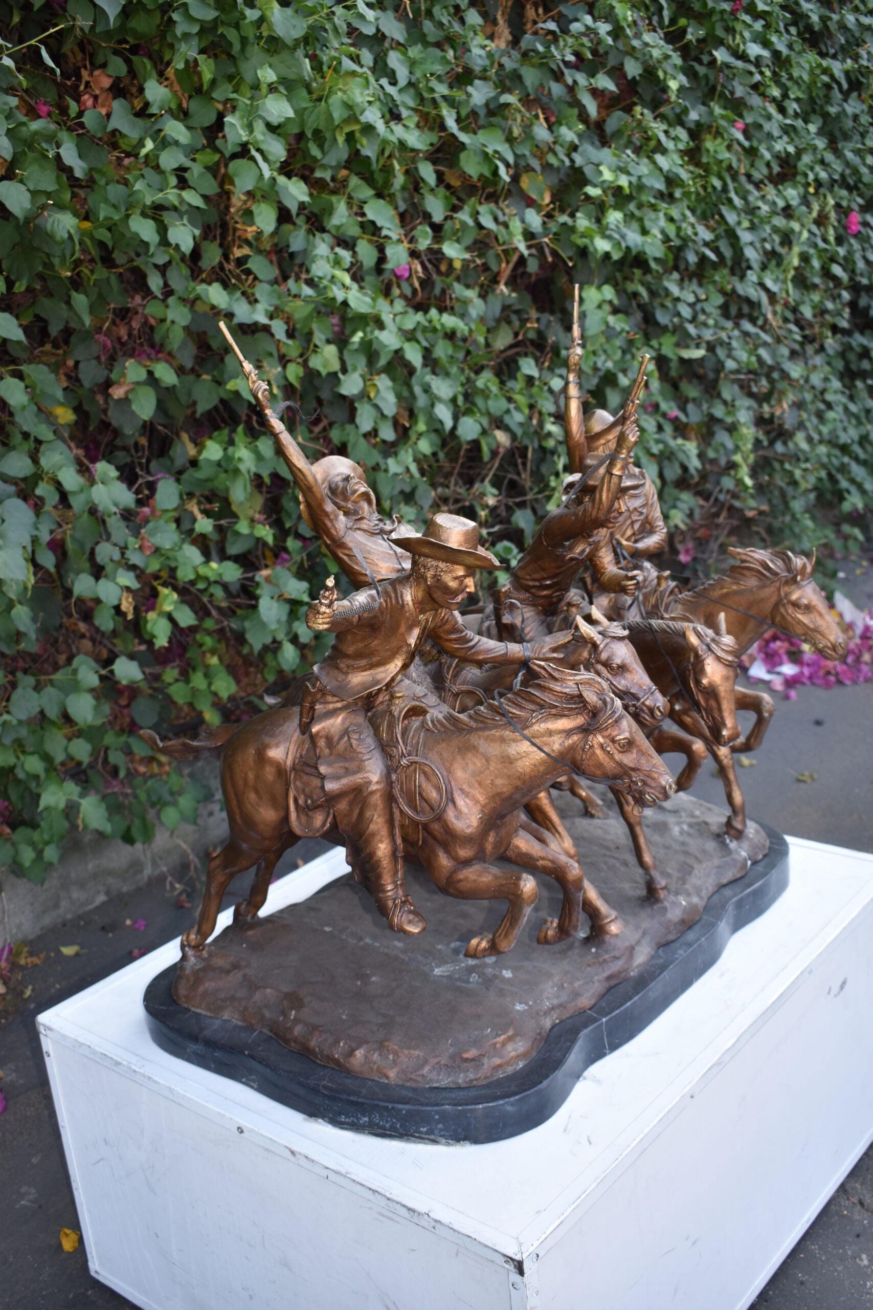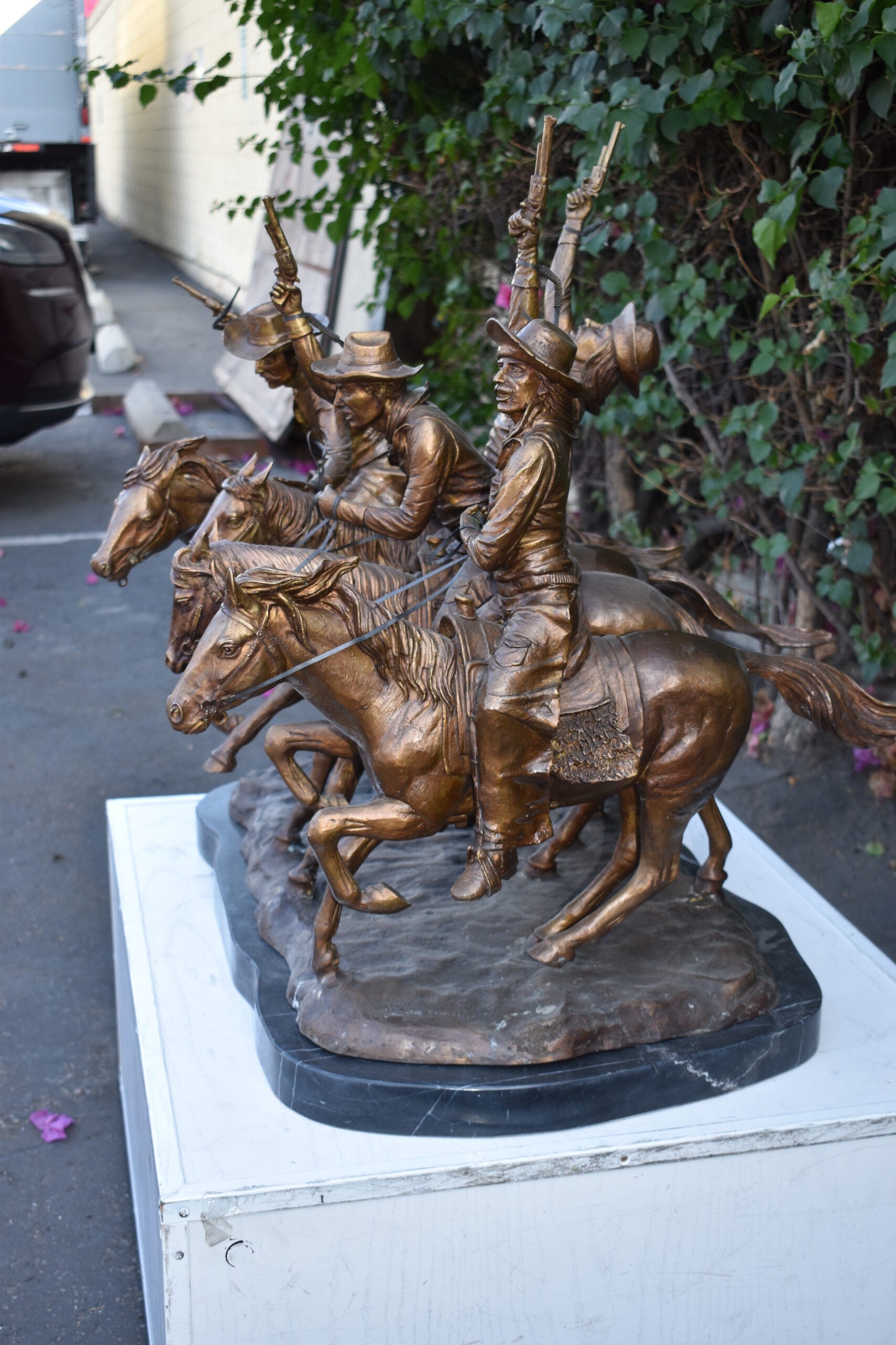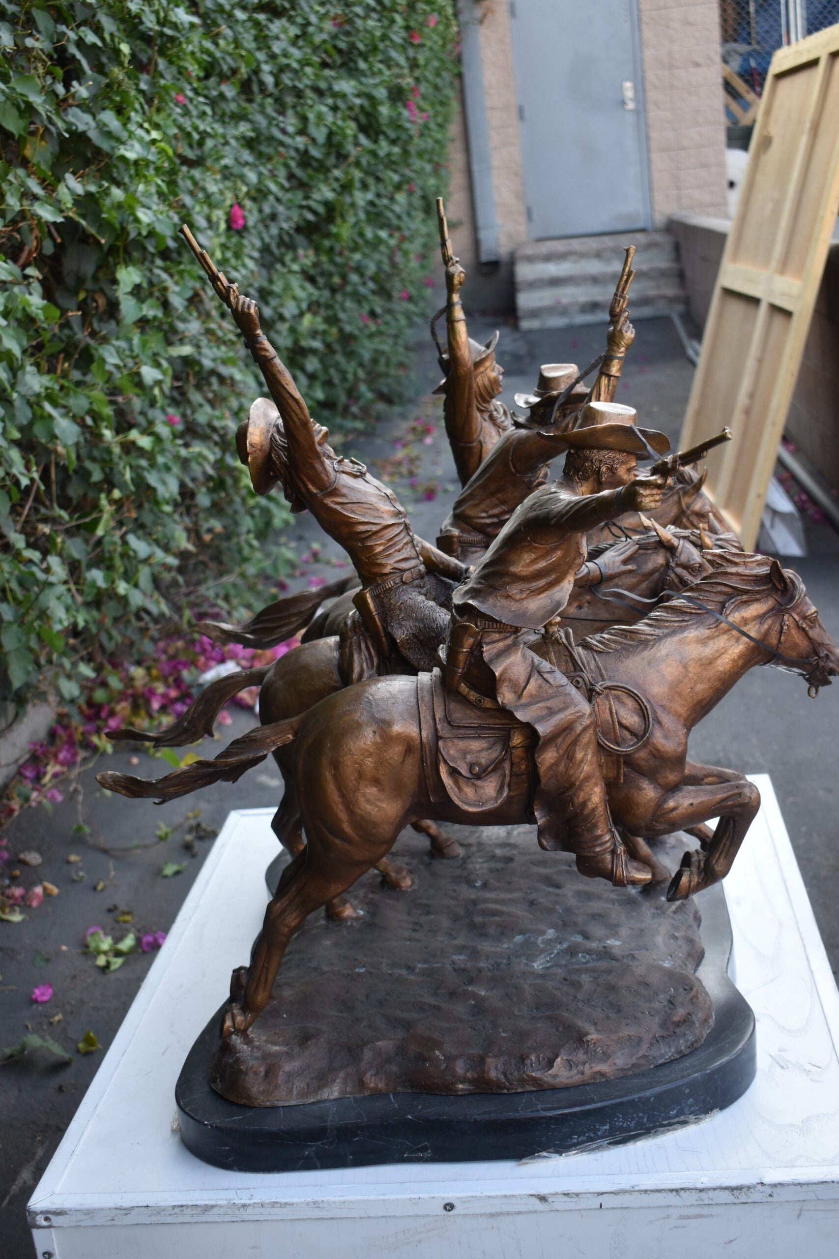 Pure Bronze sculpture Statue mounted on a marble base, Coming Through the Rye by Frederic Remington replica. The statue depicts four mounted cowboys, pistols raised aloft, keep a steady pace in a tight, boisterous group. The “Coming Through The Rye” is Frederic Remington’s most popular bronze statue, cast in the lost-wax technique, sharply delineated with a rich variety of textures, from the fringed buckskin garment to the animal’s hairy coat to the rocklike base. Size: 38"L x 27"W x 31"H. Weight is: 270Lb