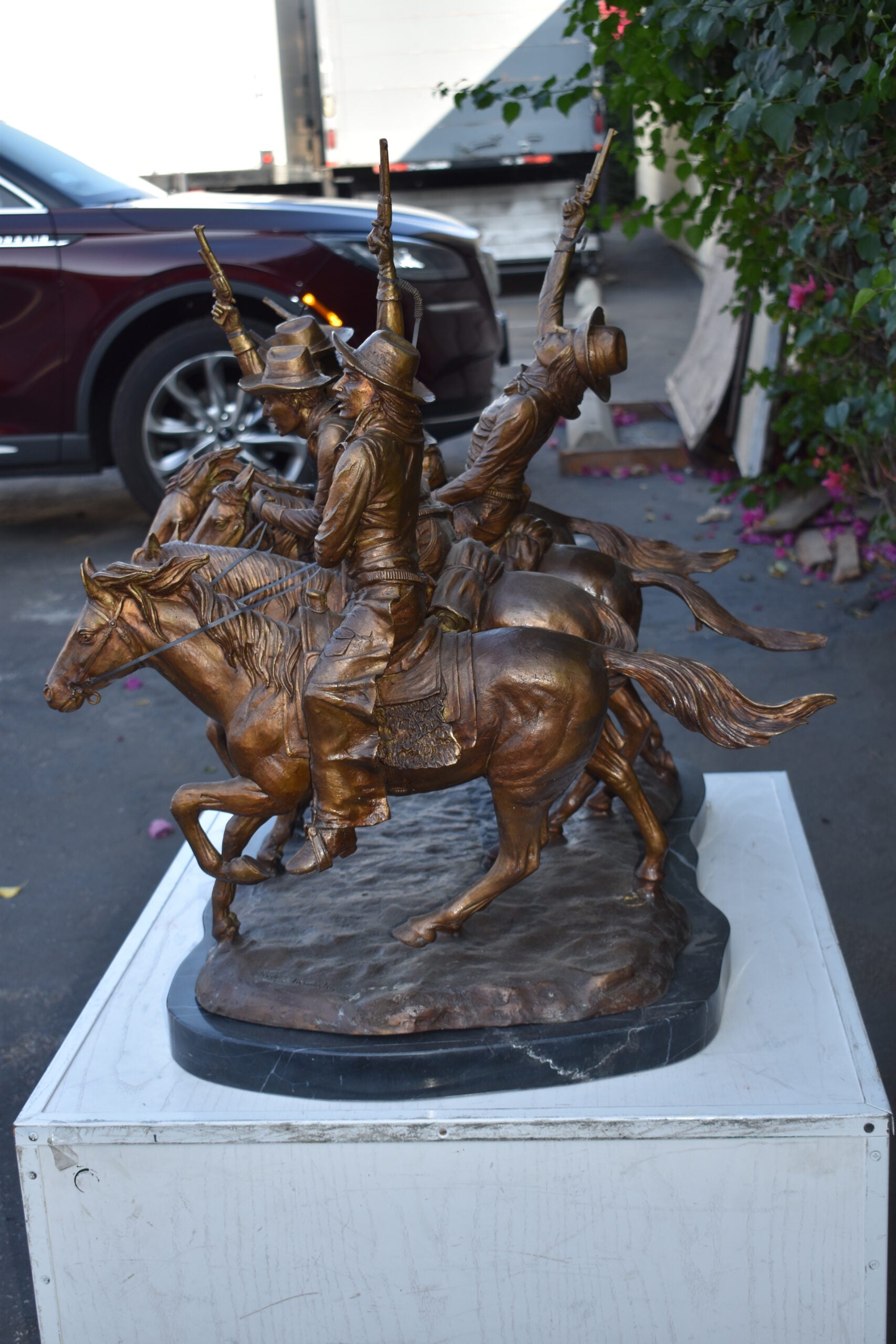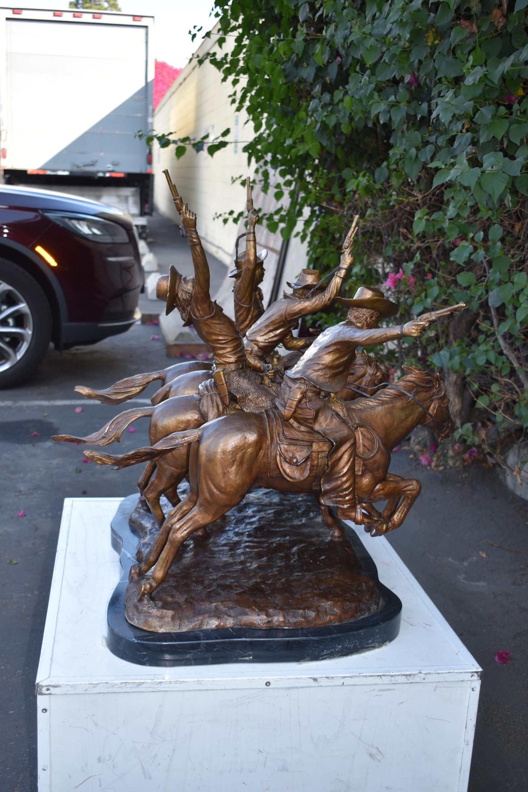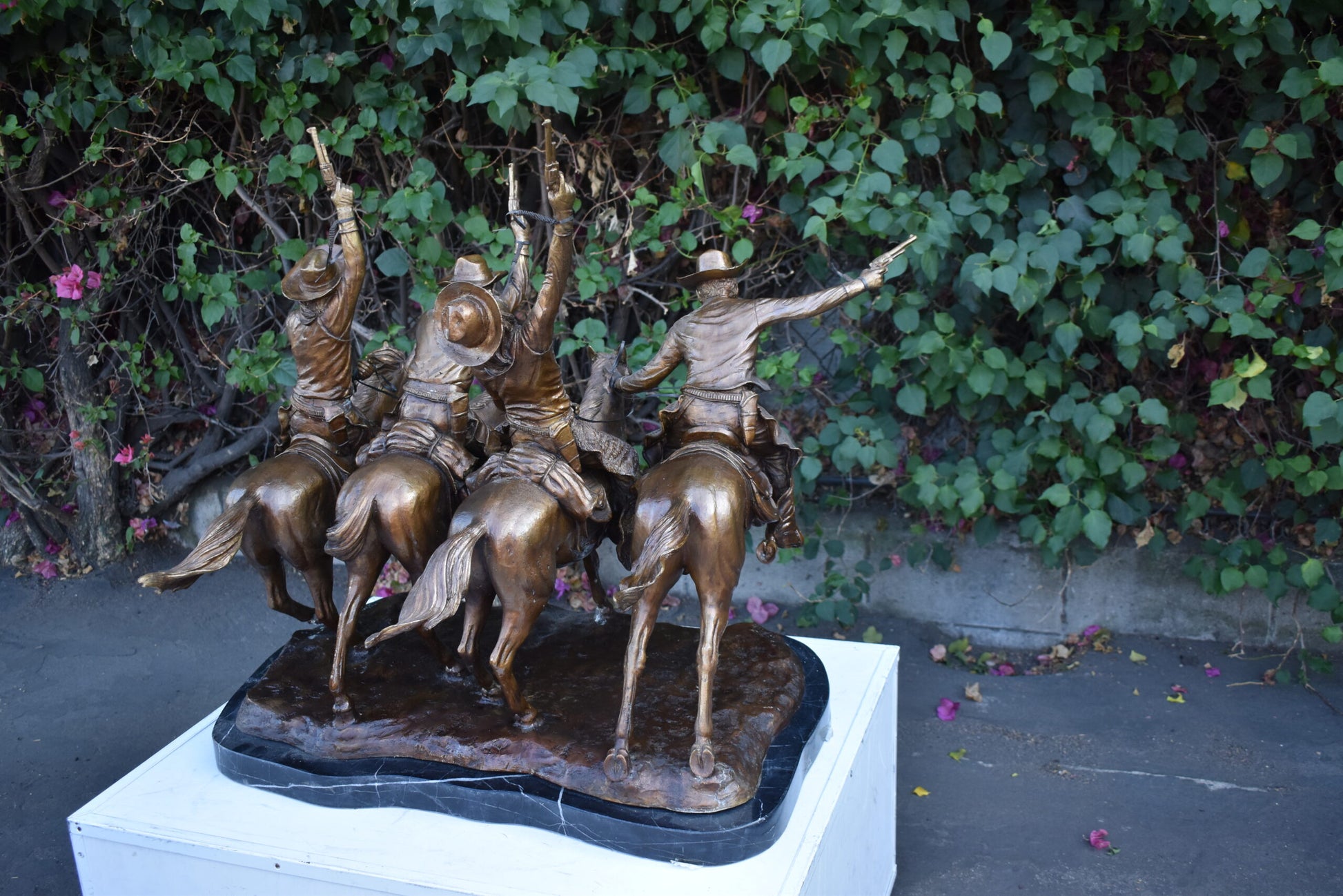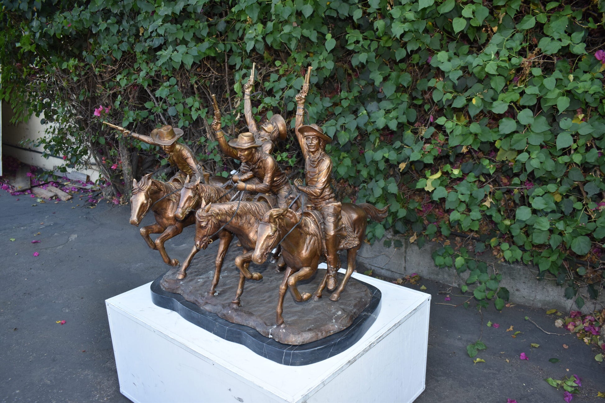 Pure Bronze sculpture Statue mounted on a marble base, Coming Through the Rye by Frederic Remington replica. The statue depicts four mounted cowboys, pistols raised aloft, keep a steady pace in a tight, boisterous group. The “Coming Through The Rye” is Frederic Remington’s most popular bronze statue, cast in the lost-wax technique, sharply delineated with a rich variety of textures, from the fringed buckskin garment to the animal’s hairy coat to the rocklike base. Size: 38"L x 27"W x 31"H. Weight is: 270Lb