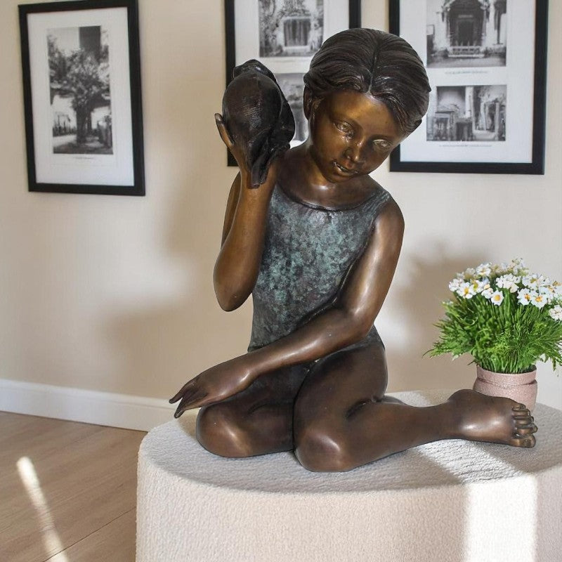 This delightfully amusing bronze sculpture of a girl listening to a sea shell on the beach. Every child remembers the first time they heard the wonderful 'Ocean Sounds' from a sea shell. Size: 17"L x 10"W x 20"H. Weight is: 24Lb