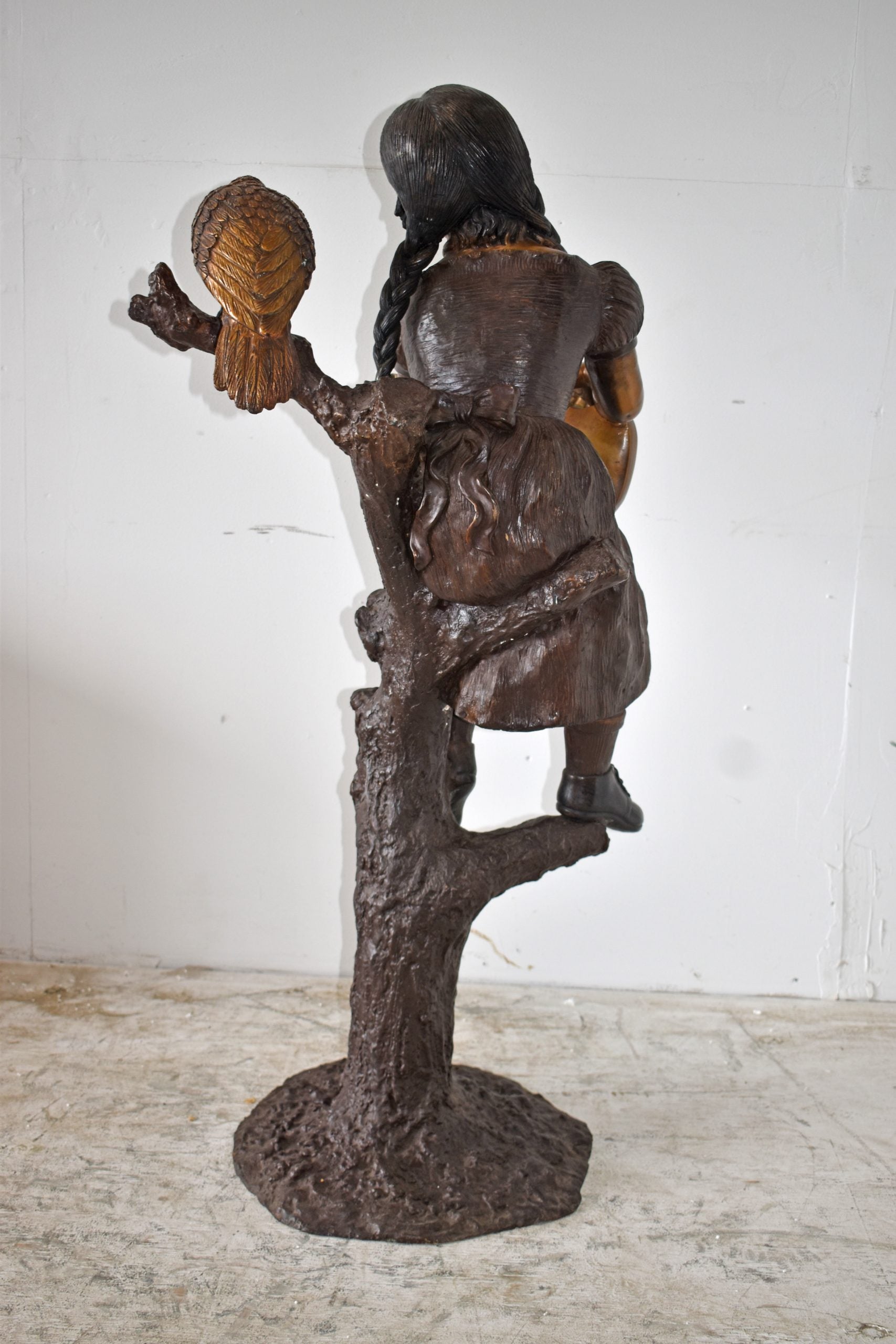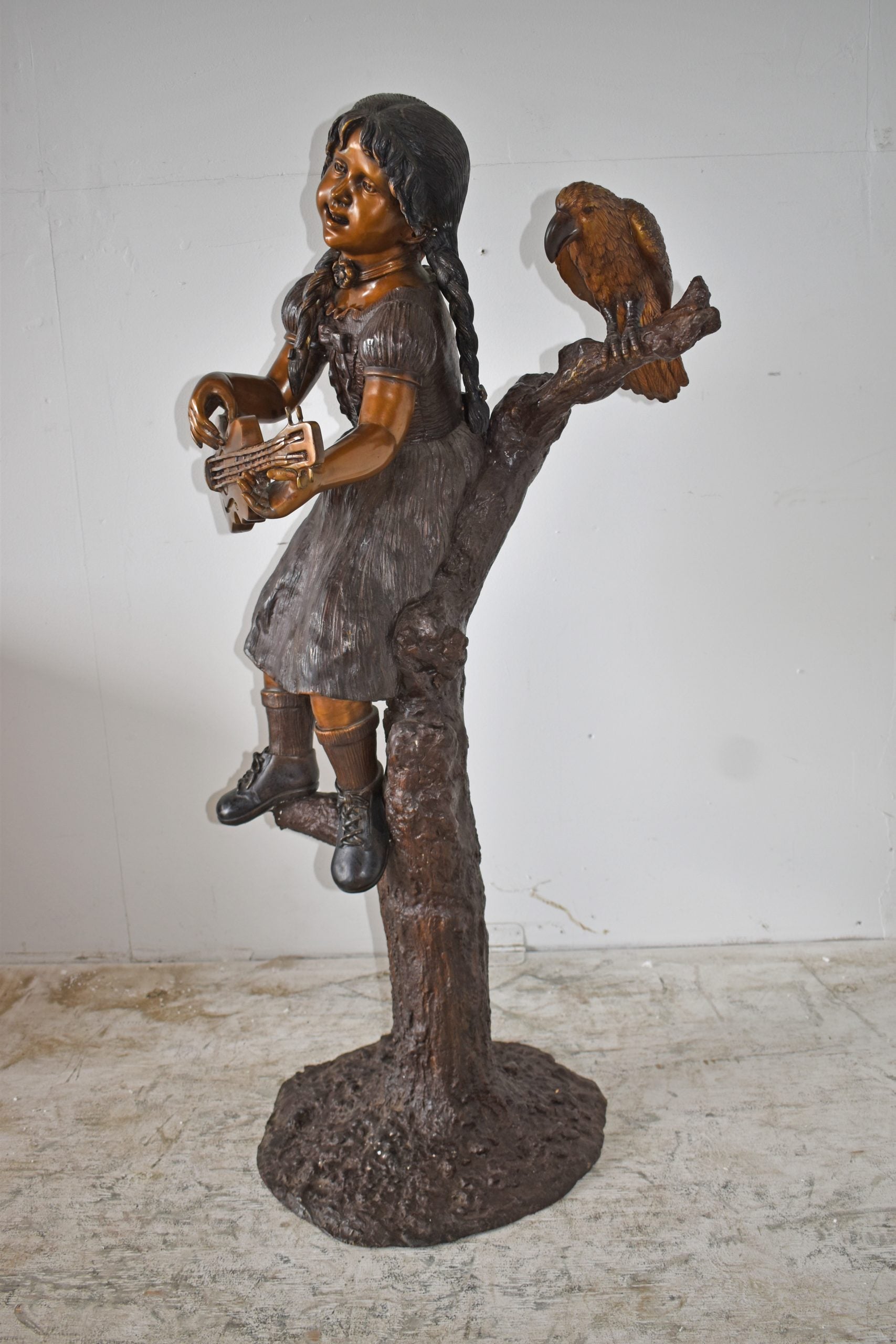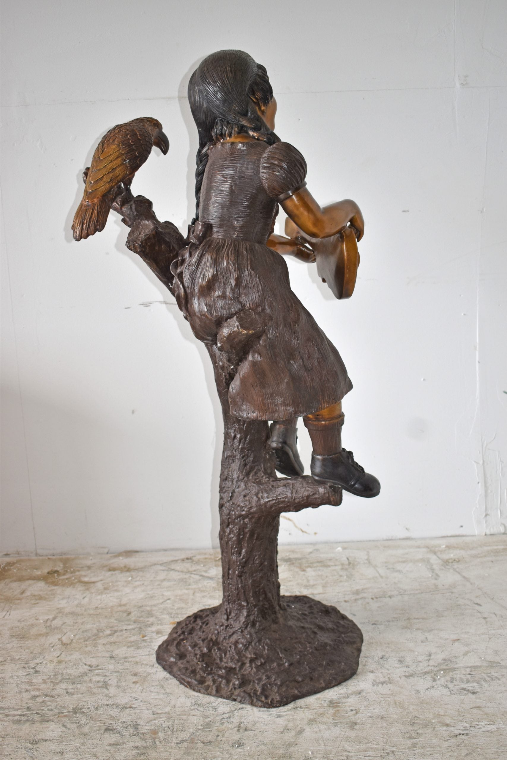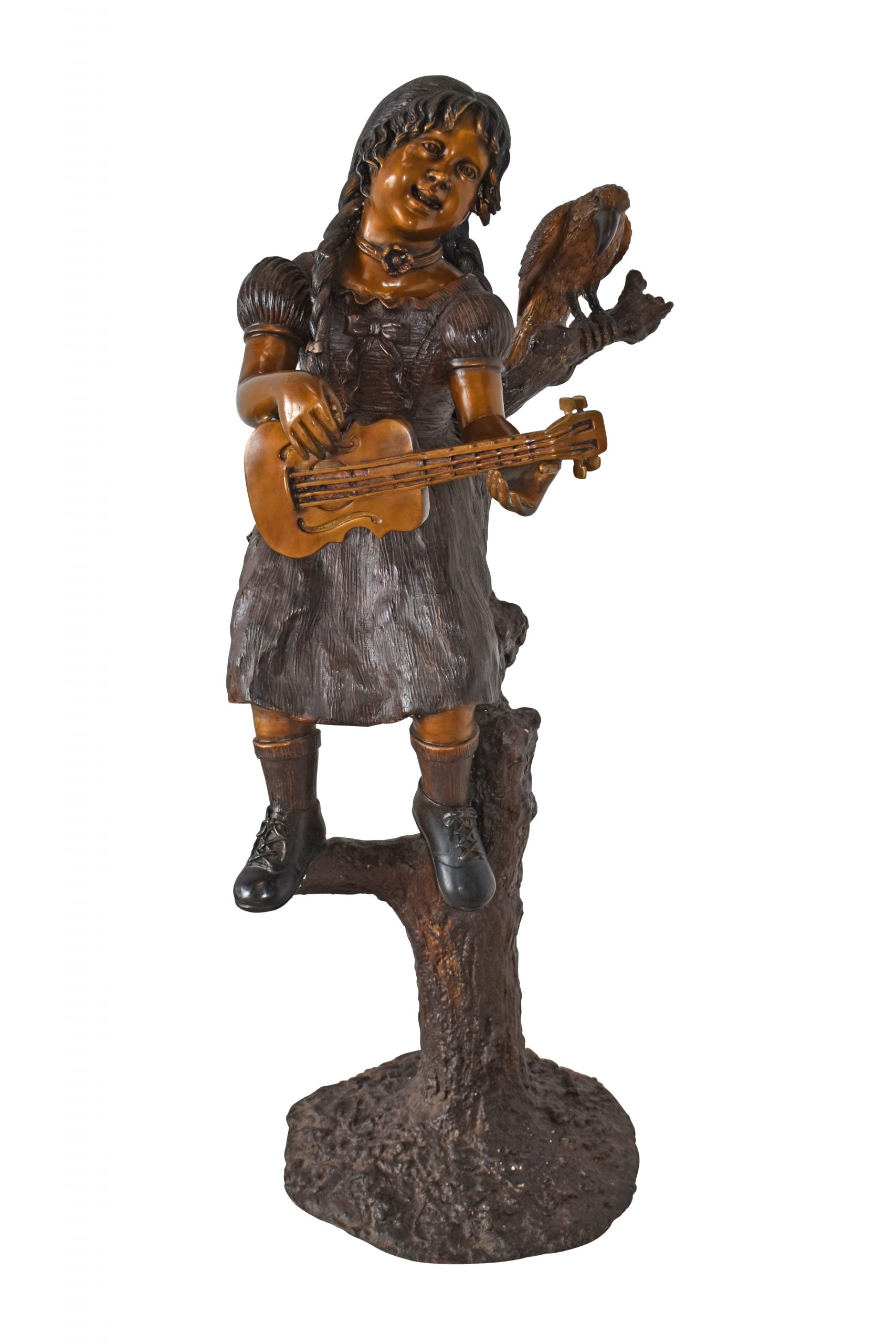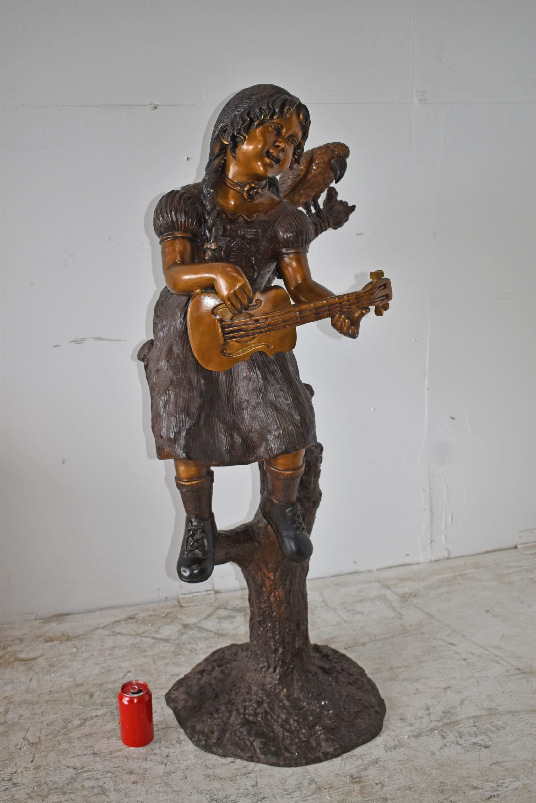 Girl on a Tree Playing the Ukulele with a Parrot Bronze Statue. This bronze statue, characterized by the youthfulness of the child as she plays the music next to the parrot. The statue is a scene well captured in a museum quality, hand-cast bronze using the Lost Wax Process of bronze casting. This statue would look beautiful in the home of a family or those who love the music and nature Size: 25"L x 23"W x 50"H. Weight is: 86Lb