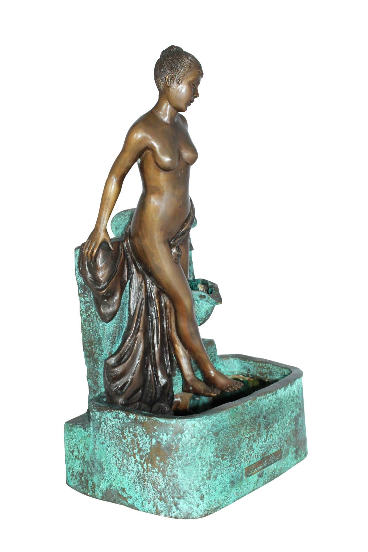Sculpted beautiful naked Female standing over a water fountain bronze Sculpture. This sculpture is a finely crafted, highly detailed work of art. You will be very pleased with the quality of this amazing female sculpture. This bronze sculpture was cast using the lost Wax Method. This beautiful large bronze-cast statue will be a valuable addition to any area of the home, office, patio, or garden. Size: 12"L x 9"W x 21"H. Weight is: 40Lb