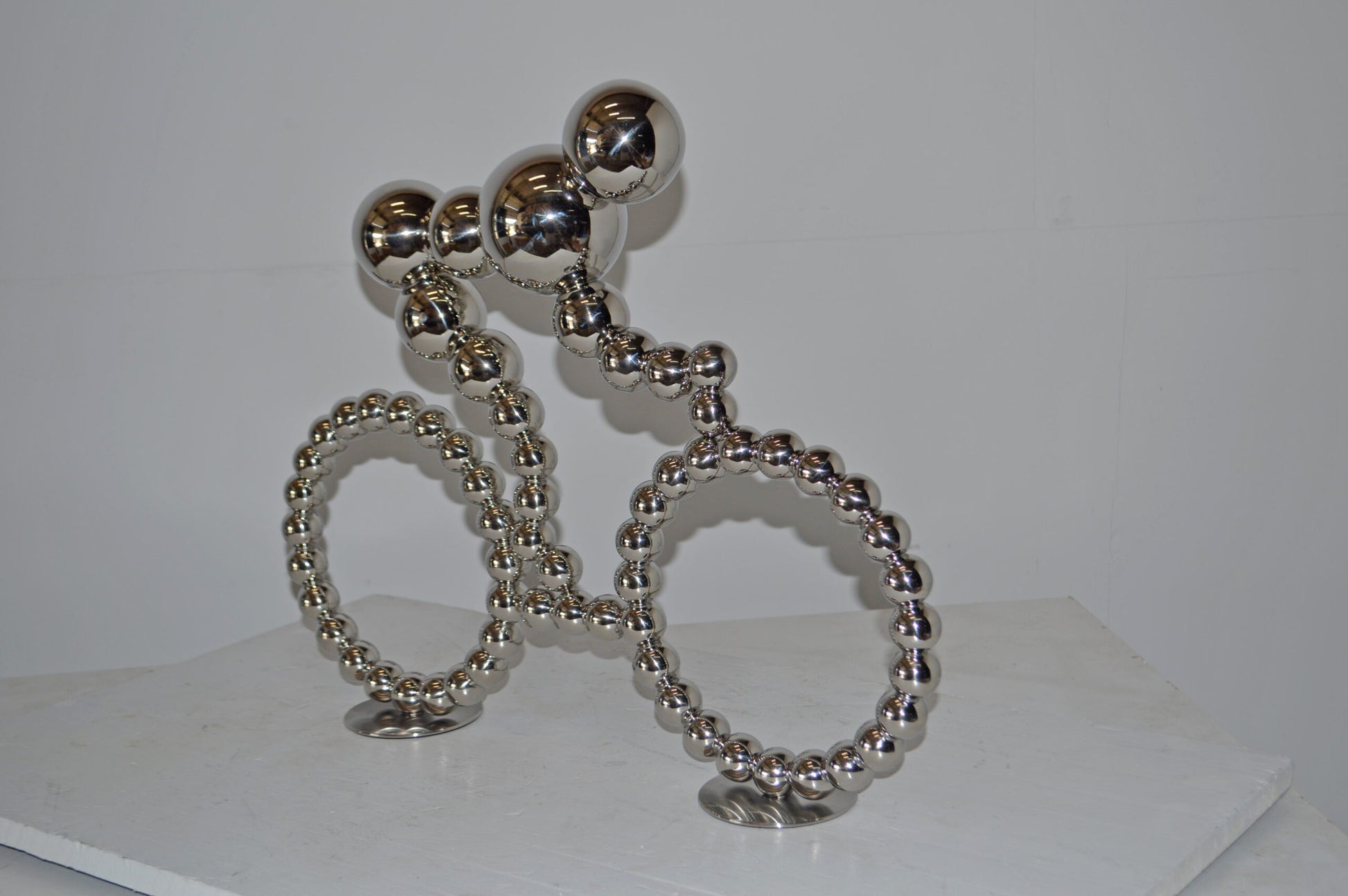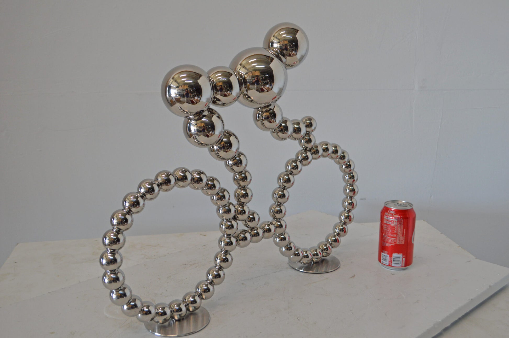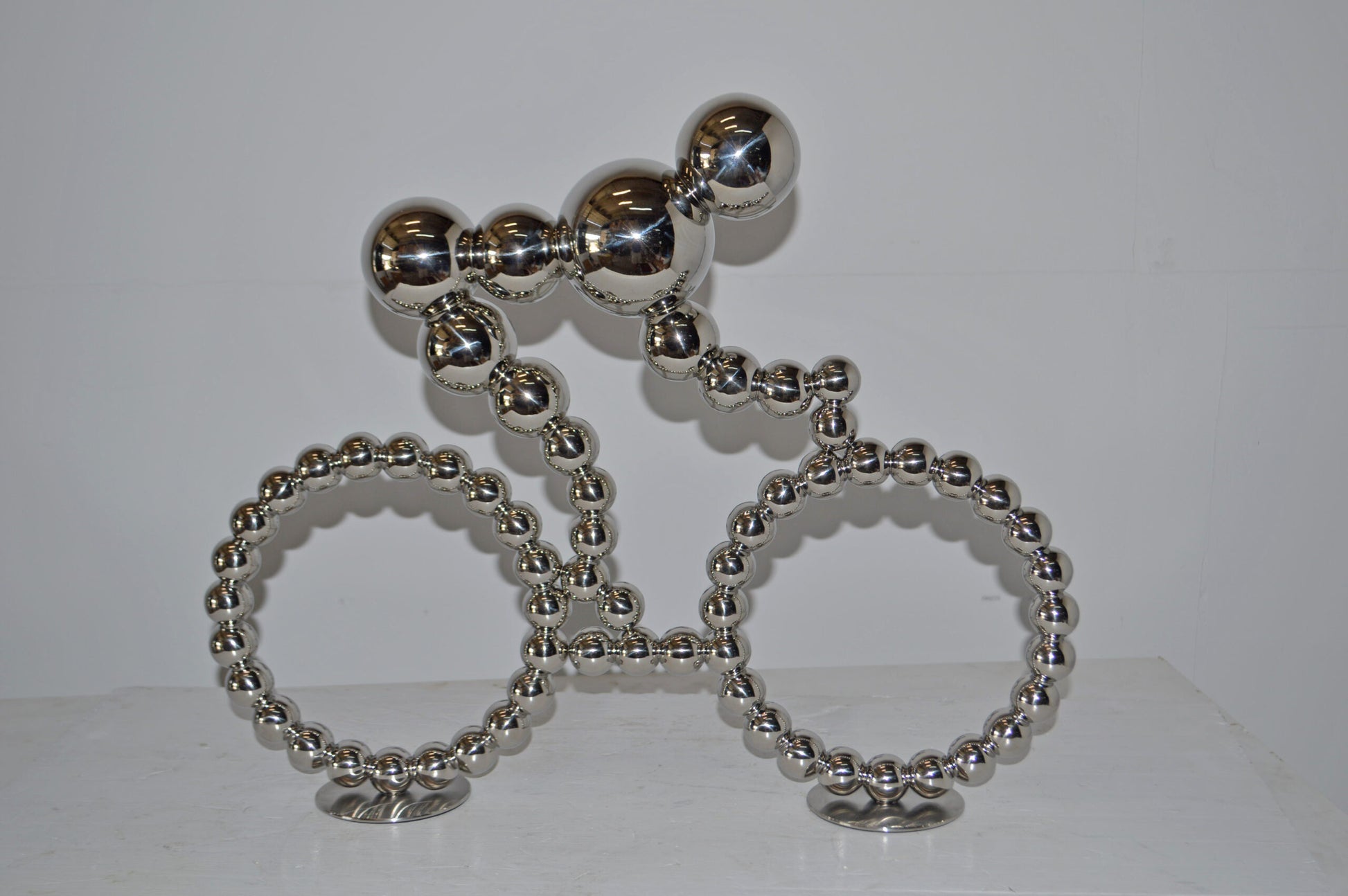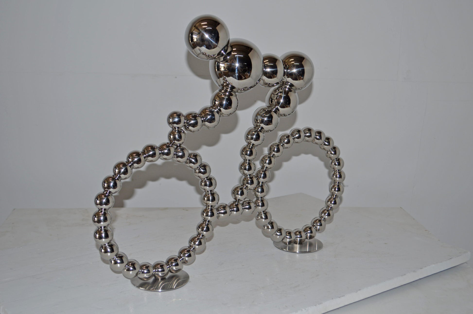 Decorate your home with this beautiful, tabletop, modern looking, stainless-steel abstract of a rider on his bike. These decorative abstracts made of Stainless-steel balls will become an extraordinary focal point to any kitchen, Livingroom, or patio! We sell a whole line of this style of modern art. You can be sure they will be a conversation starter and the topic of much appraised comments in your home. Size: 22"L x 4"W x 17"H. Weight is: 2Lb