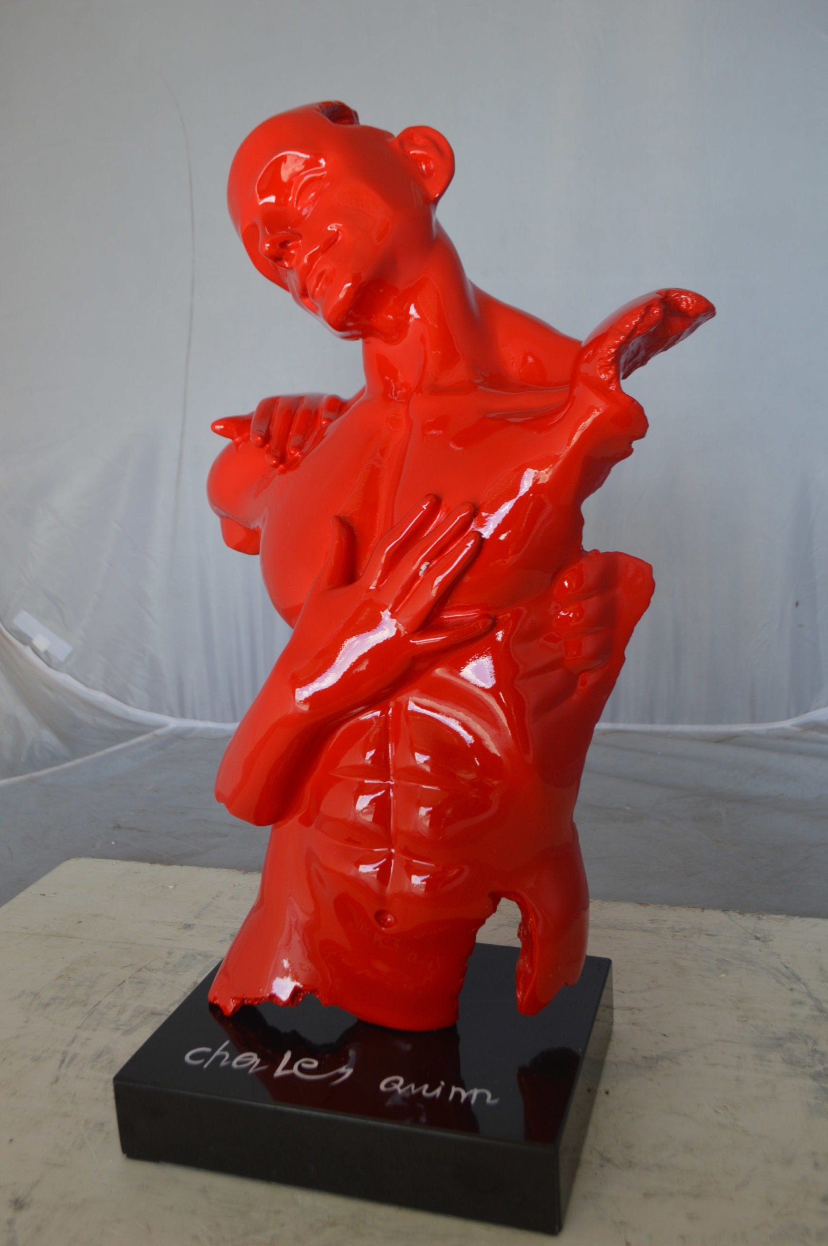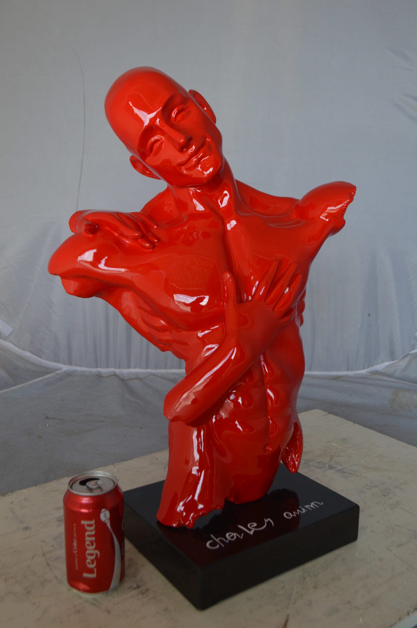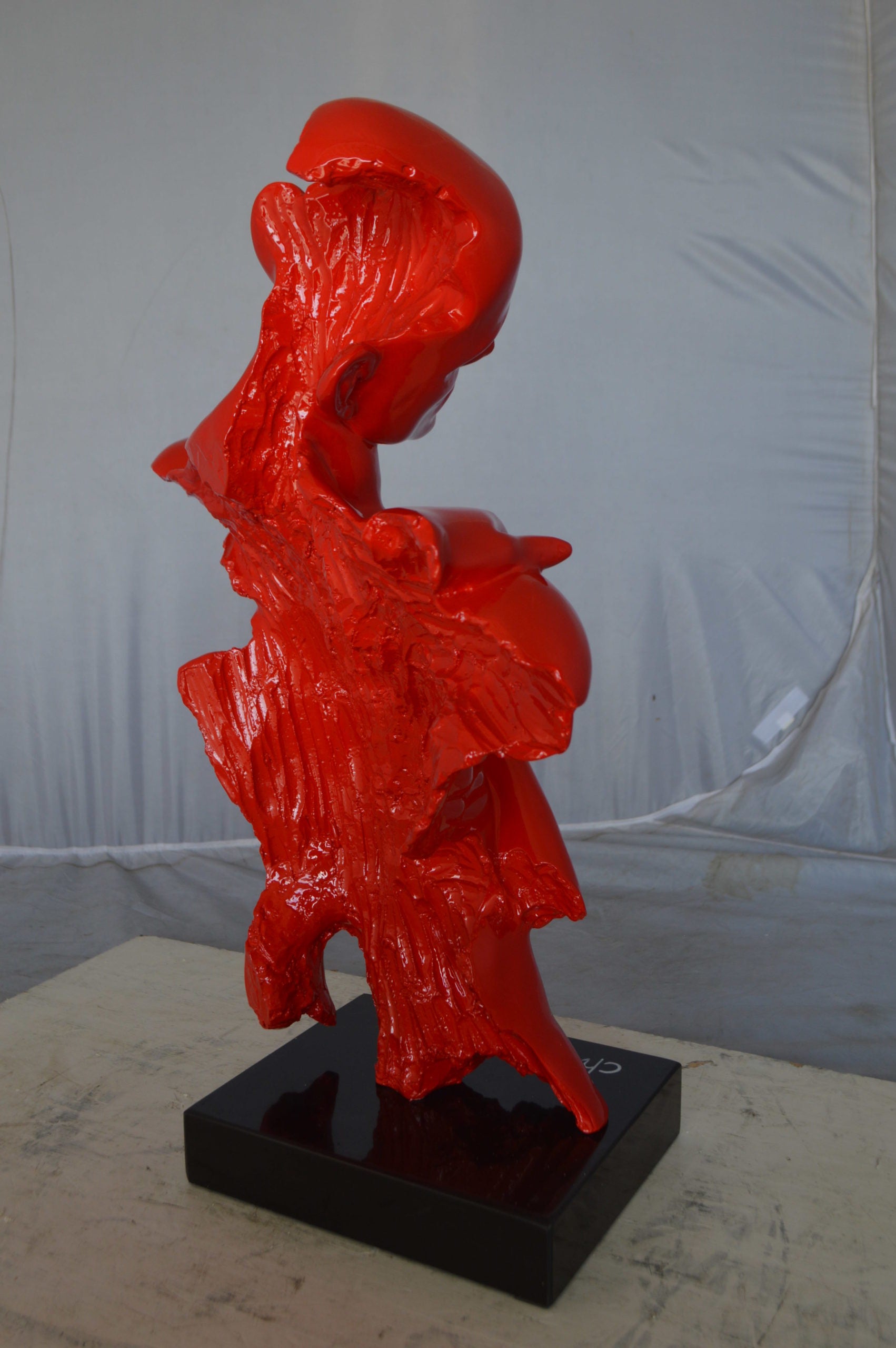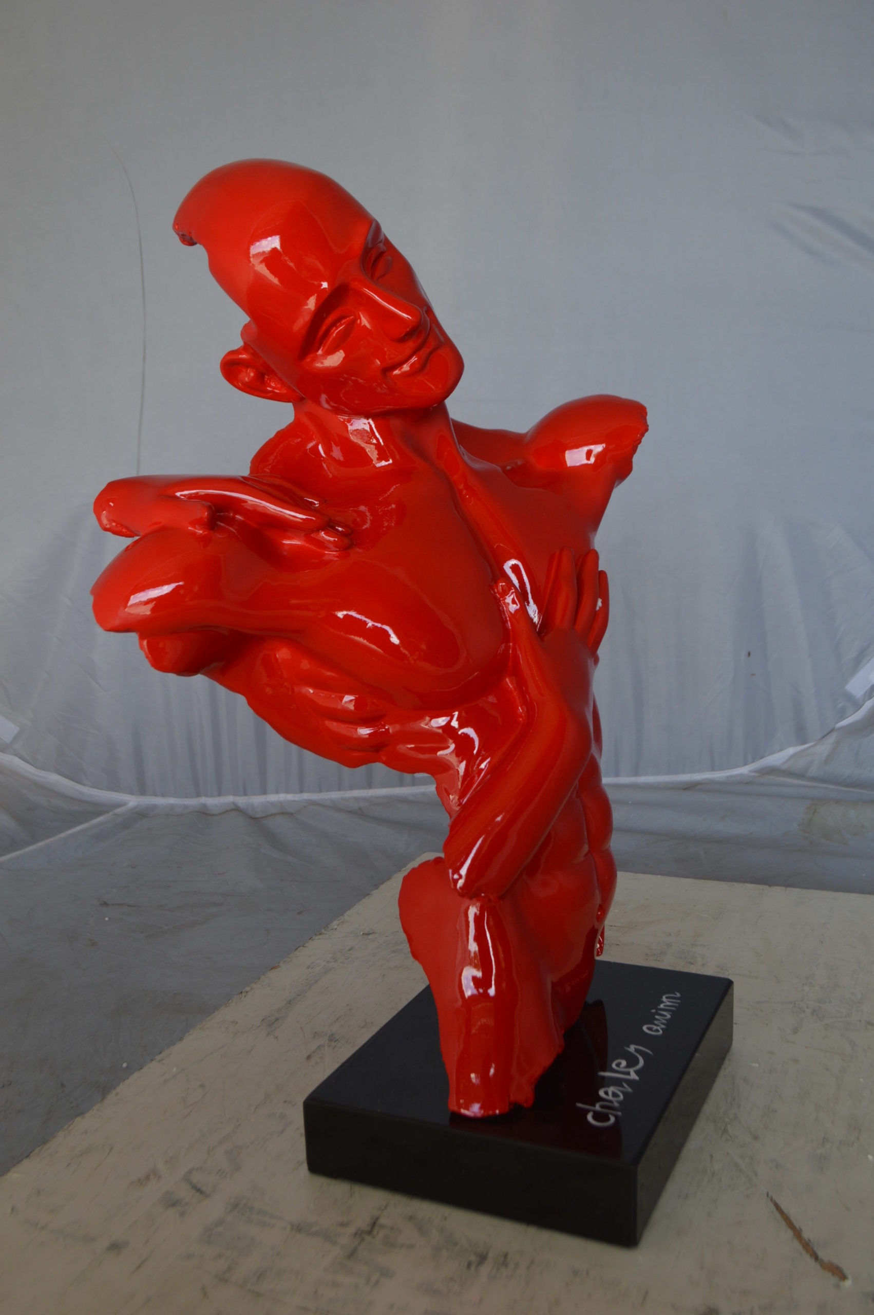 This modern-style red resin statue is an extremely artistic piece signifying the bust of the man with arms surrounding him. This sculpture connotes an abstract expression based in reality. This beautiful work of art is a wonderful fit for any art enthusiast and would work wonderfully in any home or office. Many customers choose to purchase the Modern resin statue of a woman hugged by a men in addition, creating a set of sculptures to add to your space. Size: 17"L x 8"W x 24"H. Weight is: 10Lb