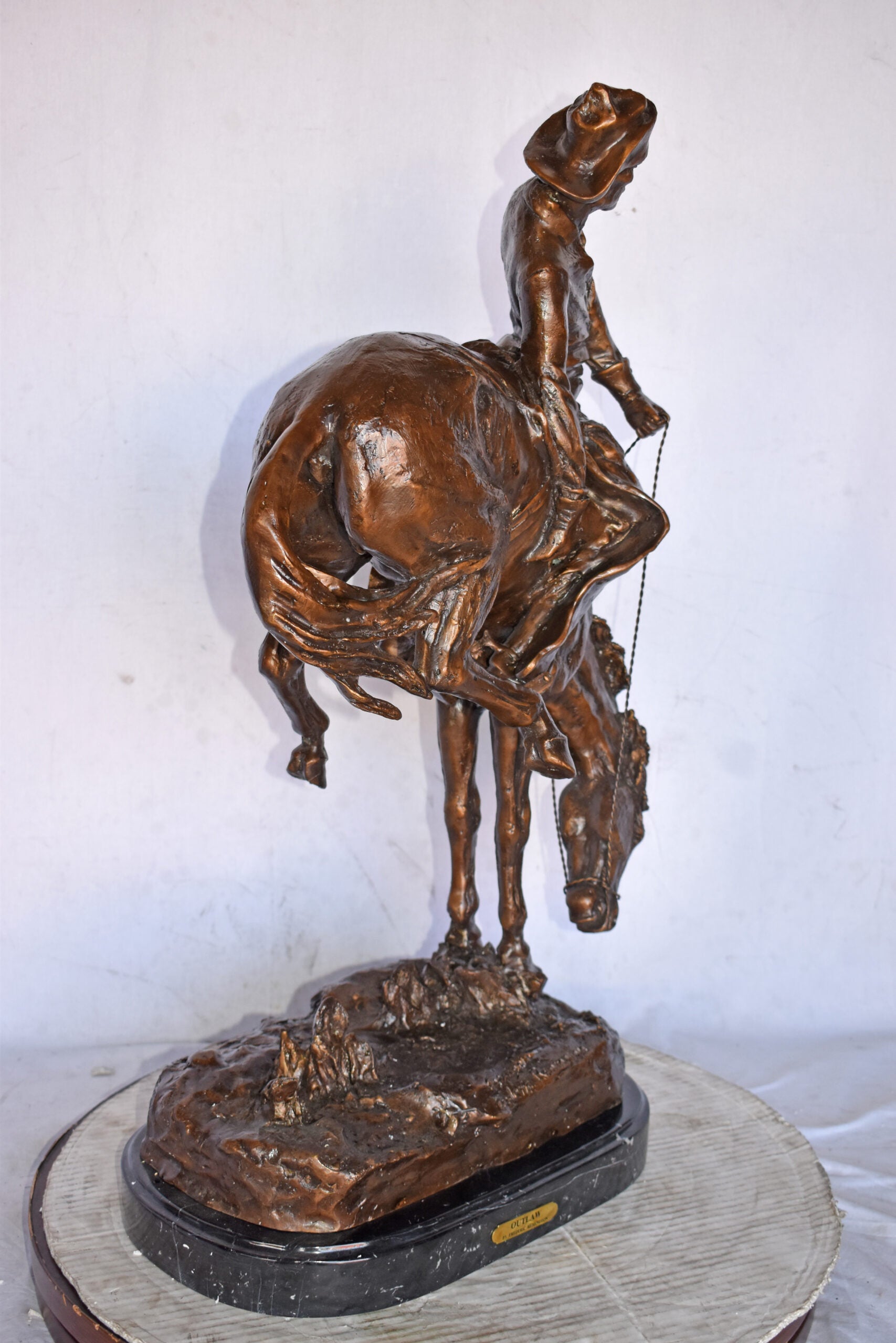 With just 15 original casts produced during Remington's lifetime, The Outlaw No. 5 reflects the artist obsessive attention to detail and fervent passion for the American cowboy. Here a cowboy breaks in a newly saddled horse that is bucking in resistance. The weight of the group is borne on the horse left front hoof, which is entangled with sagebrush. This replica is made in the traditional Lost Wax Process with magnificent patina finish which has great movement and detail and will certainly add another perspective of the American history to your home. Size: 18"L x 10"W x 32"H. Weight is: 70Lb