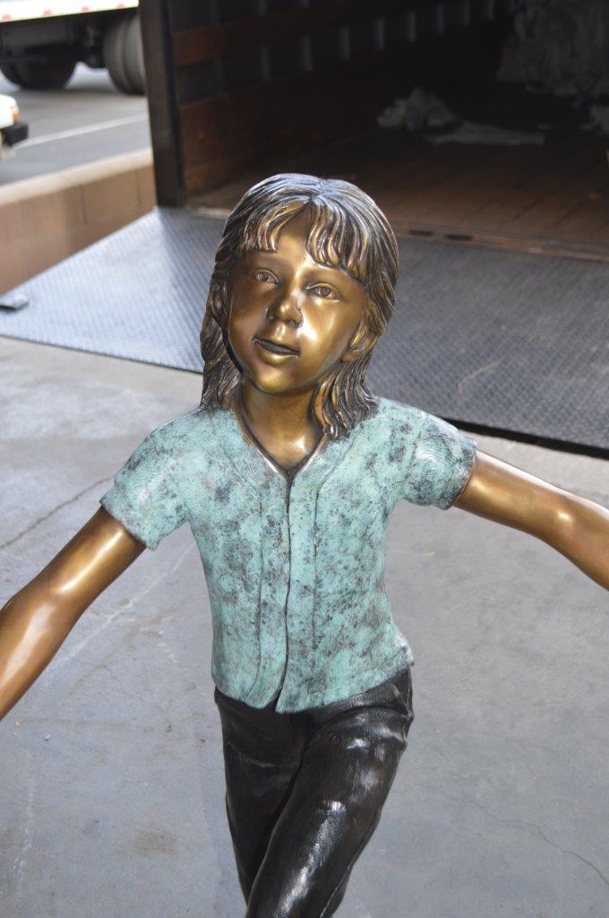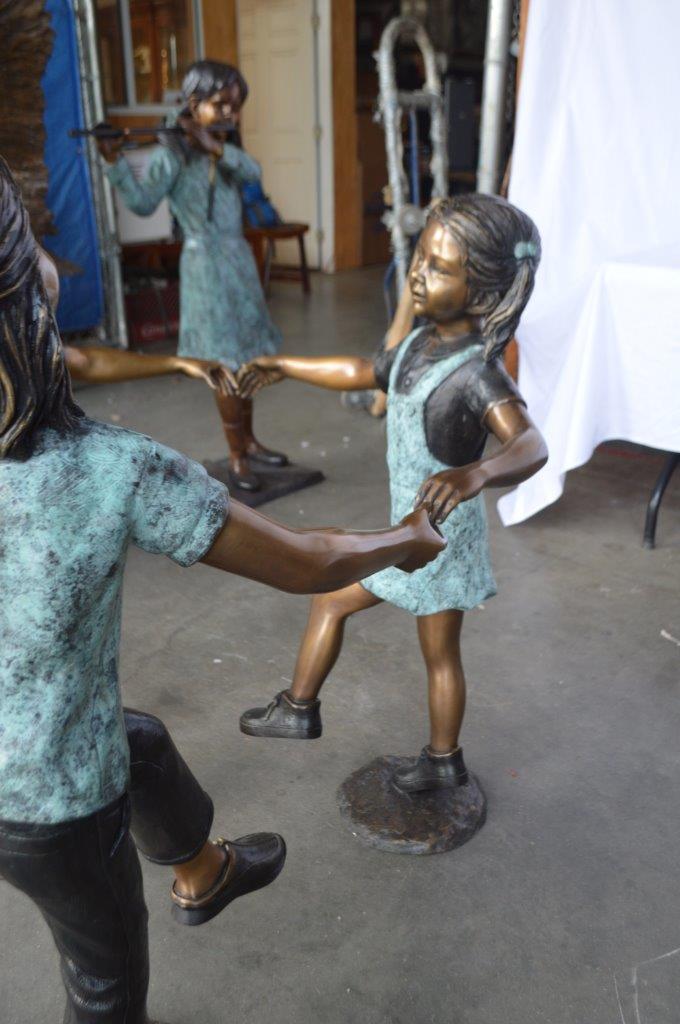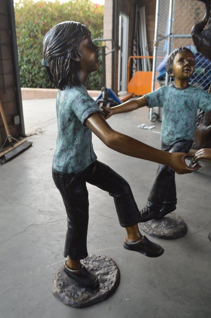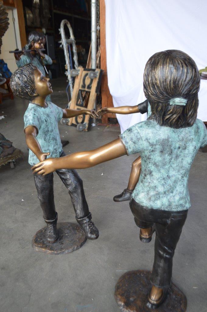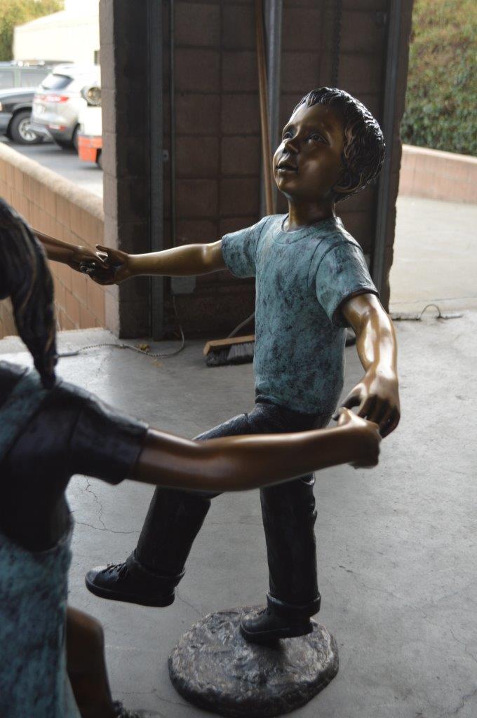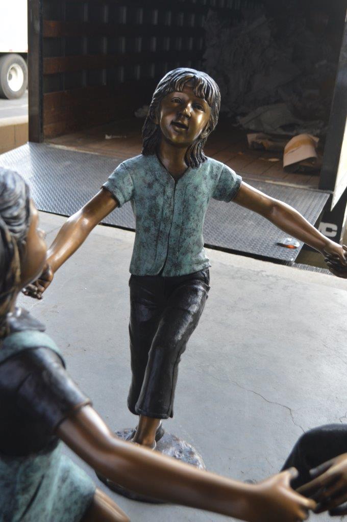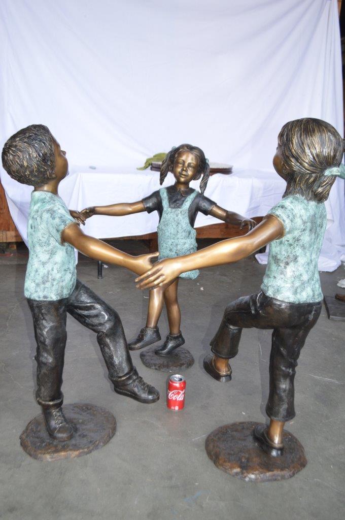 These three children (sold as a set) are holding hands with one another, having fun. This is a life-size bronze statue, characterized by the youthfulness of the children as they look at one another. This is a gorgeous scene straight of a novel, and is a beautiful bronze sculpture. The statues are a scene well captured in a museum quality, hand-cast bronze using the Lost Wax Process of bronze casting. Size: 31"L x 19"W x 41"H. Weight is: 41Lb