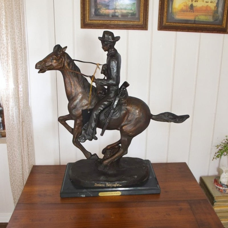 Nifao Trooper of the Plains Bronze Statue by Remington - Cowboy Sculpture on Marble Base, 9"L x 22"W x 22"H