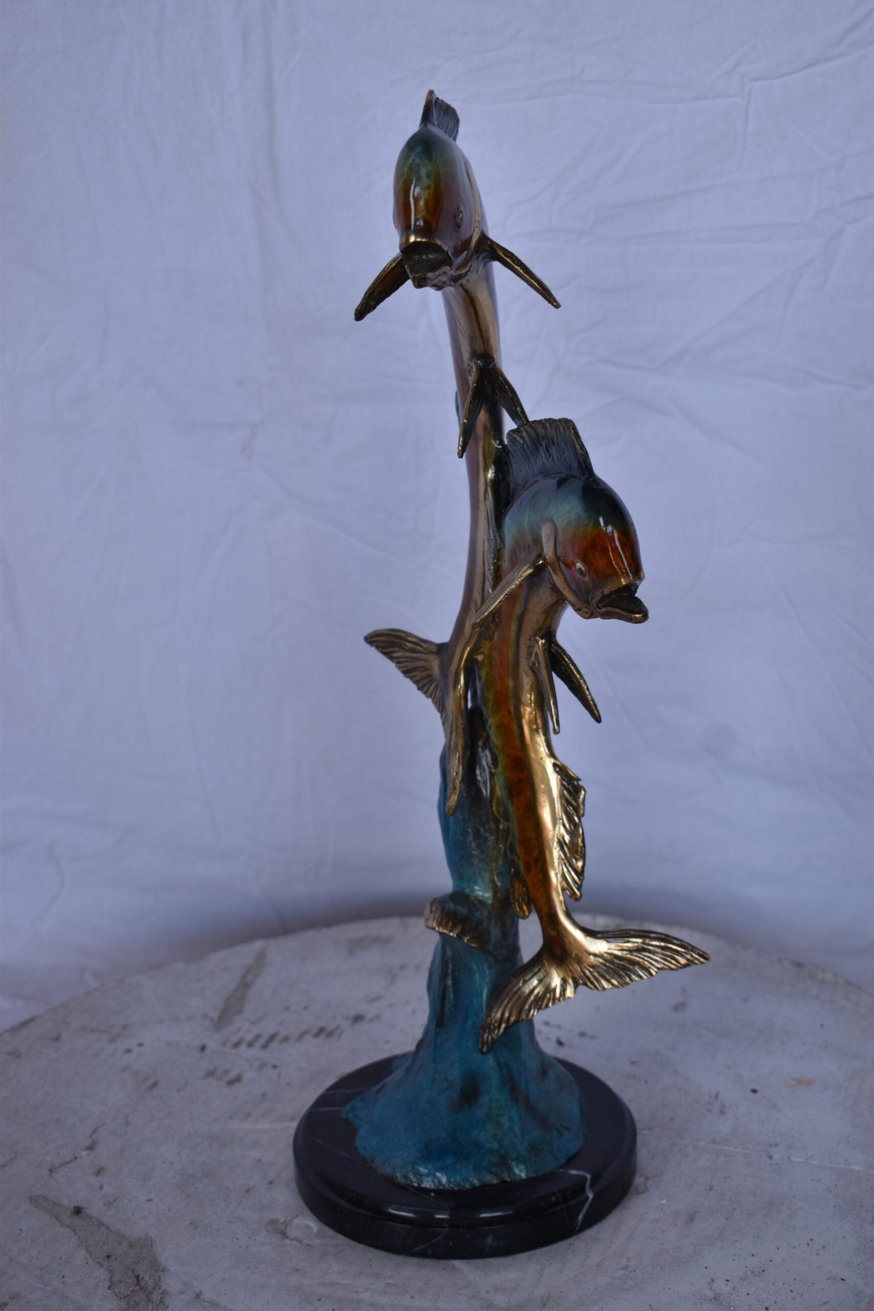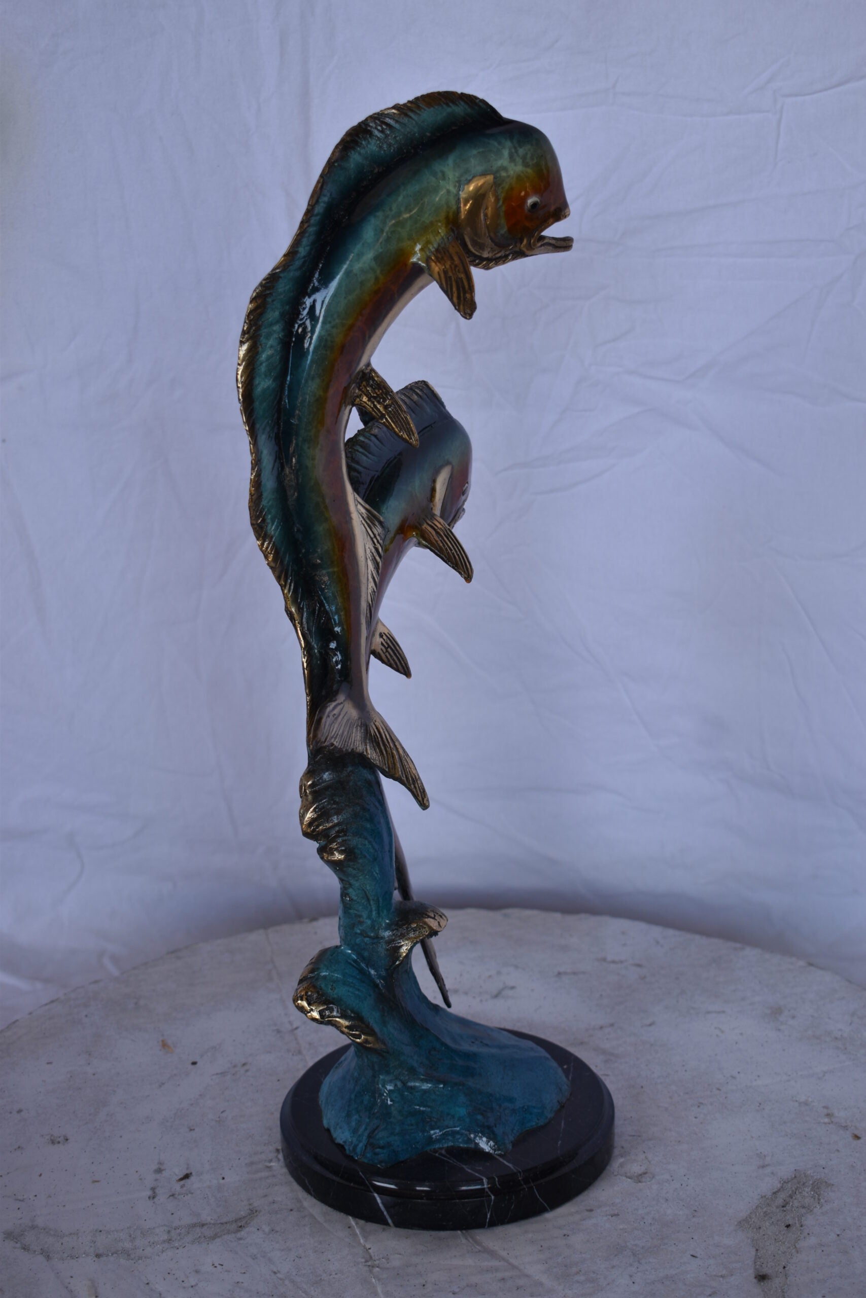 Two Dorado, Mahi Mahi Bronze Statue on Marble Base - Size: 9"L x 9"W x 22"H.