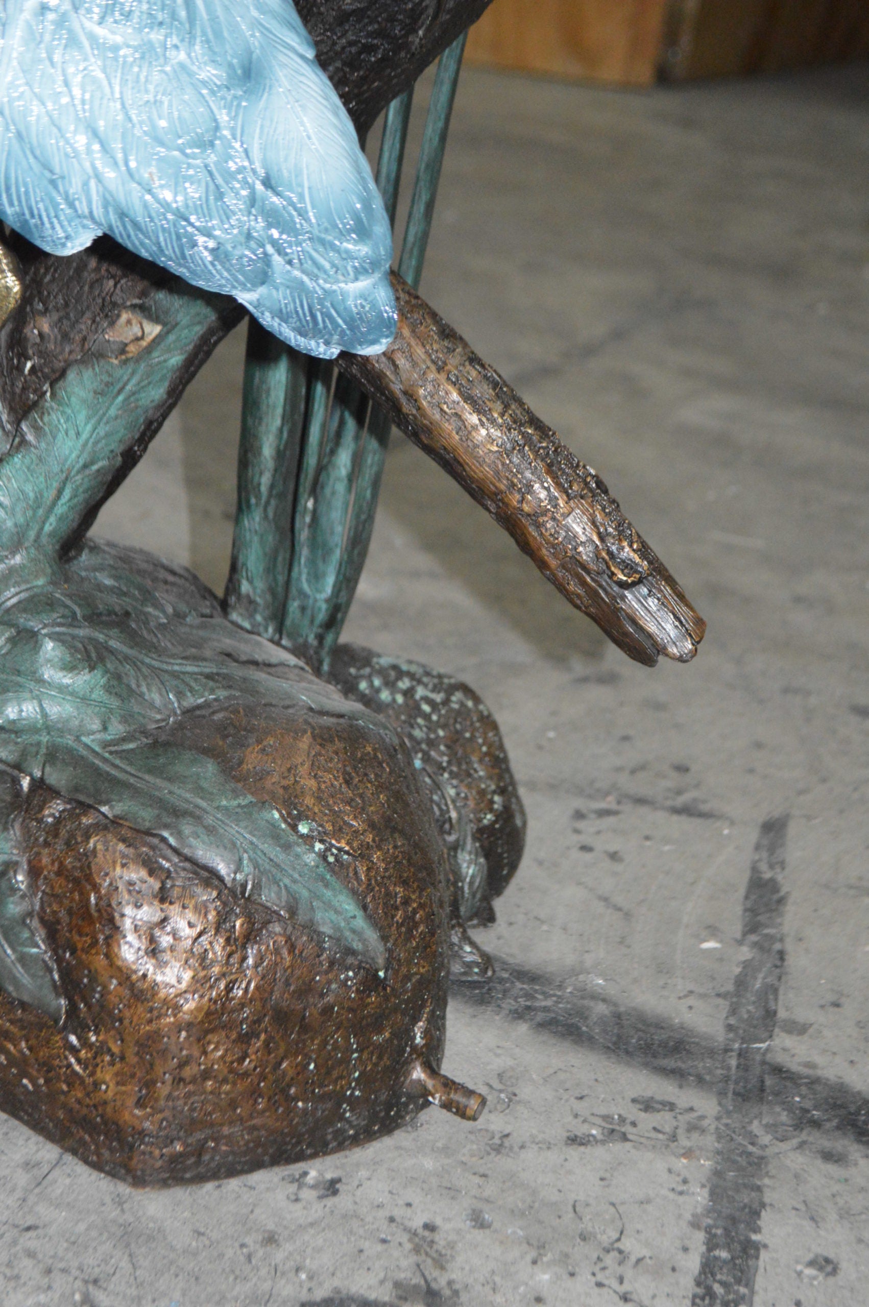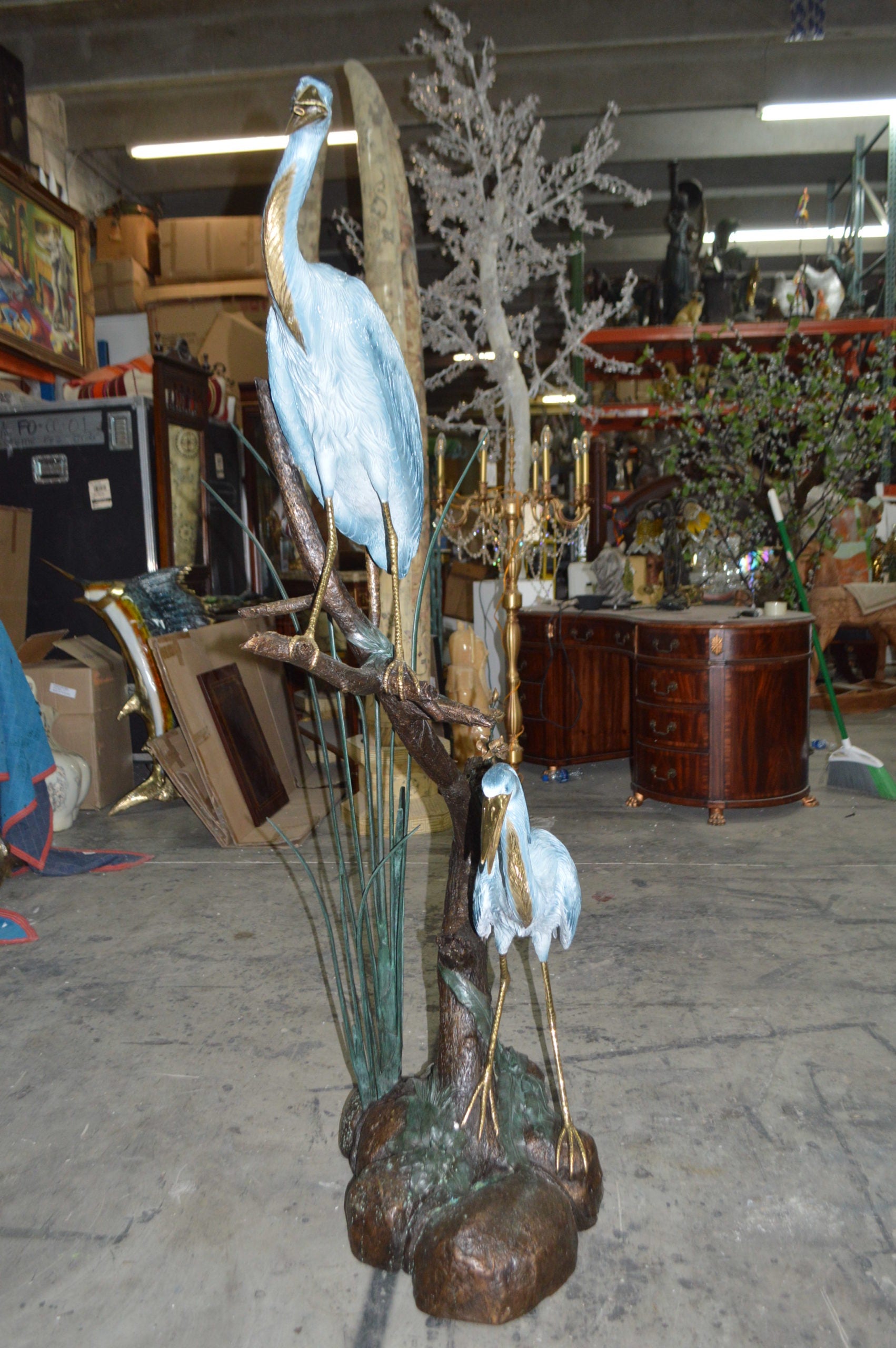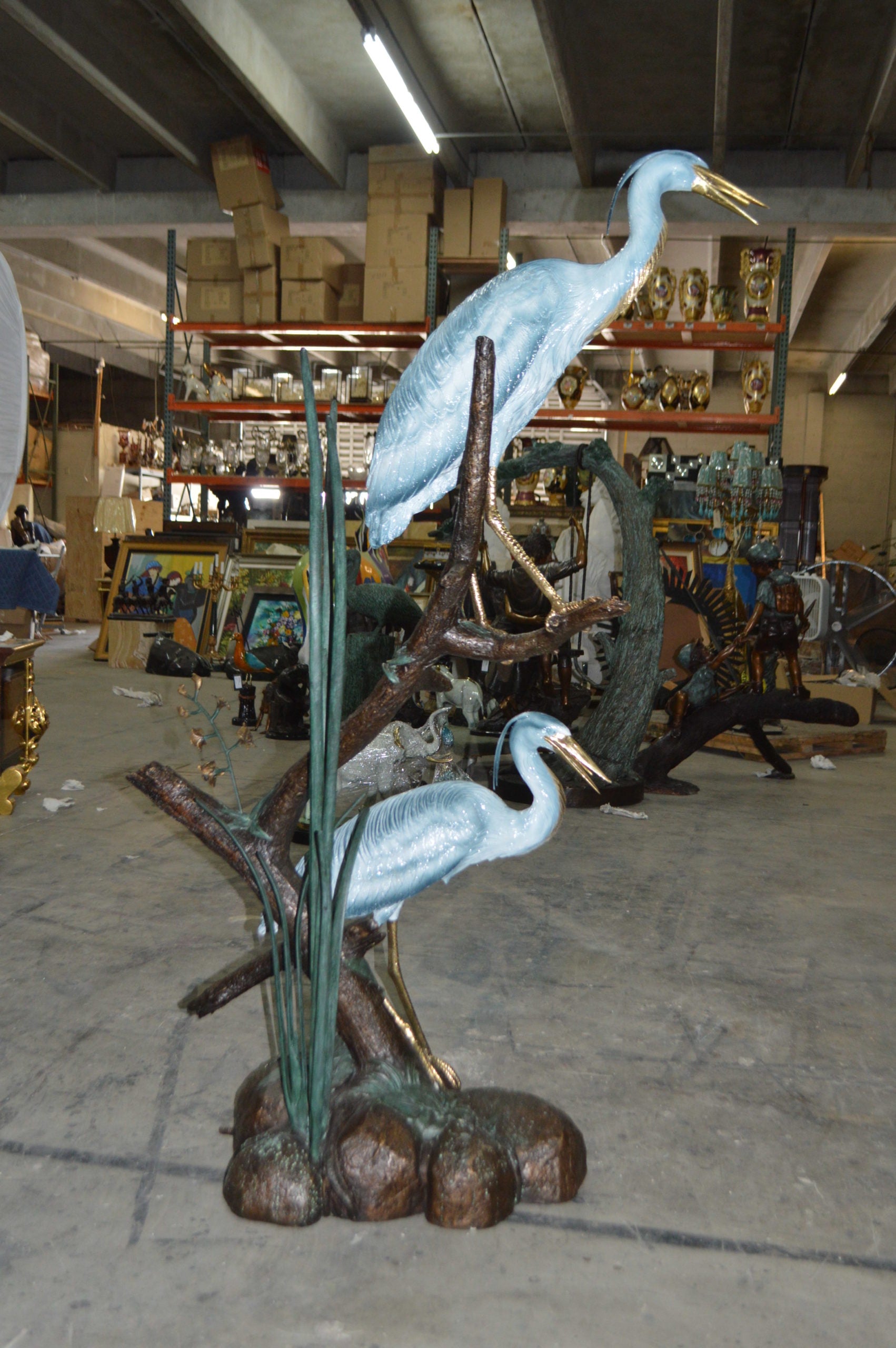 Surprise your garden guests with this large size outdoor/indoor Bronze fountain Statue of Three herons standing on a tree stump. Each one of the herons is equipped with a hose that sprays water out of their mouth, with the use of a fountain pump (pump is not included). Produced using superior quality bronze and a traditional casting method that yields pristine details. . The patina chosen for this Timeless Creation is stained in green and brown patina finish for preservation, 100% handmade and 100% bronze. This impressive Bronze Statue will be a permanent fixture on the grounds of your estate for years to come. Size: 36"L x 21"W x 64"H. Weight is: 99Lb