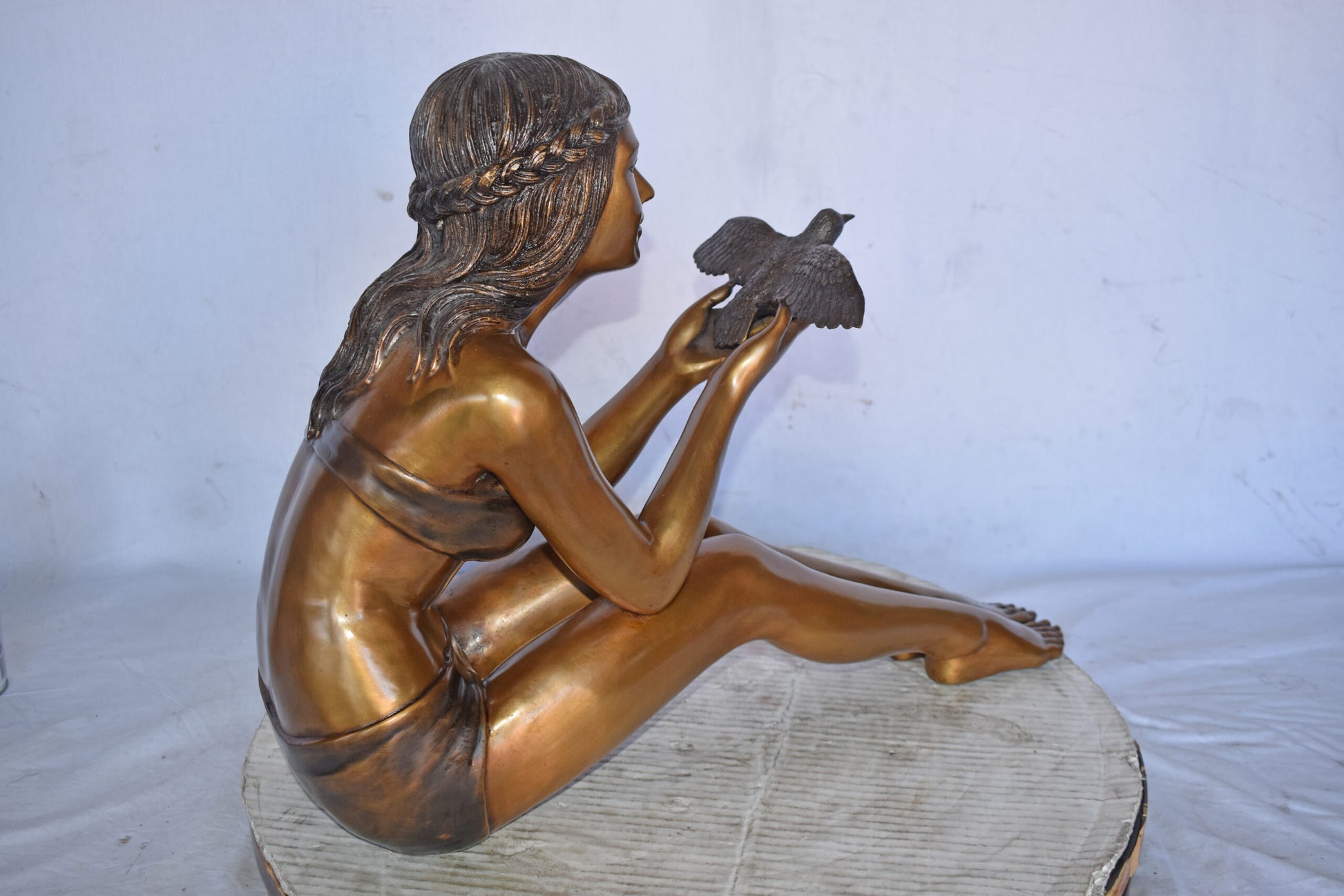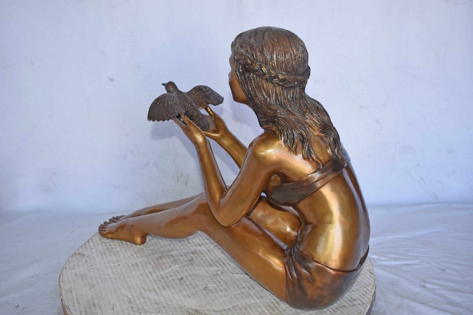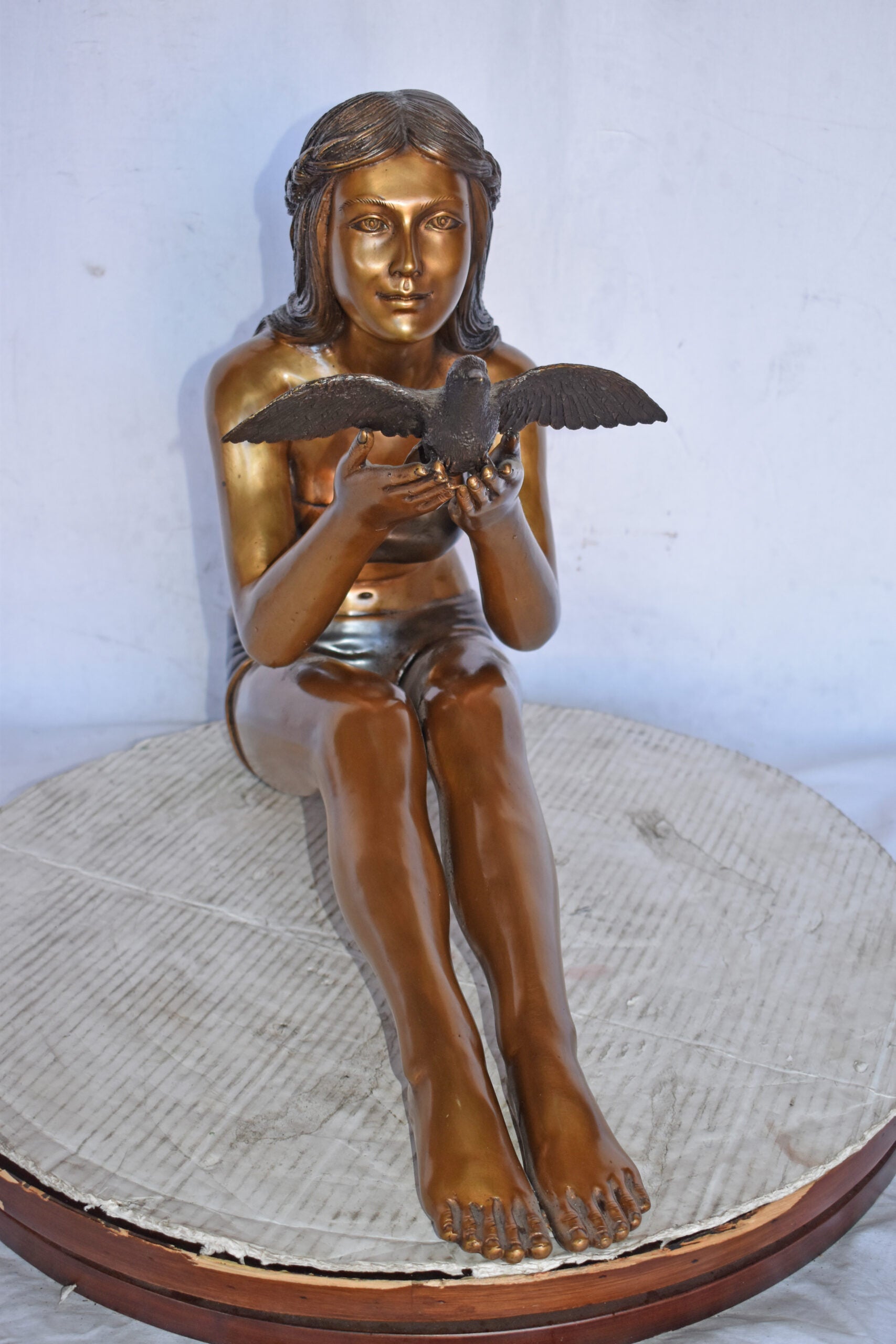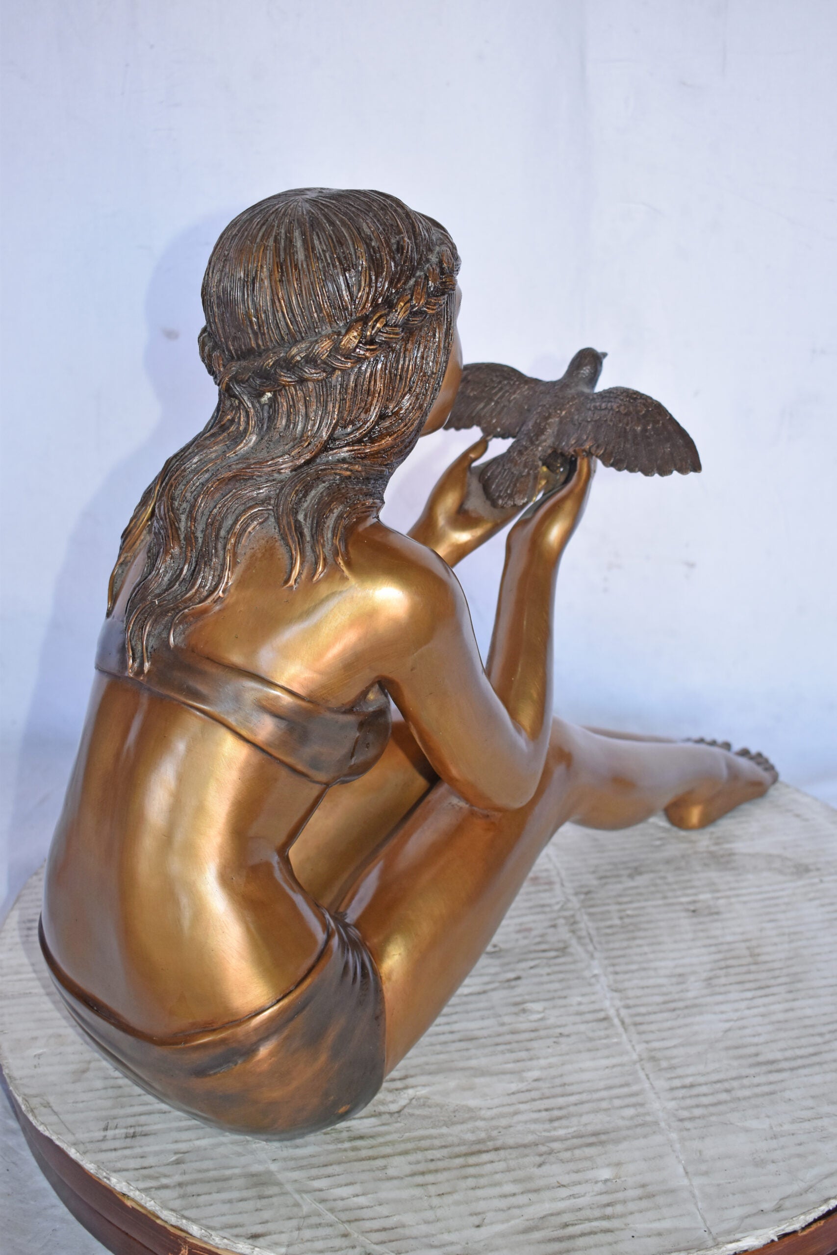 A young Beautiful girl sitting on the ground in the park setting a bird free. This is a life-size bronze statue, characterized by the youthfulness of the child as she looks at the bird flying. The statue is a scene well captured in a museum quality, hand-cast bronze using the Lost Wax Process of bronze casting. This statue would look beautiful in the home of a family or those who love the nature. Size: 22"L x 7"W x 18"H. Weight is: 25Lb