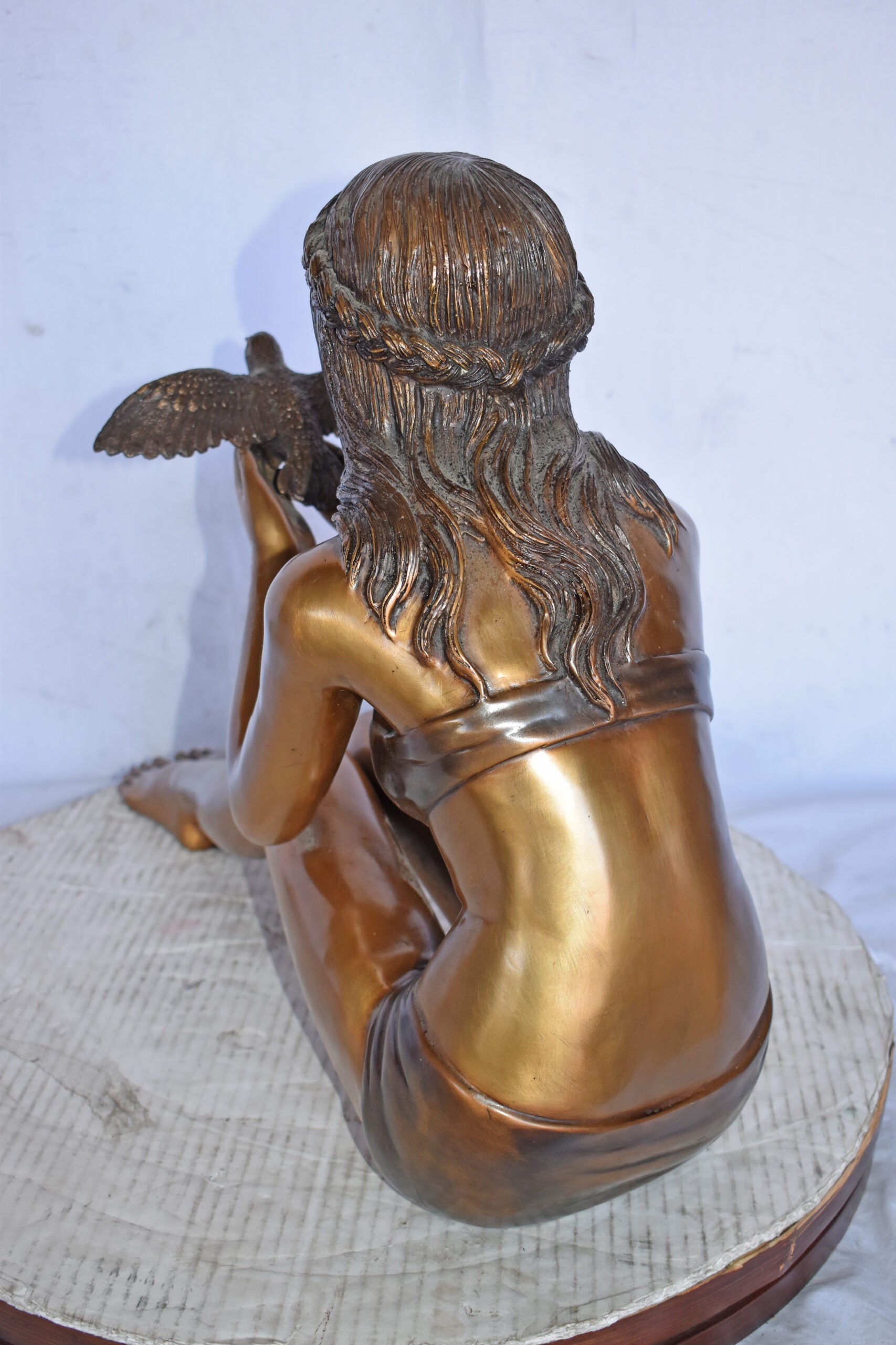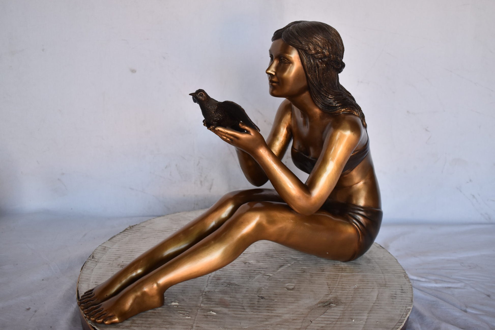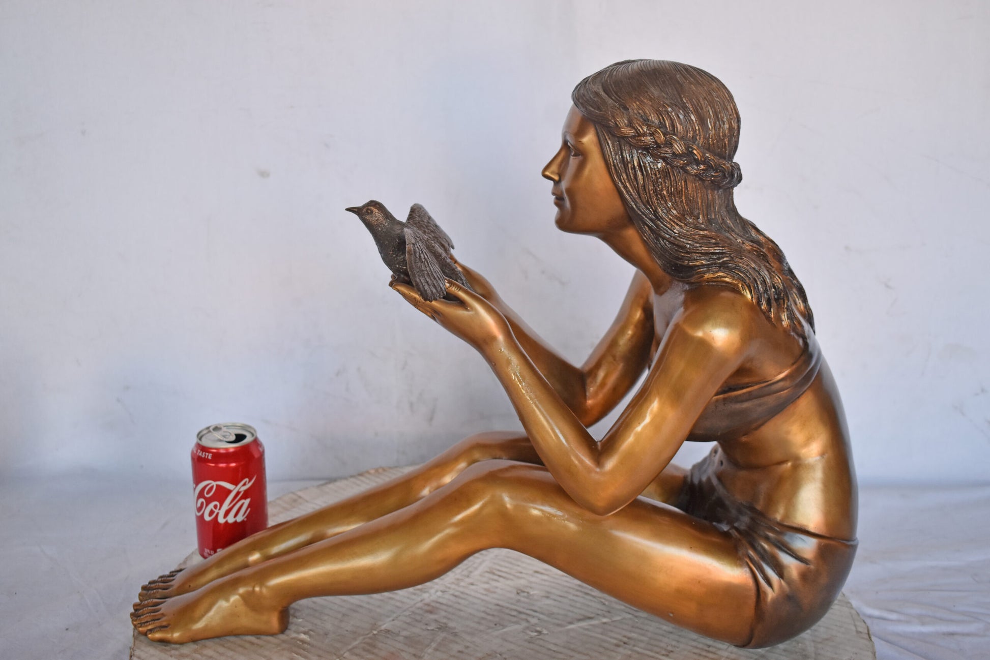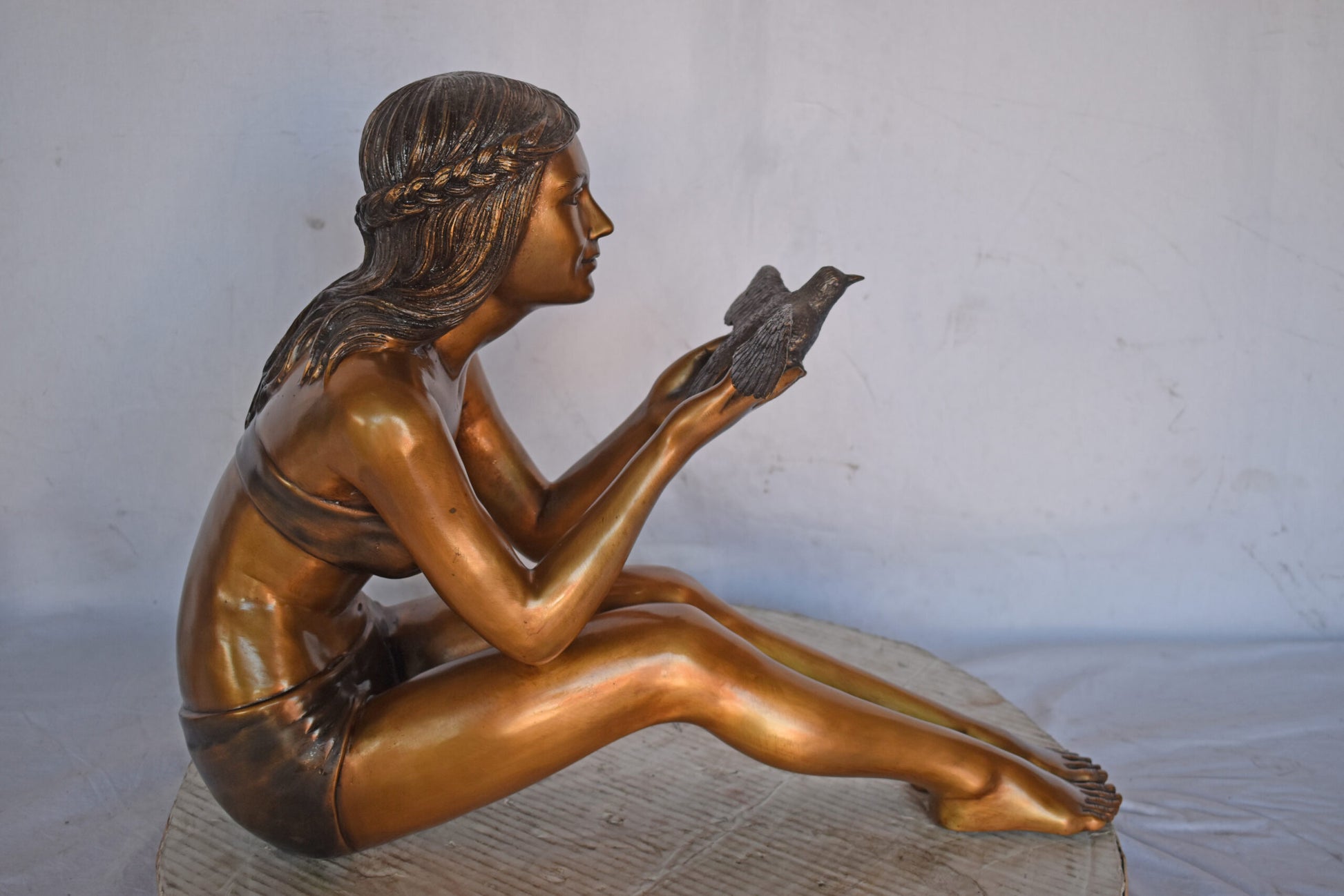A young Beautiful girl sitting on the ground in the park setting a bird free. This is a life-size bronze statue, characterized by the youthfulness of the child as she looks at the bird flying. The statue is a scene well captured in a museum quality, hand-cast bronze using the Lost Wax Process of bronze casting. This statue would look beautiful in the home of a family or those who love the nature. Size: 22"L x 7"W x 18"H. Weight is: 25Lb
