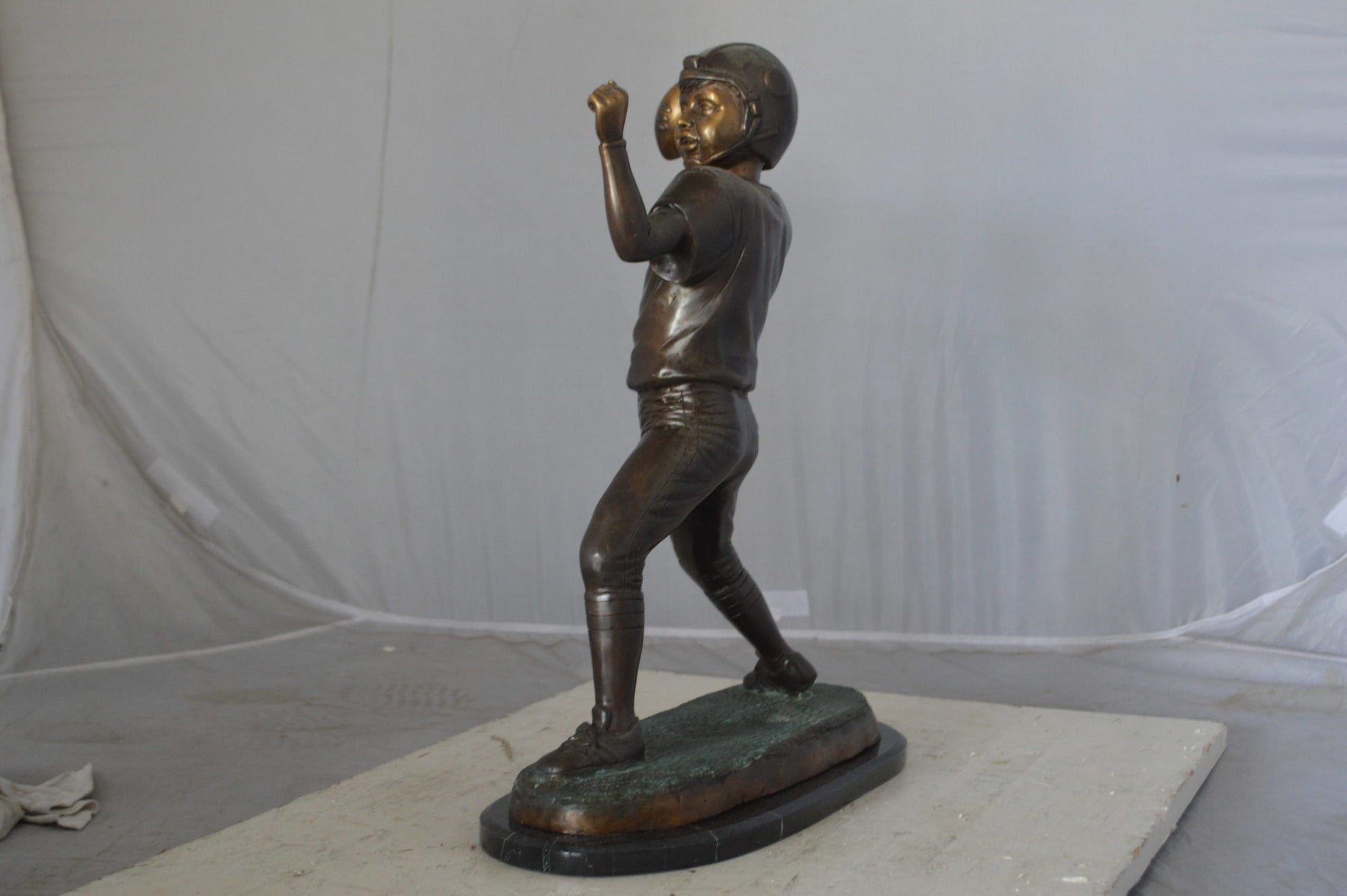 This bronze statue of a young quarterback feels as it is almost in motion as he throws his touchdown in sight. The artist made sure to include exquisite detail, from the jersey to the lace on the football itself. This work of art would fit well in any outdoor space of a family or football lover, Size: 14"L x 6"W x 20"H. Weight is: 8Lb