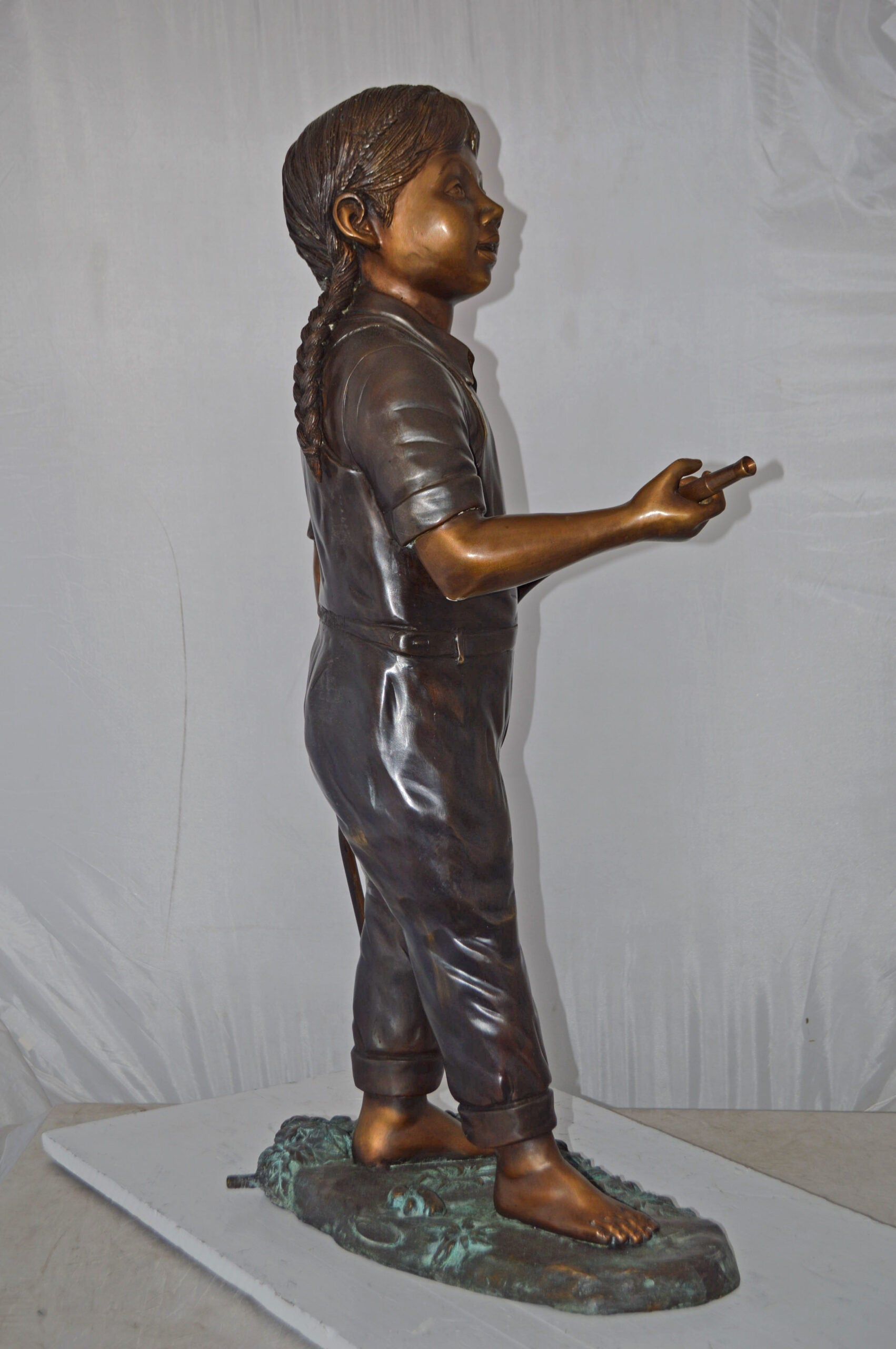 A playful young girl is the center of this delightful outdoor fountain. The detailed Bronze casting used to construct this fountain enables you to enjoy the texture and details of the statue. The figure feature a bronze finish with green and brown patina that has been applied to create aged, weathered nuance. This bronze statue is cast in the traditional lost-wax method, which highlights the exceptionally fine detail and guarantees lasting heirloom beauty. This sculpture would be a great addition to your patio, garden, lawn, or anywhere else. Size: 13"L x 20"W x 39"H. Weight is: 48Lb