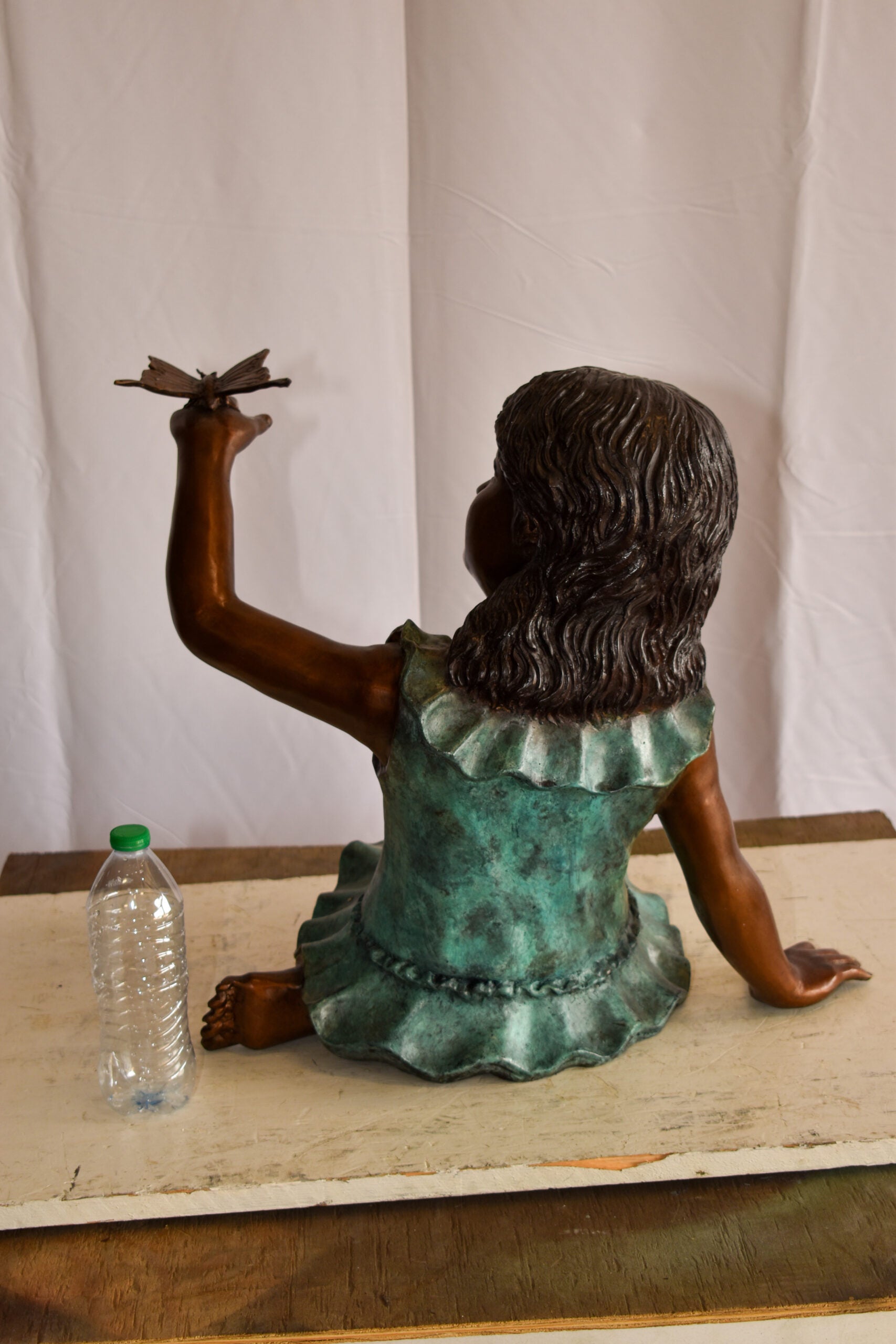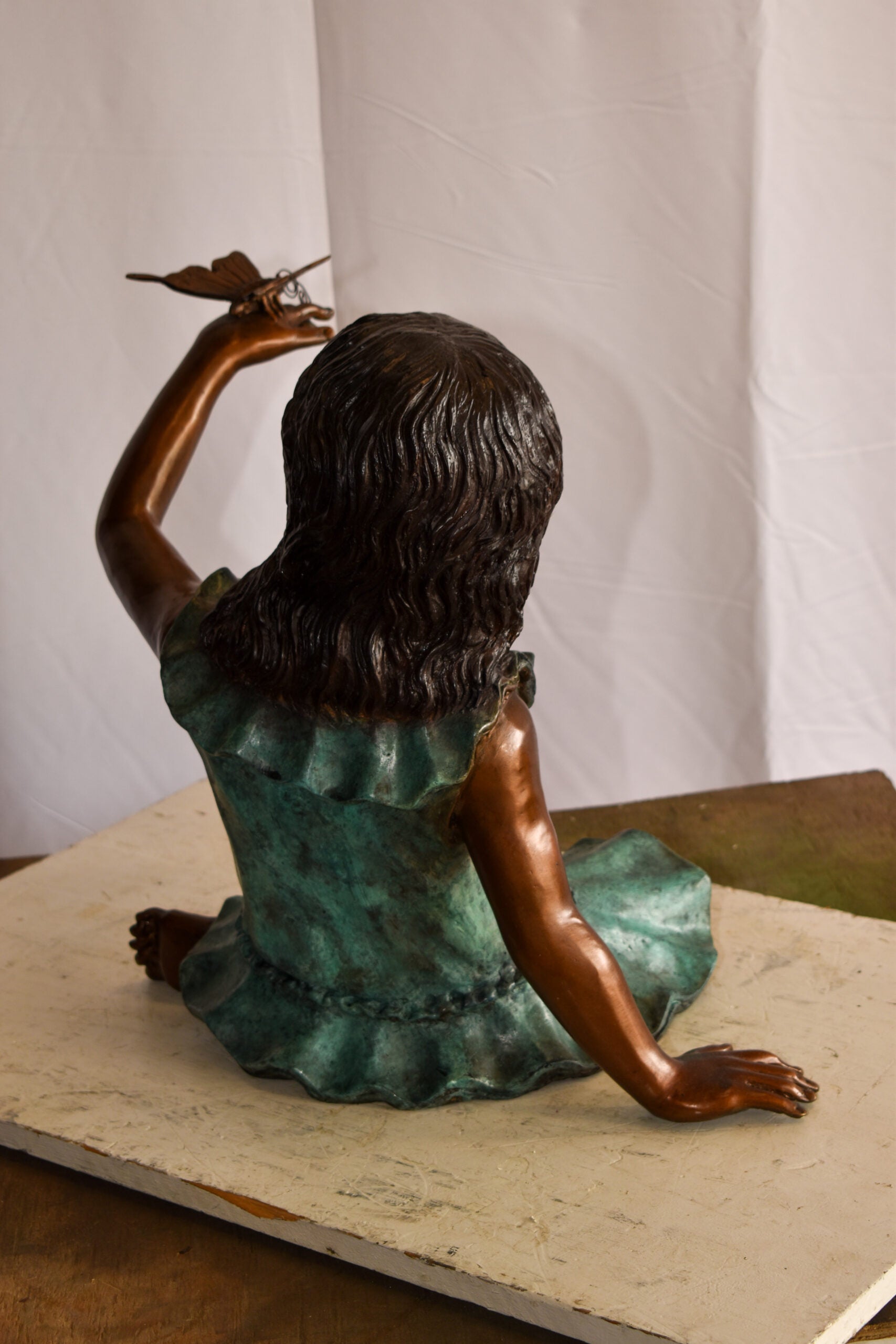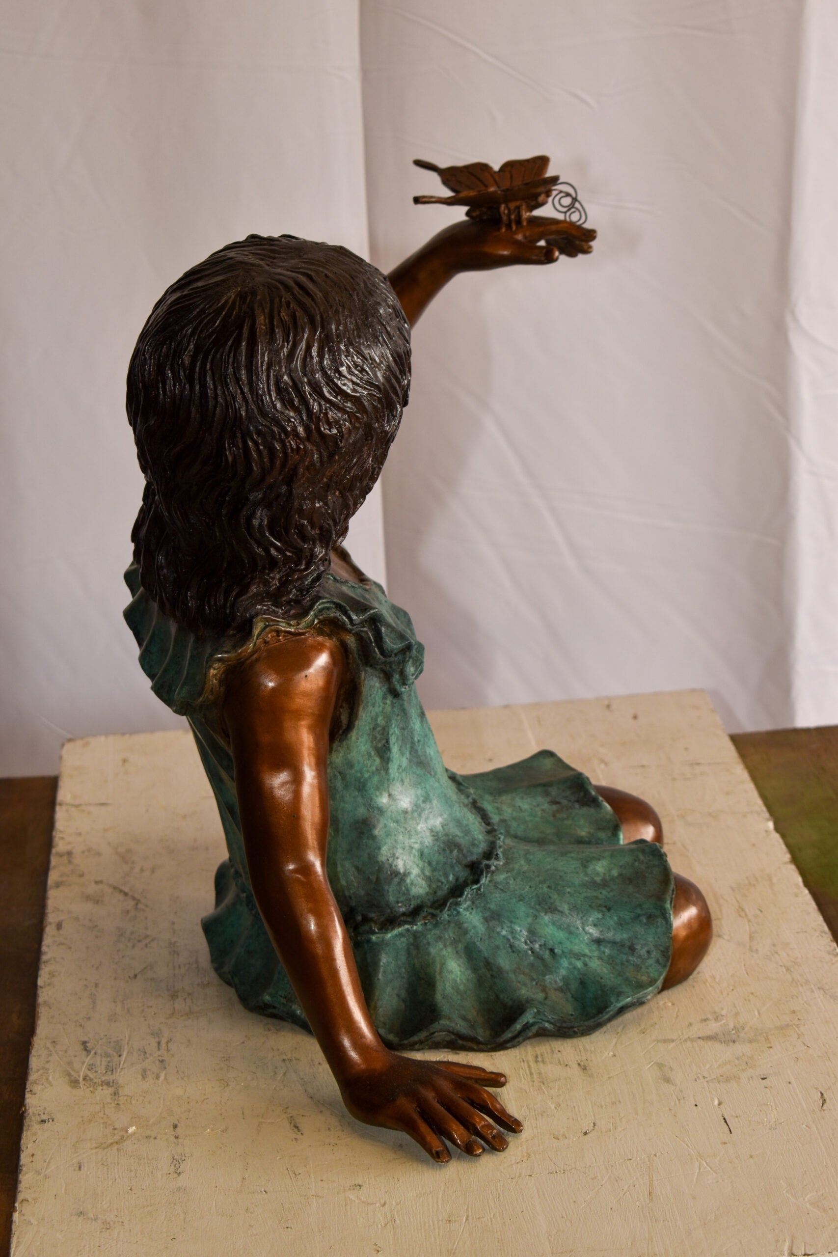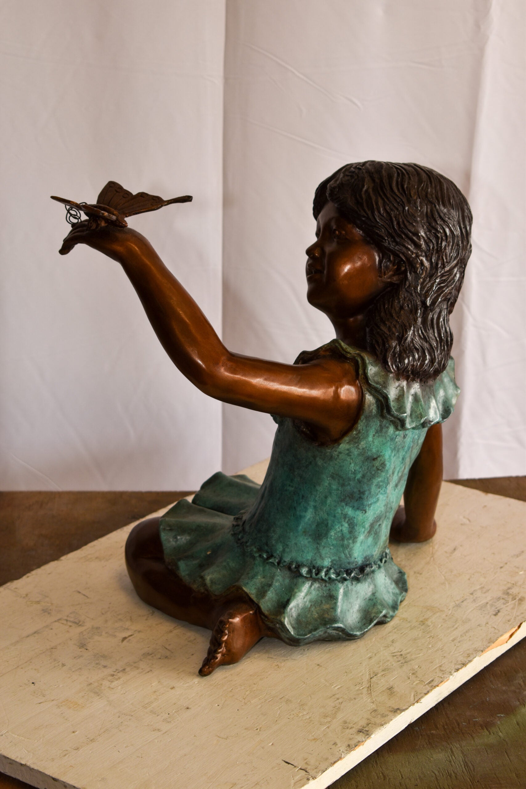 This charming life size statue of a girl playing outside with a butterfly, depicts childhood play and spend time like in the old days (when kids did not have smartphones). This is a beautiful bronze statue stained in green and brown patina with clear finish for preservation. This bronze statue is museum quality, hand-cast in high-quality pure bronze using the Lost Wax Process of bronze casting. Size: 21"L x 15"W x 19"H. Weight is: 31Lb