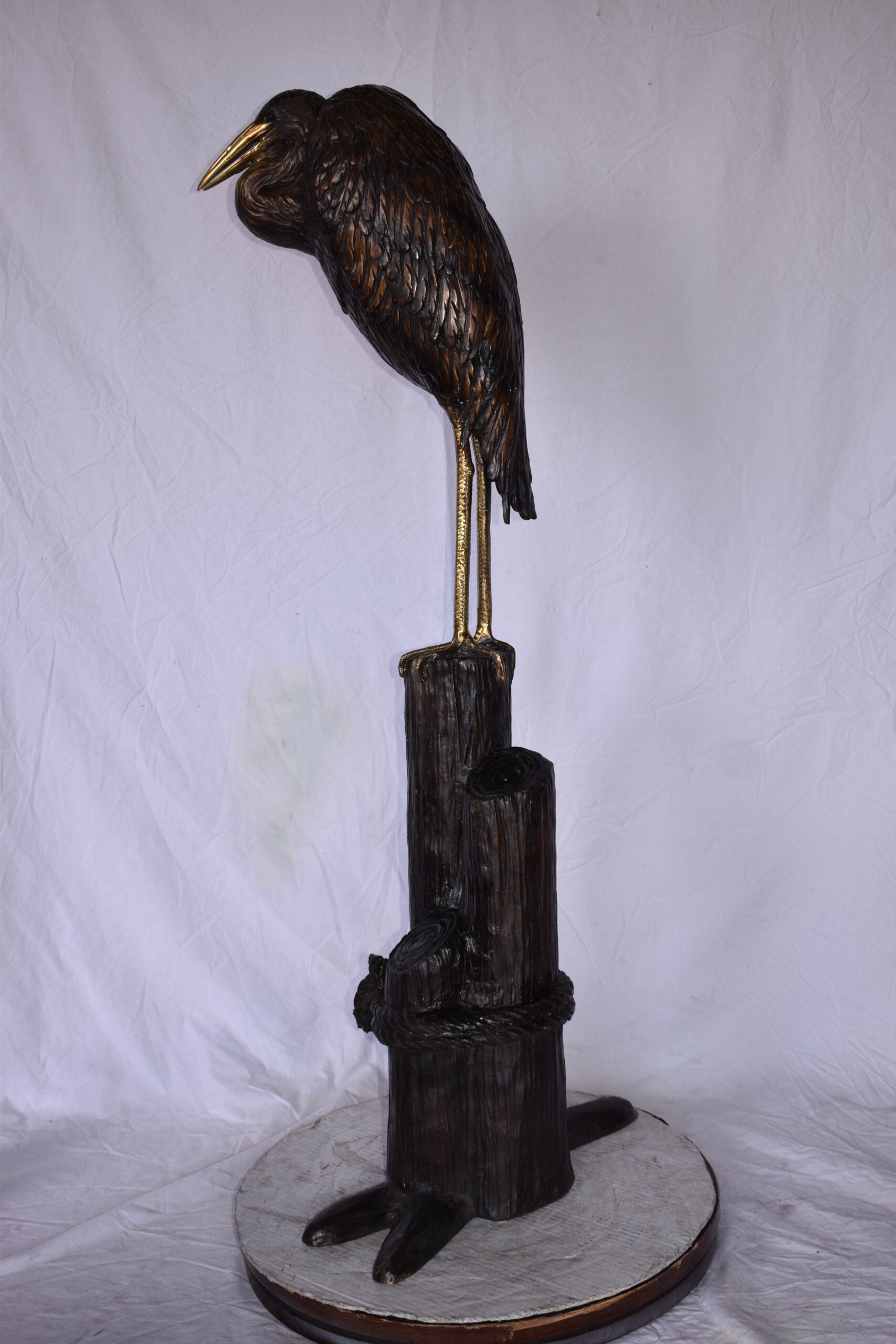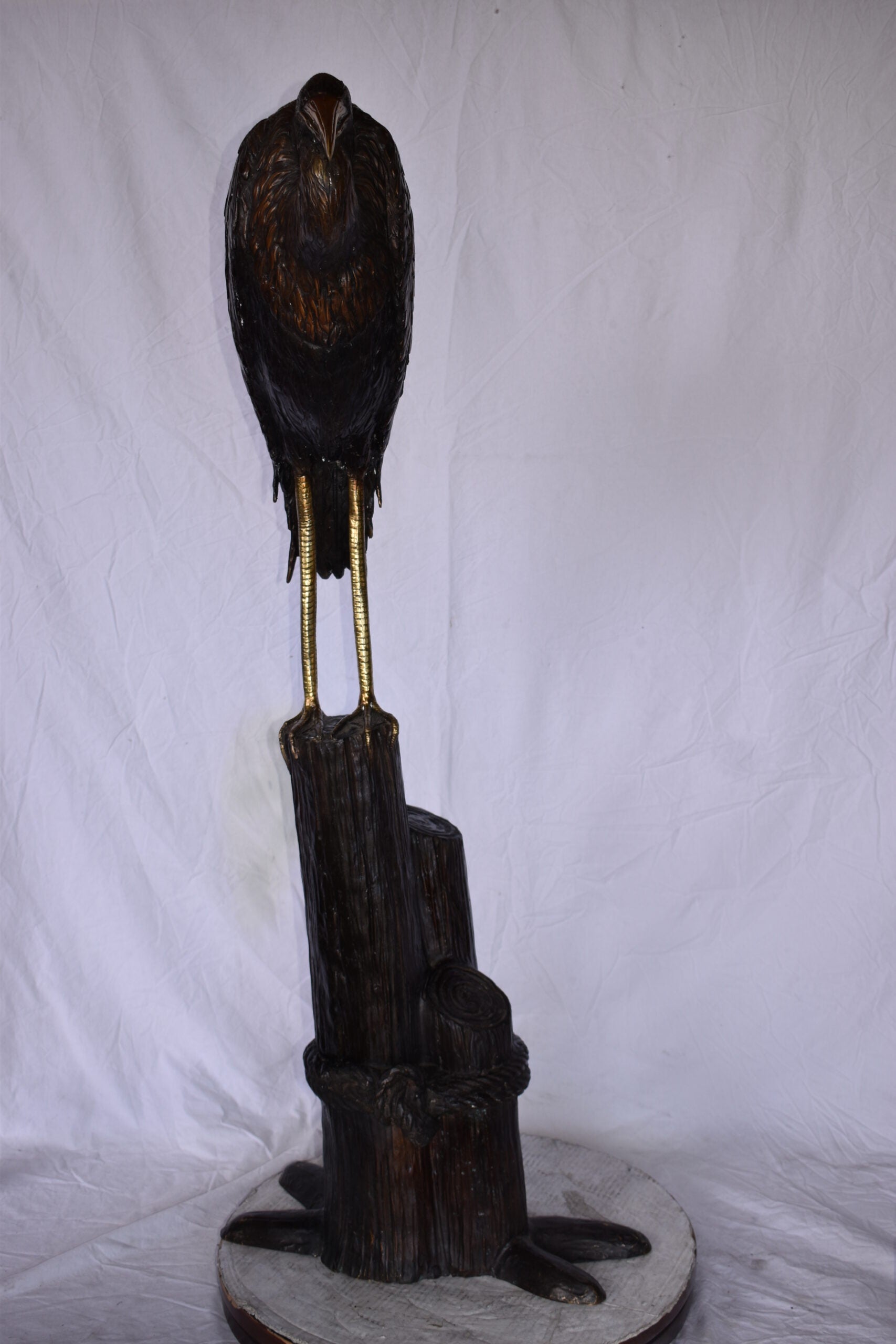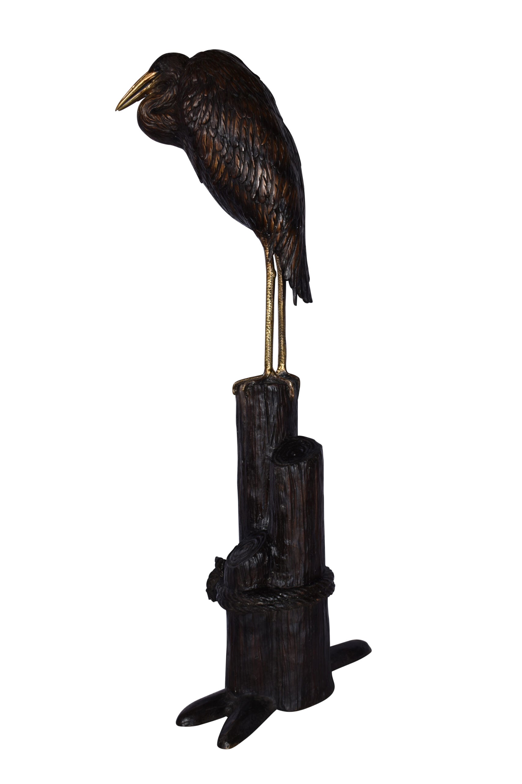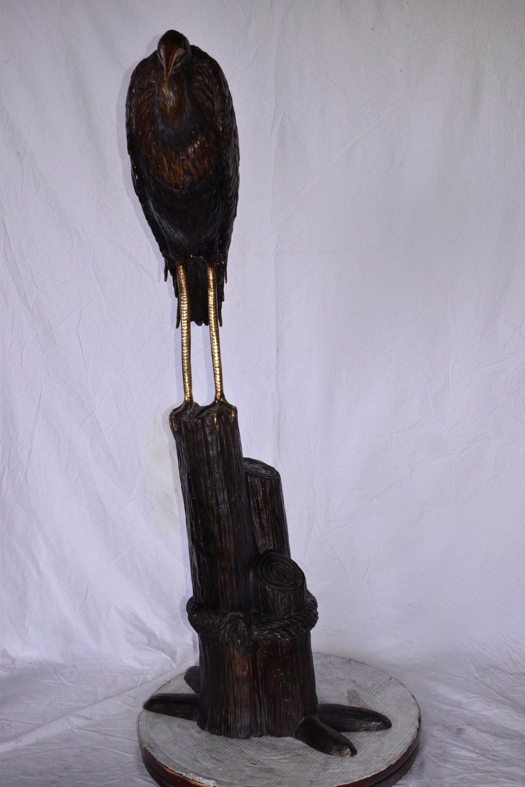 Crane Head Down Standing on A Tree Stump Bronze Statue Size: 23" x 16" x 55"H