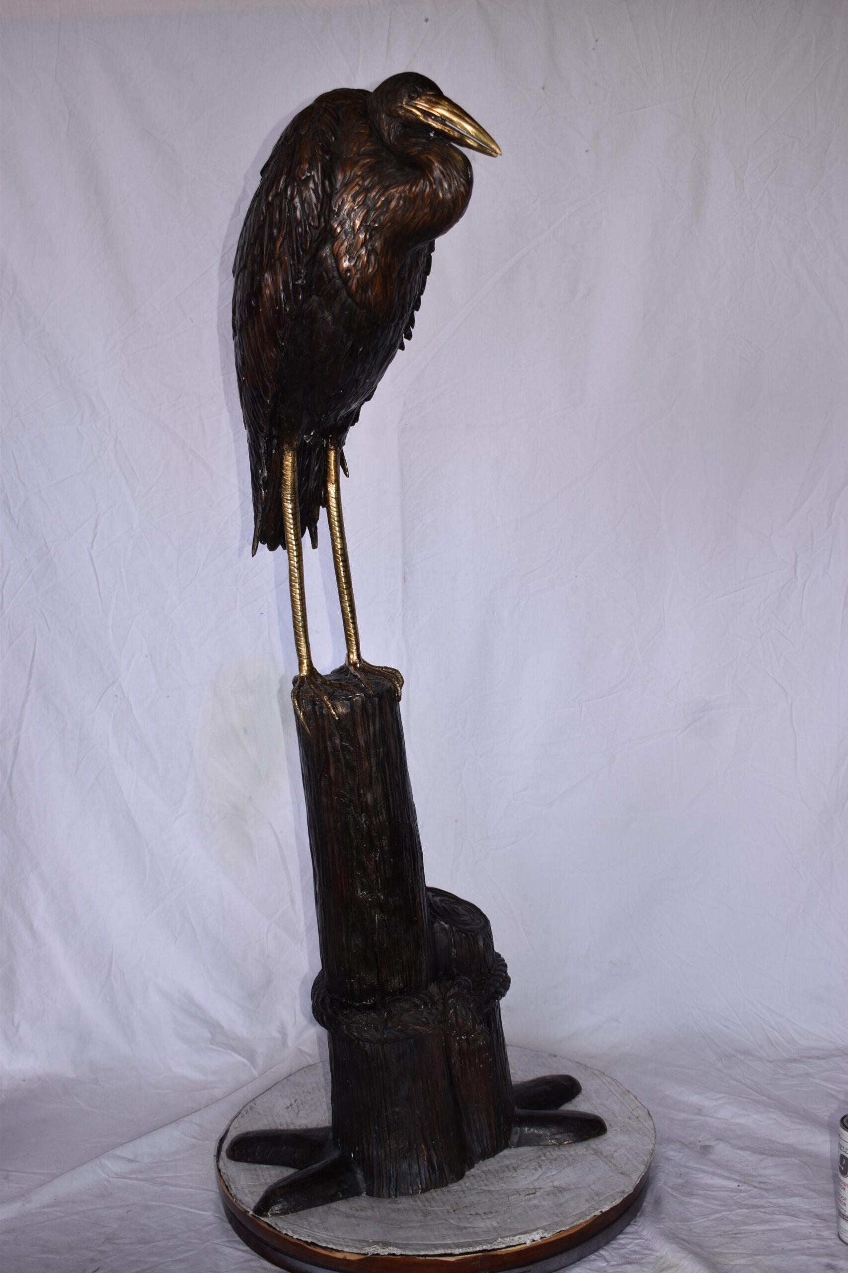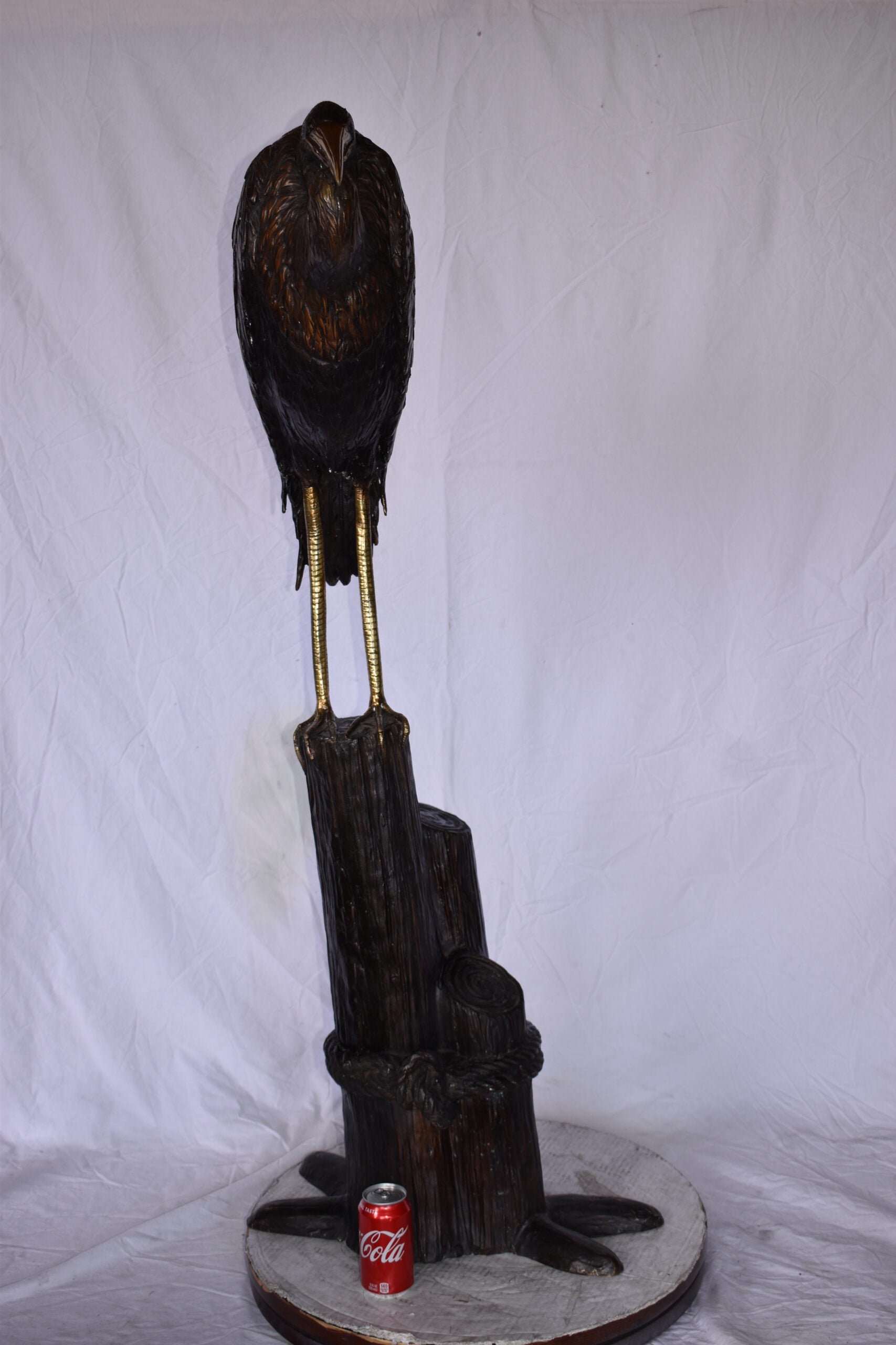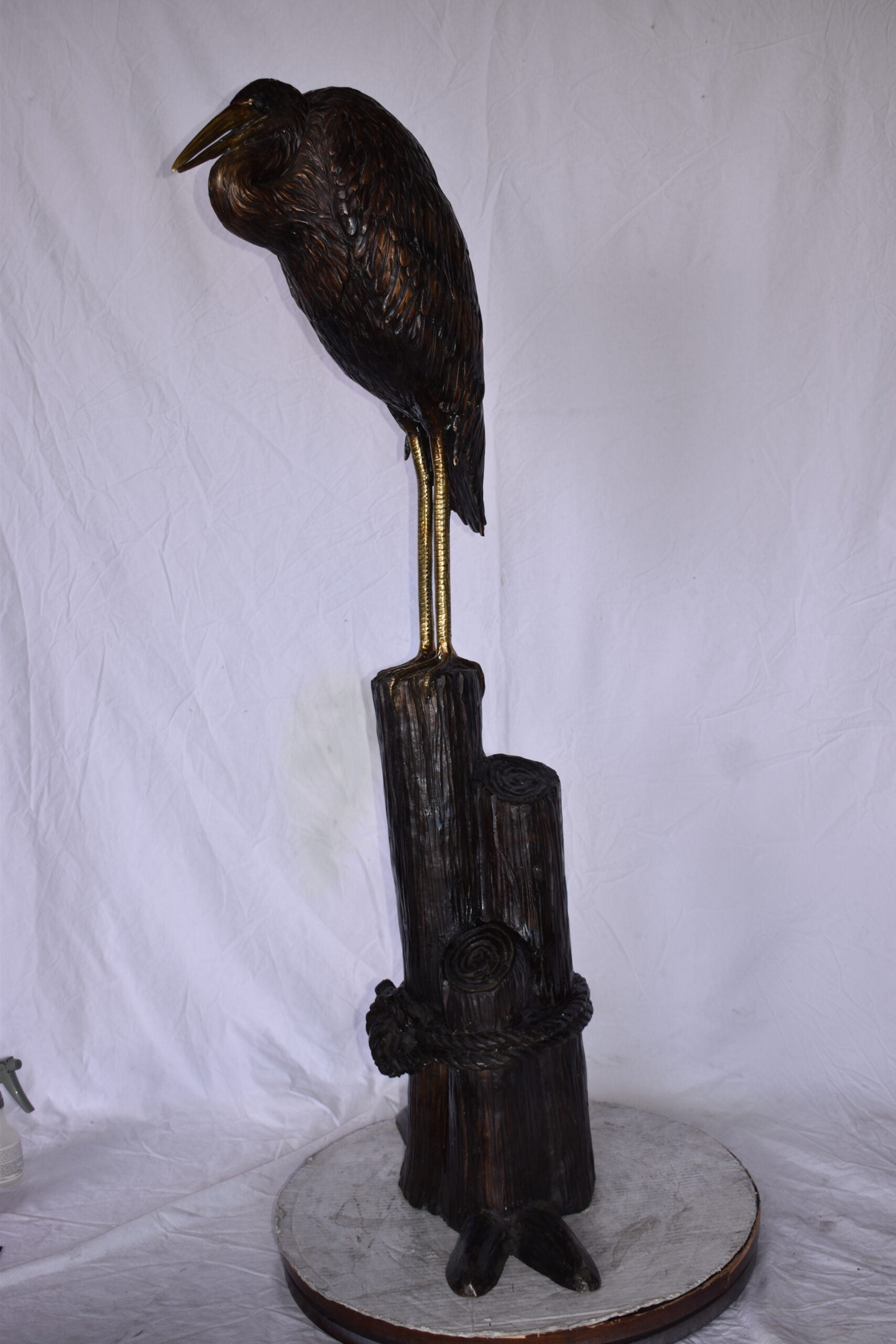 Crane Head Down Standing on A Tree Stump Bronze Statue Size: 23" x 16" x 55"H