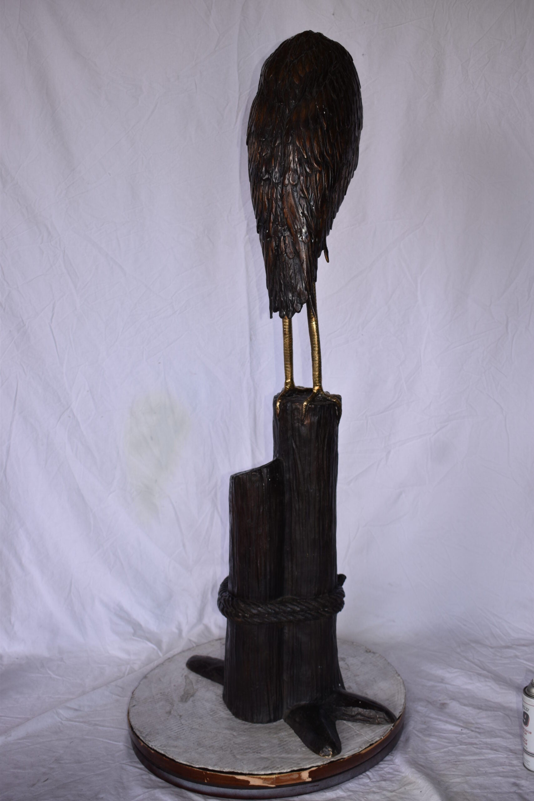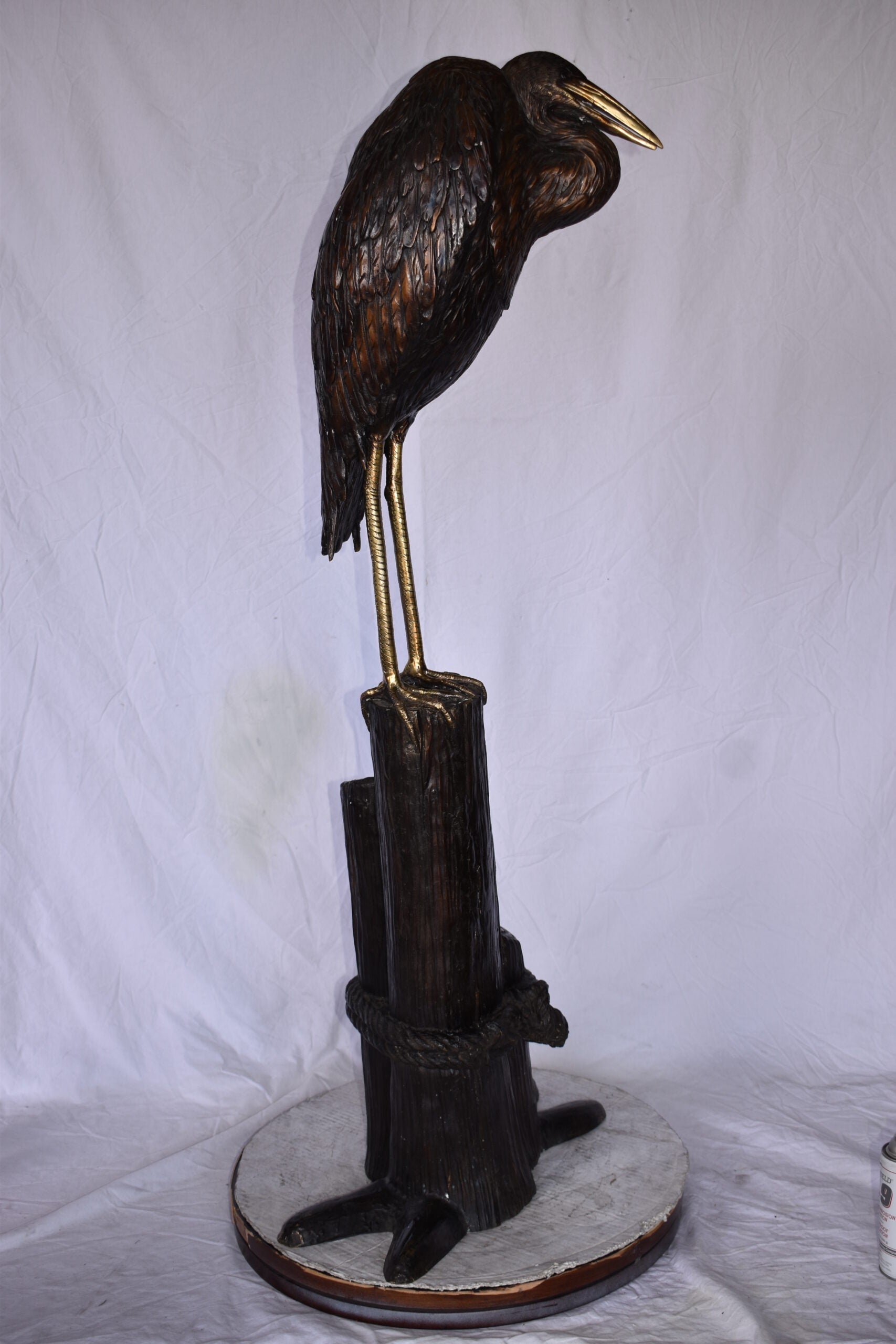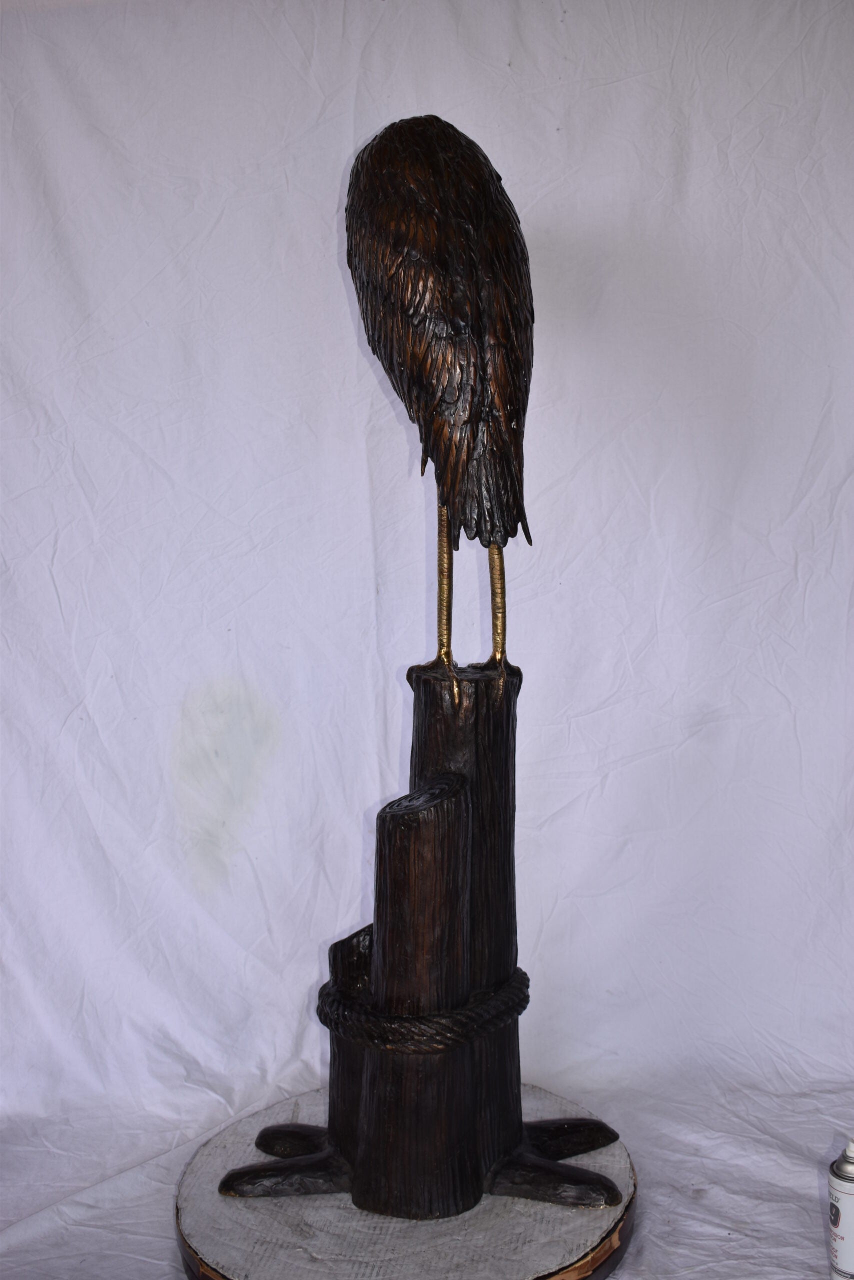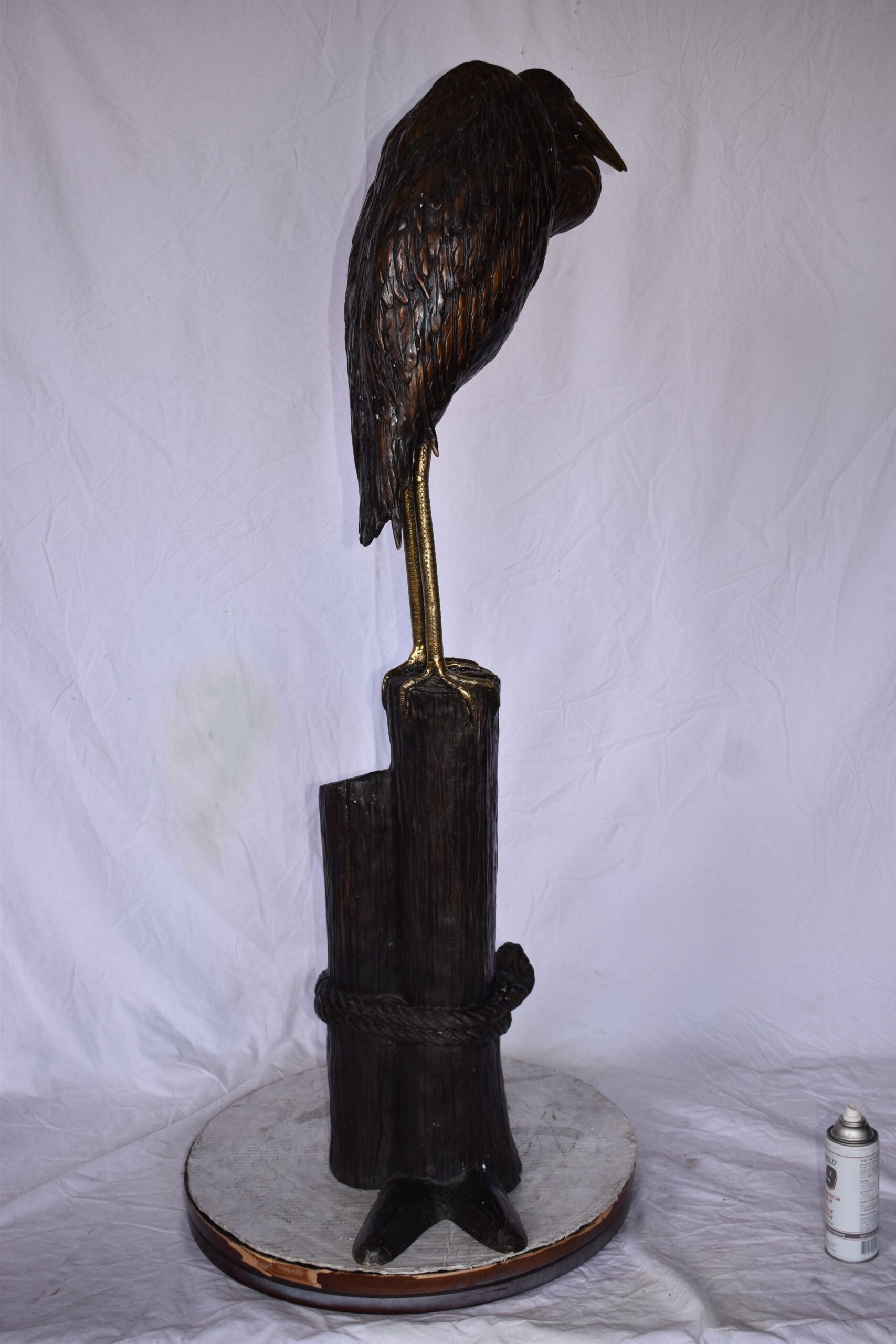 Crane Head Down Standing on A Tree Stump Bronze Statue Size: 23" x 16" x 55"H