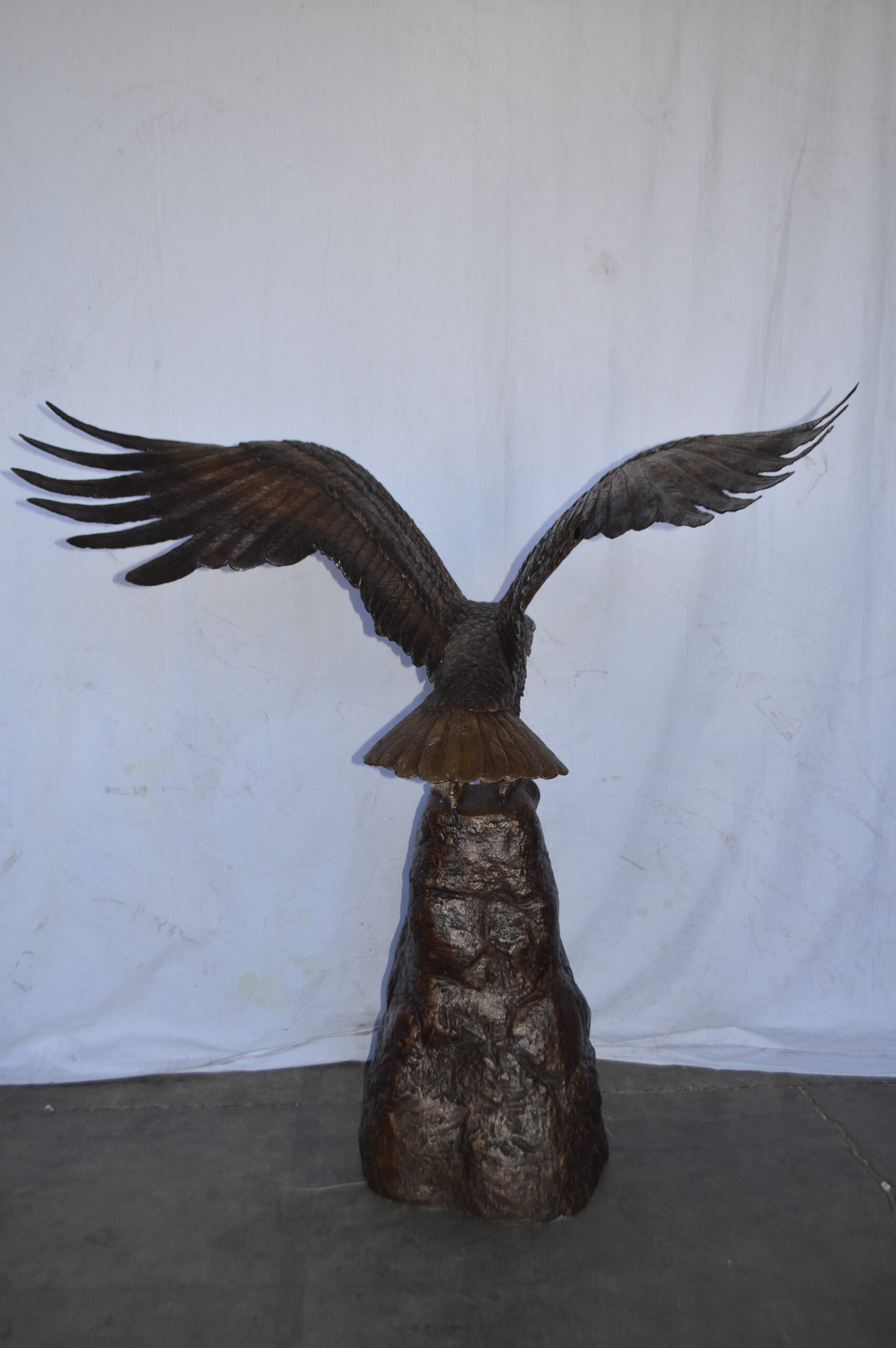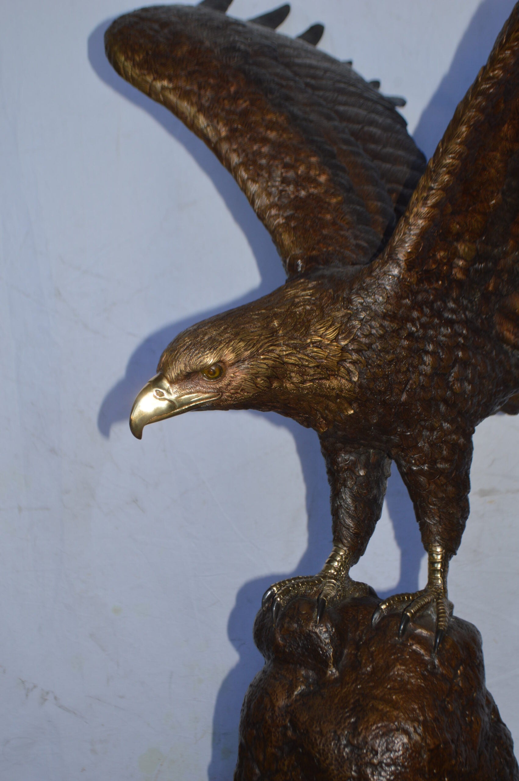 This charming large size bronze statue depicts the American bald eagle. The eagle head captures the essence of the majestic bird of prey. The eagles very large hooked beak (coated in a gold patina) is used for tearing flesh from their unfortunate prey. The extremely keen eyesight of the eagle stares out spotting a potential prey from a very long distance. Through the ages and different cultures, the eagle has represented spiritual protection, carrier of prayers, strength, courage, wisdom, illumination of spirit, healing. This is a true example of a museum quality hand-casted bronze using the Lost Wax Process of bronze casting. Perfect for any art, animal, or nature enthusiast. Size: 51"L x 36"W x 58"H. Weight is: 161Lb