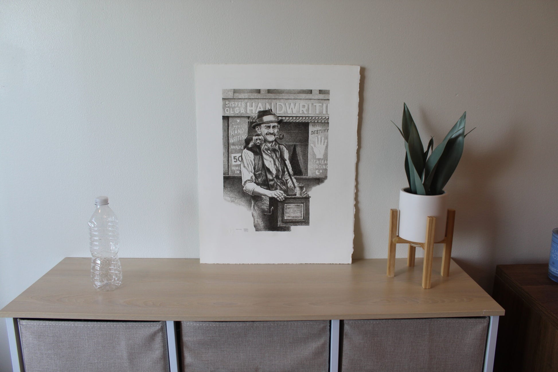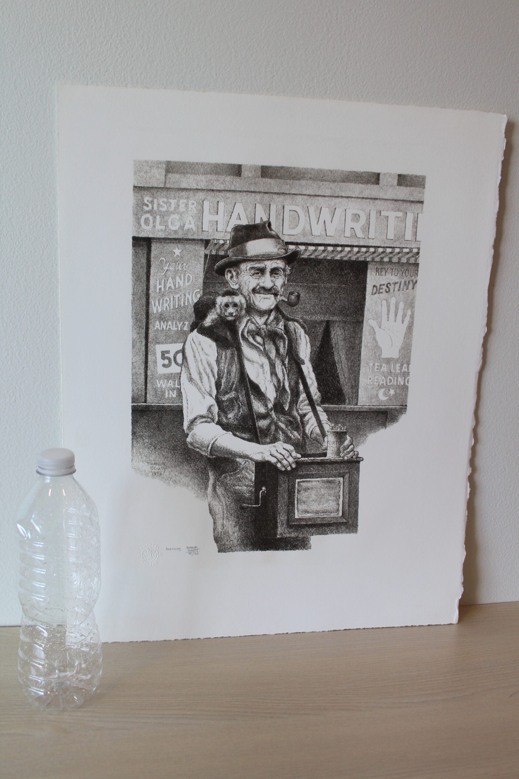 Emanuel Schary's "Fortunes" Lithograph, rendered in striking black and white, unveils a captivating narrative. A man, companioned by a whimsical monkey on his shoulder, delicately cradles a fortune box. The intricate details and chiaroscuro technique lend a timeless quality to this enigmatic moment, inviting viewers to ponder the mysteries and serendipities encapsulated within the delicate contours of the artwork. Size: 10"L x 14"W x "H. Weight is: 2Lb