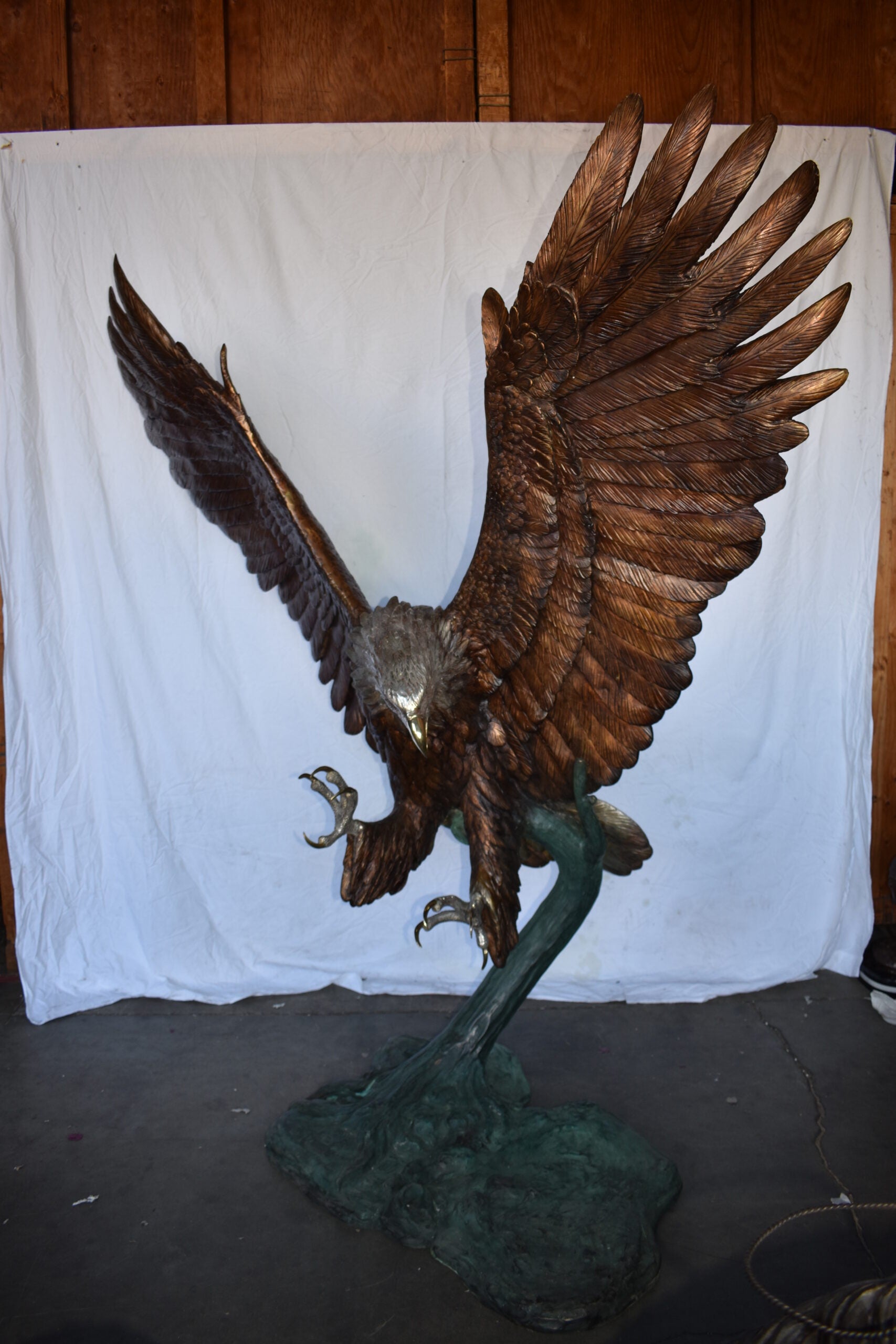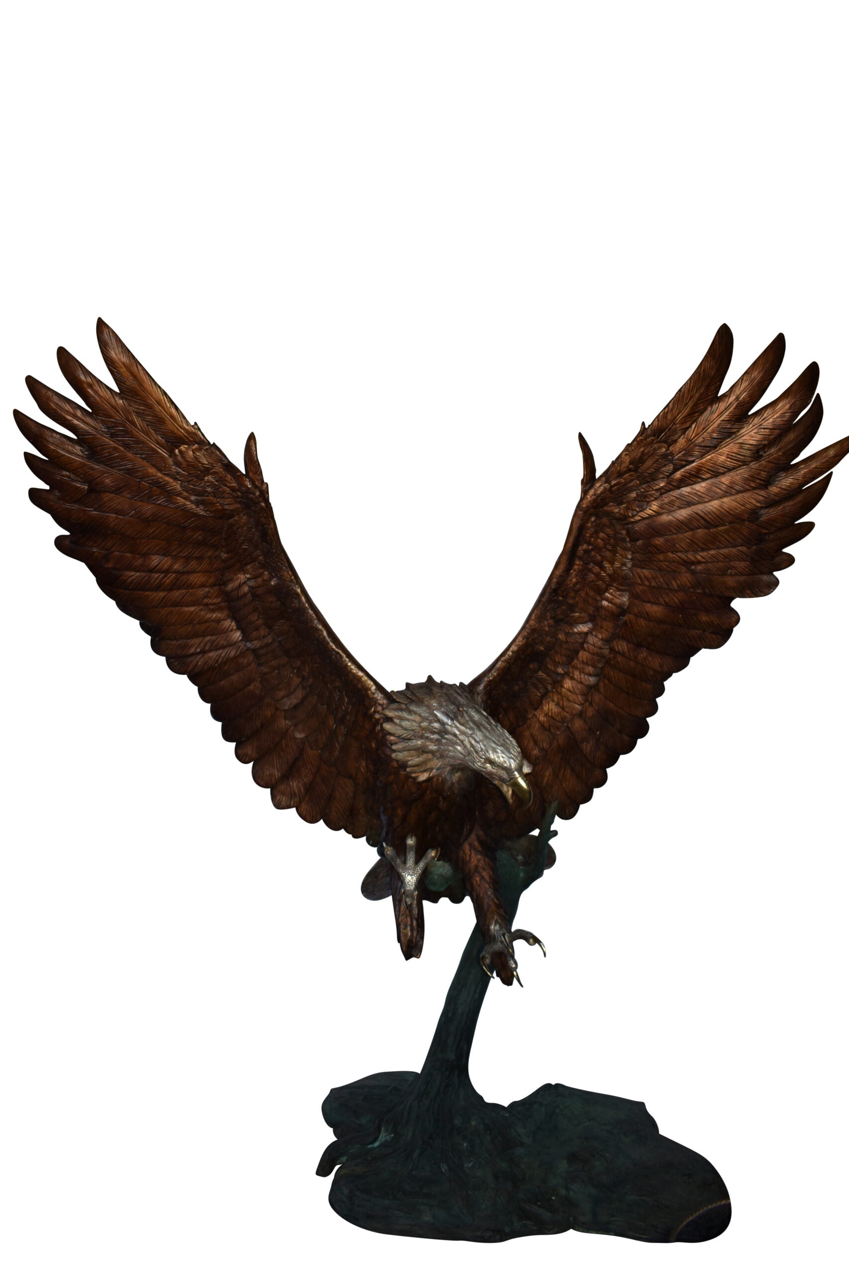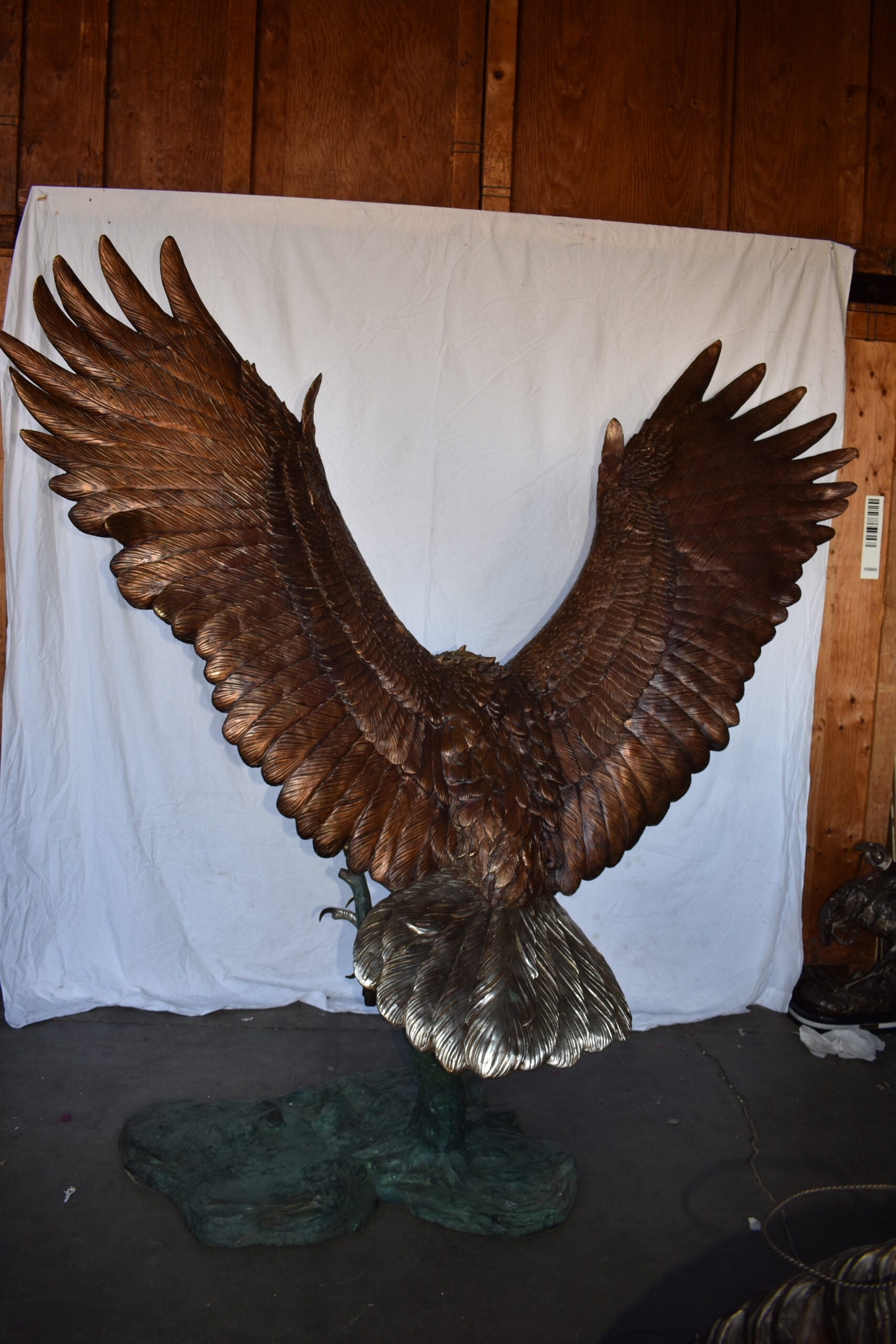 This is a beautiful giant eagle cast in bronze with exquisite details from top to bottom. Perched on a log, this eagle is scouring the area for its prey. This is a true example of a museum quality hand-casted bronze produced using the Lost Wax Process of bronze casting. Perfect for any art, animal, or nature enthusiast. Size: 84"L x 40"W x 84"H. Weight is: 363Lb