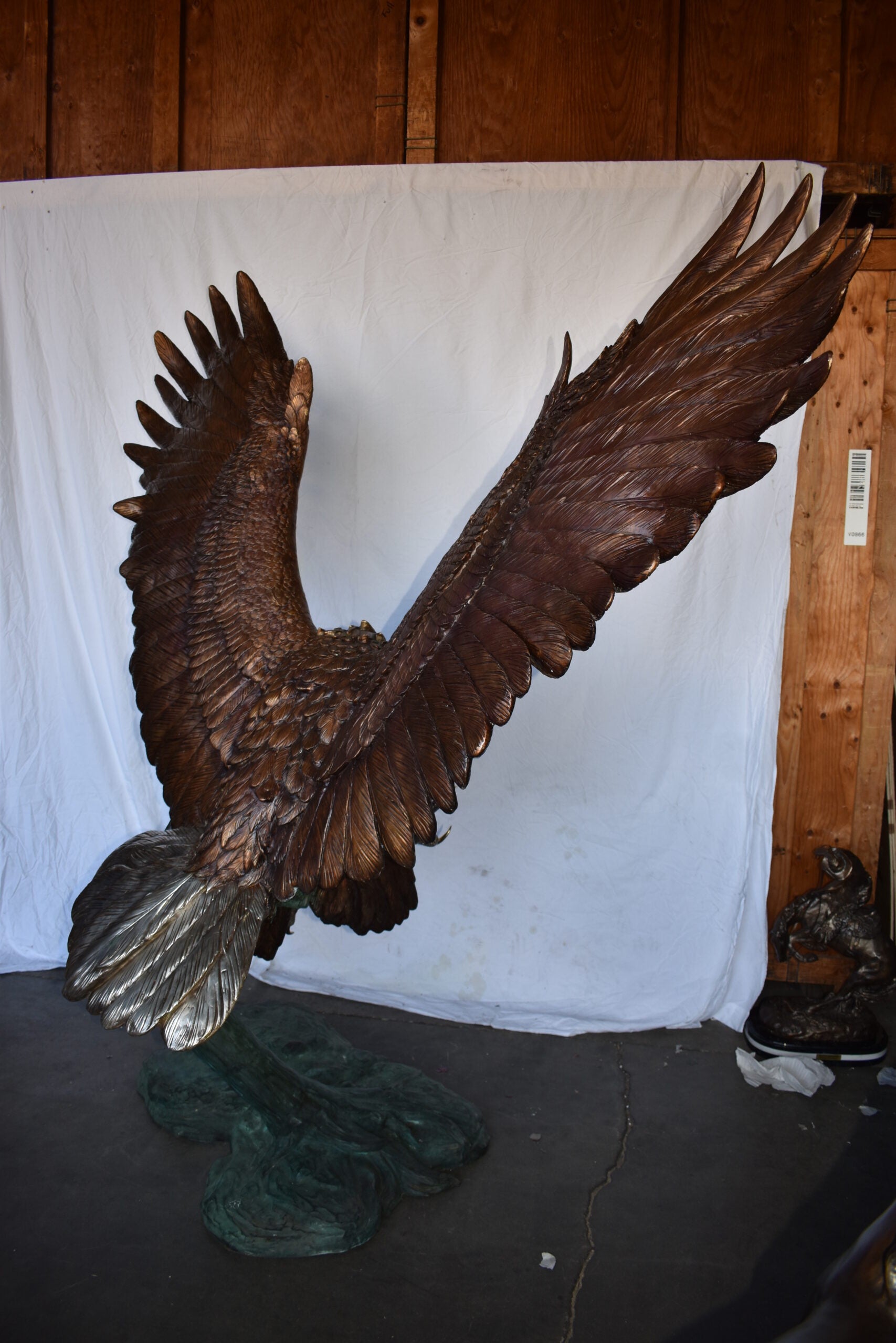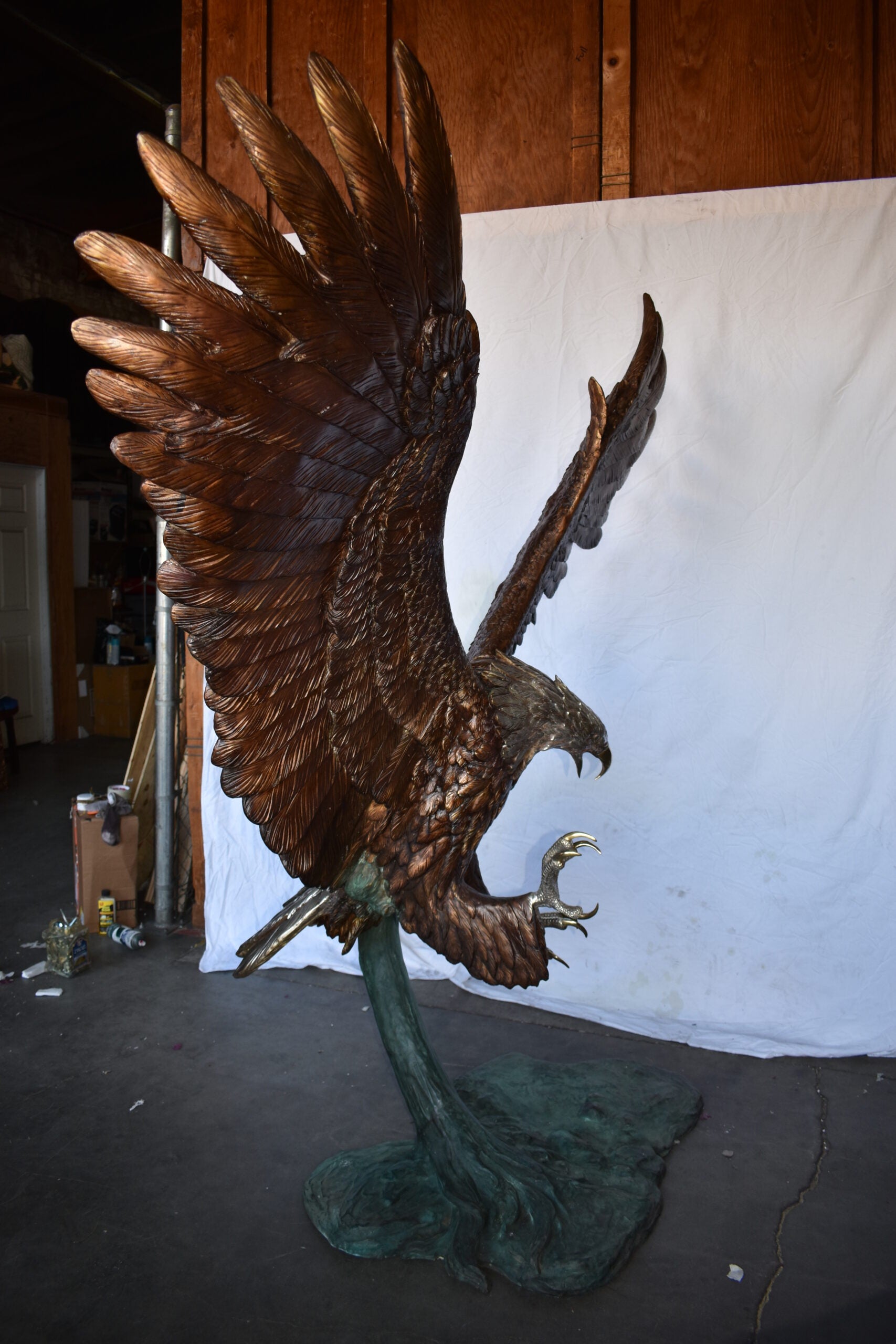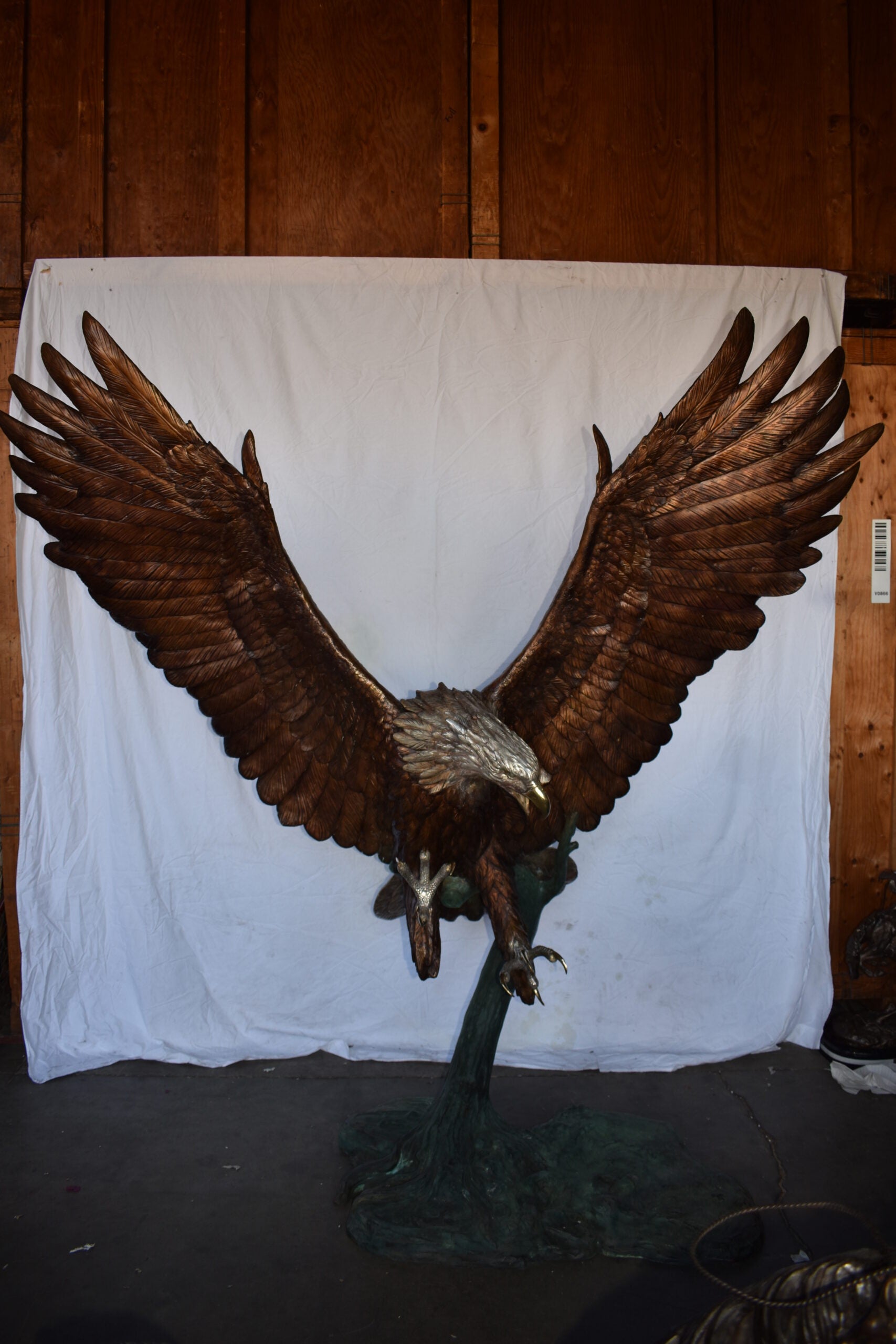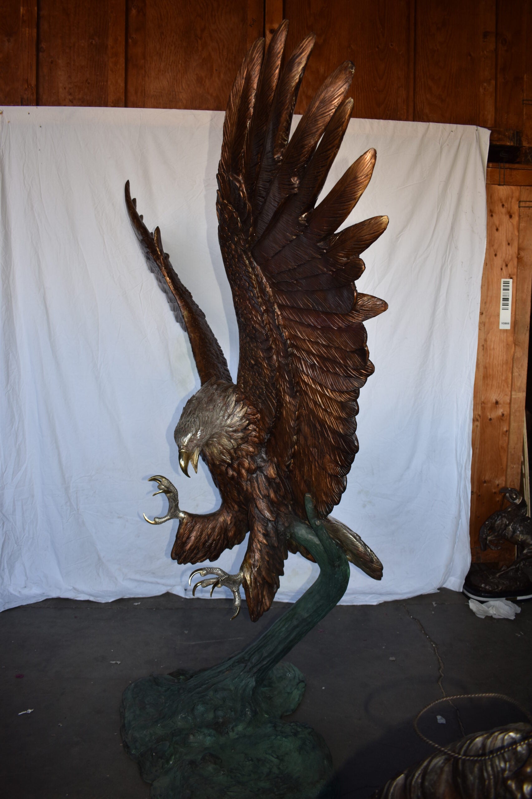 This is a beautiful giant eagle cast in bronze with exquisite details from top to bottom. Perched on a log, this eagle is scouring the area for its prey. This is a true example of a museum quality hand-casted bronze produced using the Lost Wax Process of bronze casting. Perfect for any art, animal, or nature enthusiast. Size: 84"L x 40"W x 84"H. Weight is: 363Lb