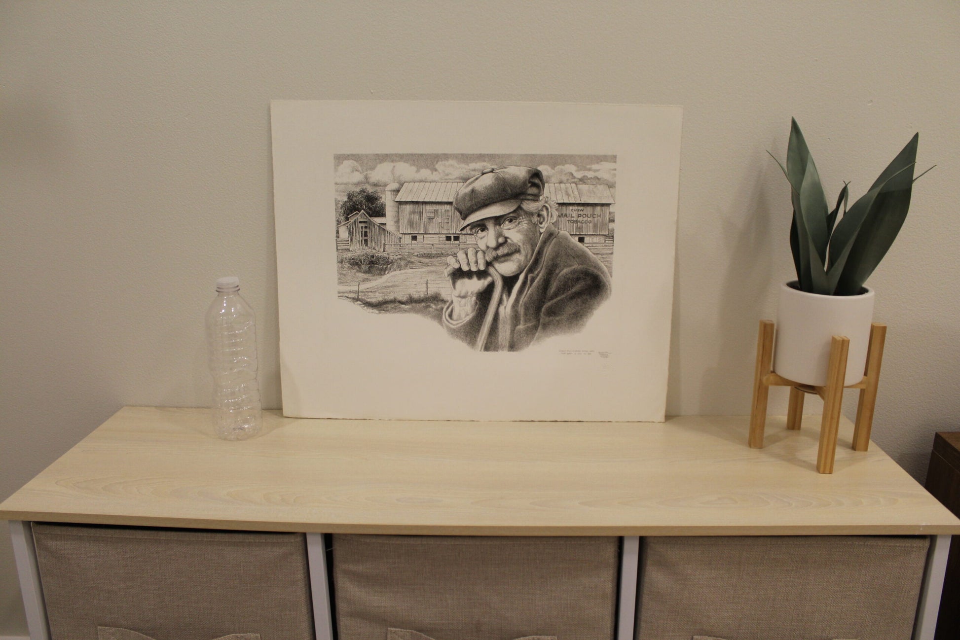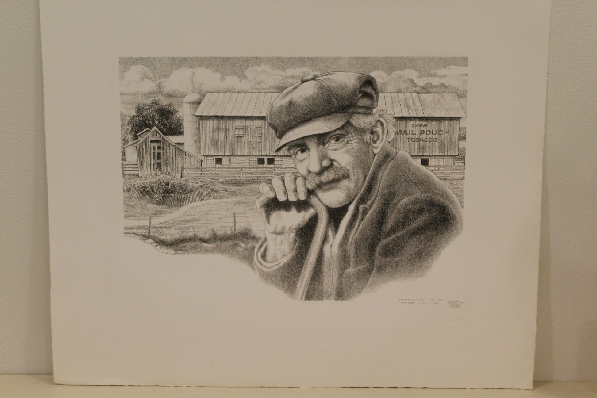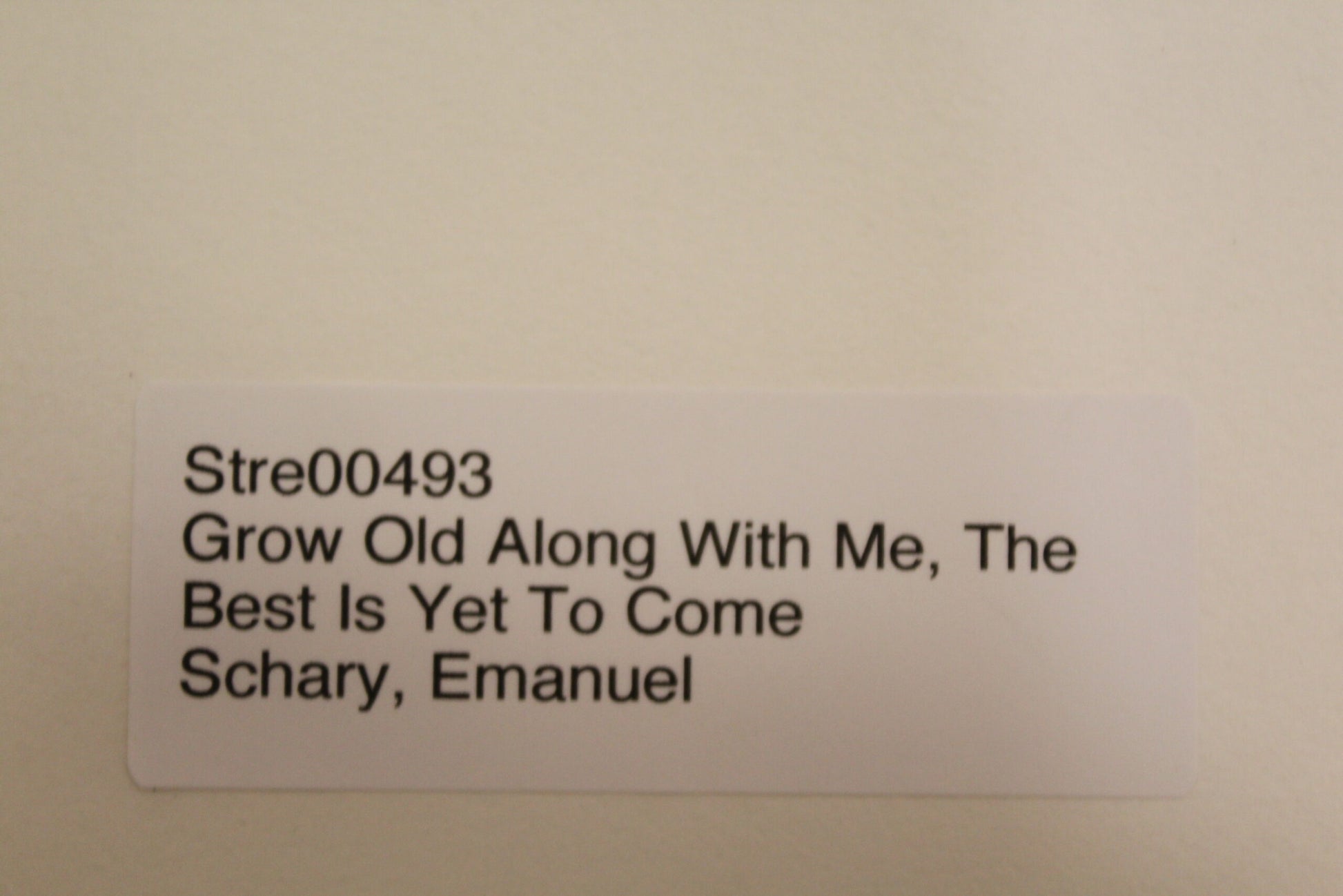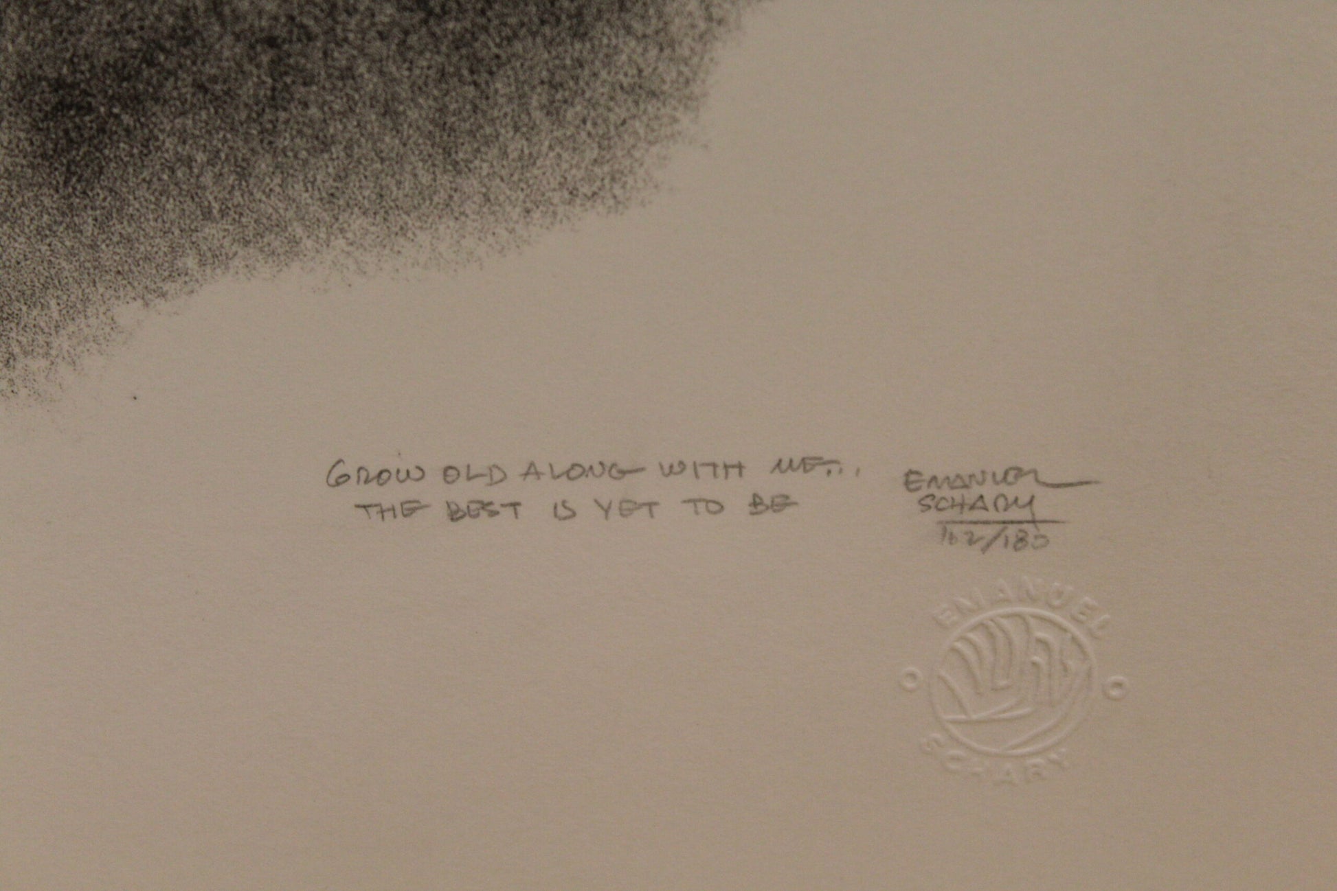 Embark on an introspective journey with Emanuel Schary's Lithograph, "Grow Old Along With Me, The Best is Yet To Come." In black and white, an older man reflects, capturing the grace of aging. Own a masterpiece that echoes the sentiment that the best is, indeed, yet to come. Size: 14"L x 10"W x "H. Weight is: 2Lb