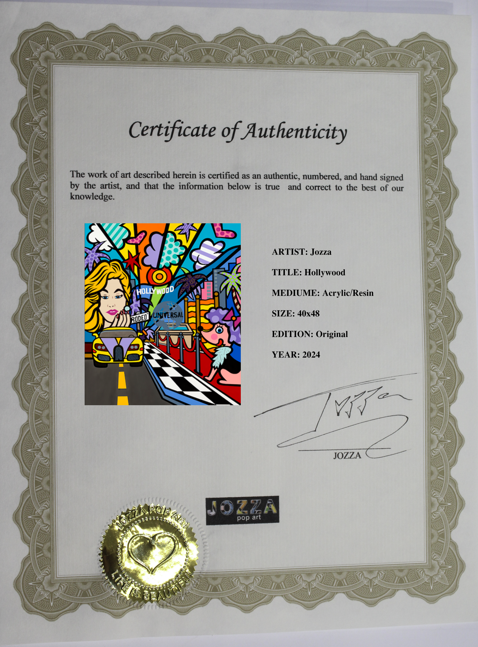 Hollywood, A Wall Art Painting by Jozza, Original Acrylic print on Canvas, hand signed and numbered by the artist. Jozza, born in 1958 in Hidrolandia, a small town located in central Brazil, one of the most exciting Pop Artists in the world today, creates his artistic vision with vibrant imagery and combinations of bright color and hard-edged abstract subjects. This artwork comes gallery wrapped, stretched ready to hang Size: 40"L x 48"W x 1"H. Weight is: 6Lb
