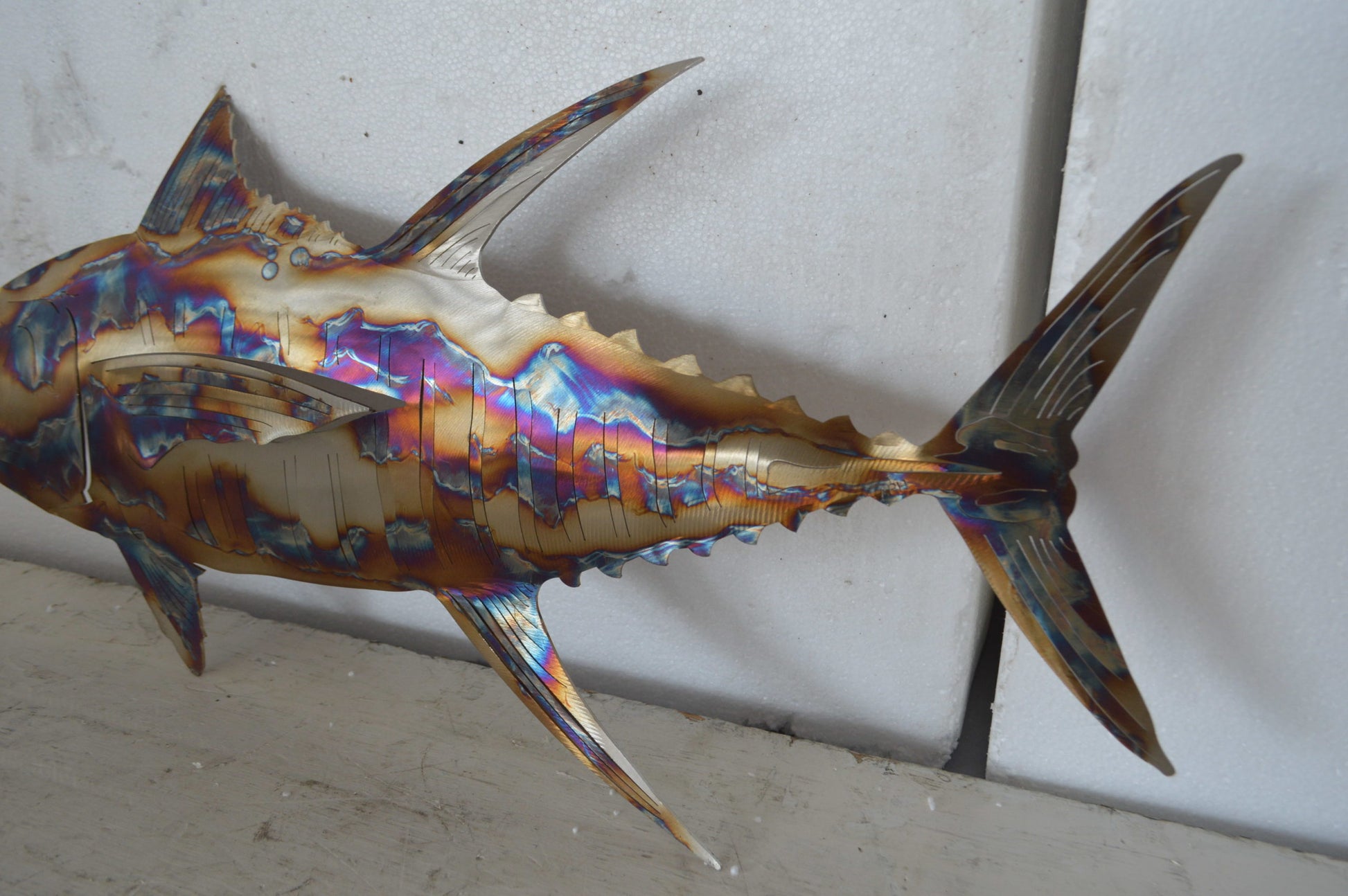 This jack fish is crafted using laser cut steel and can be mounted on any wall desiring a nautical addition. The immense detail in both the iridescent color of the fish and the shape makes it both realistic looking and unique in design. This work of art would pair well with any of the other nautical mounted wall art. Size: 25"L x 2"W x 12"H. Weight is: 2Lb