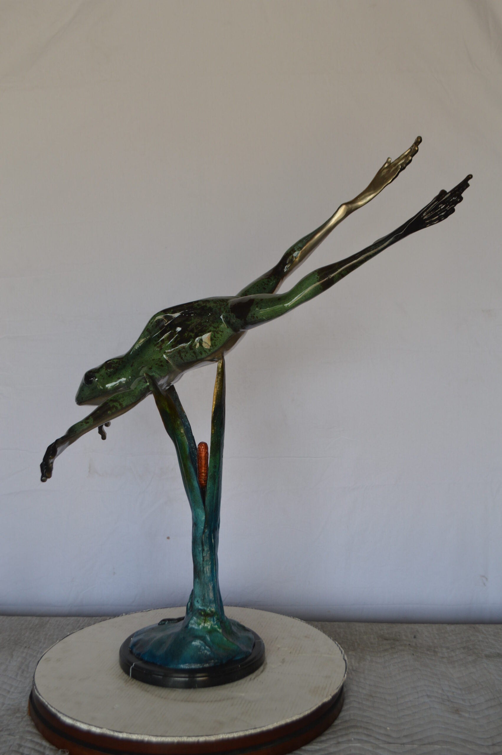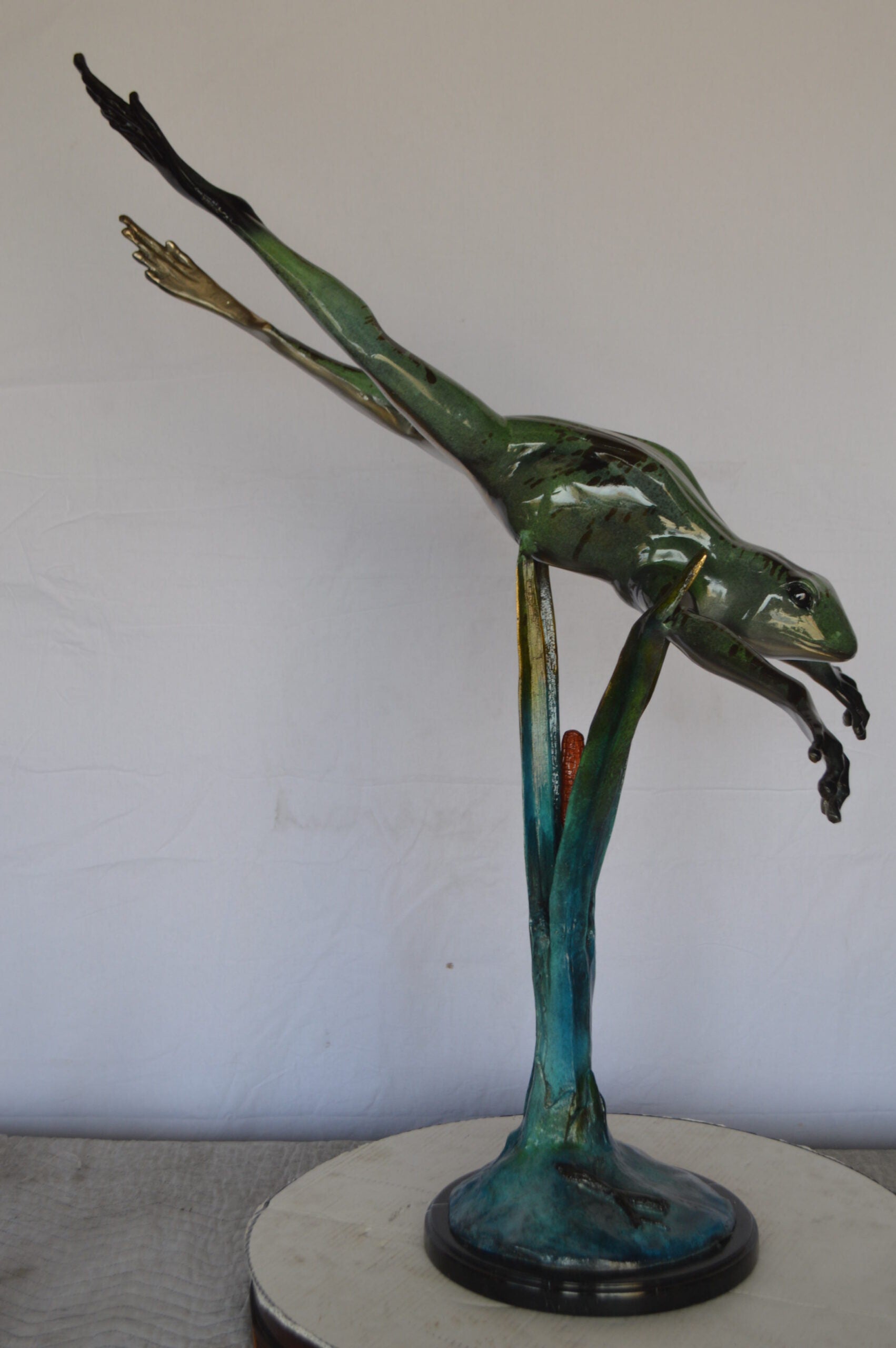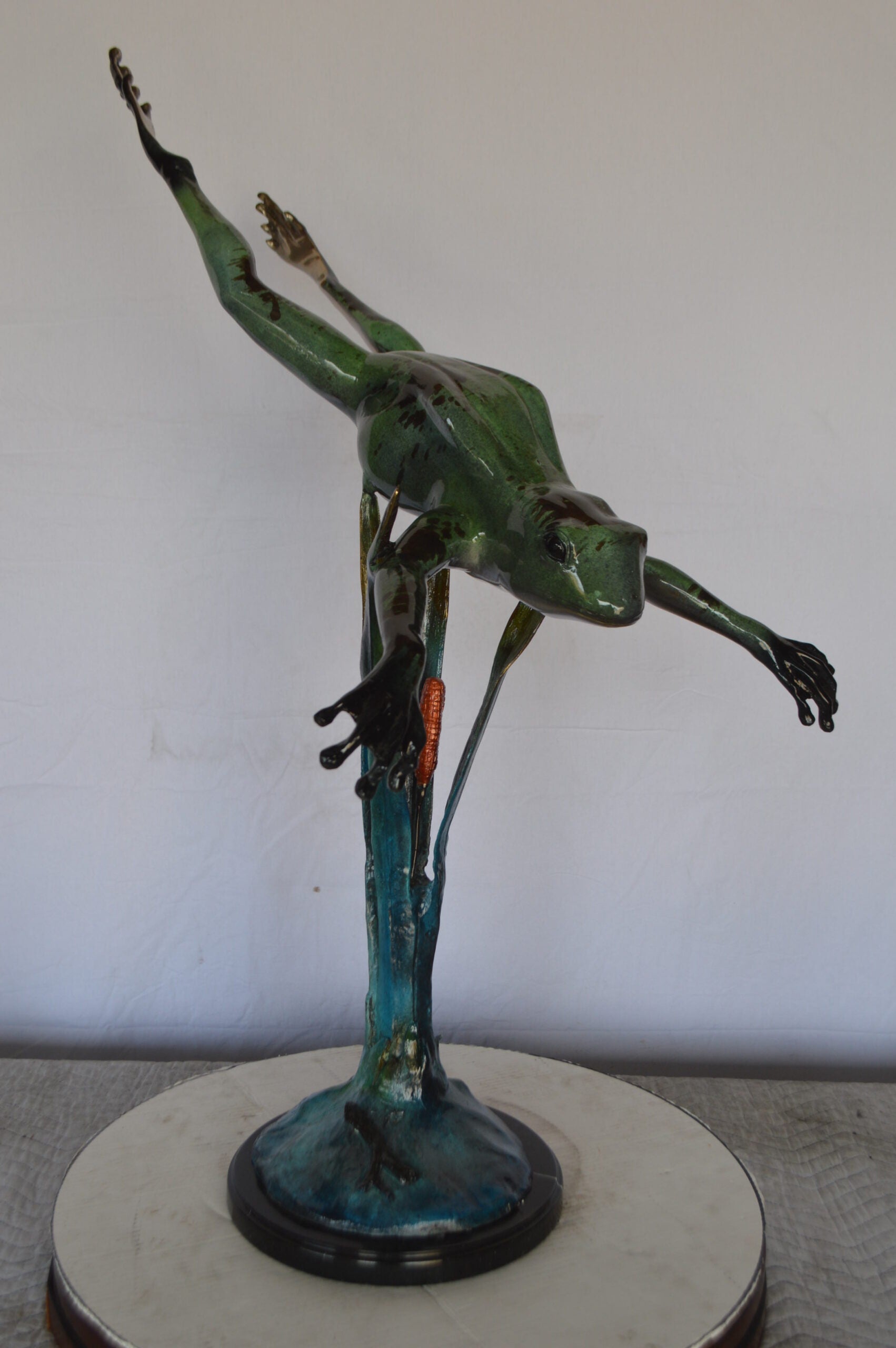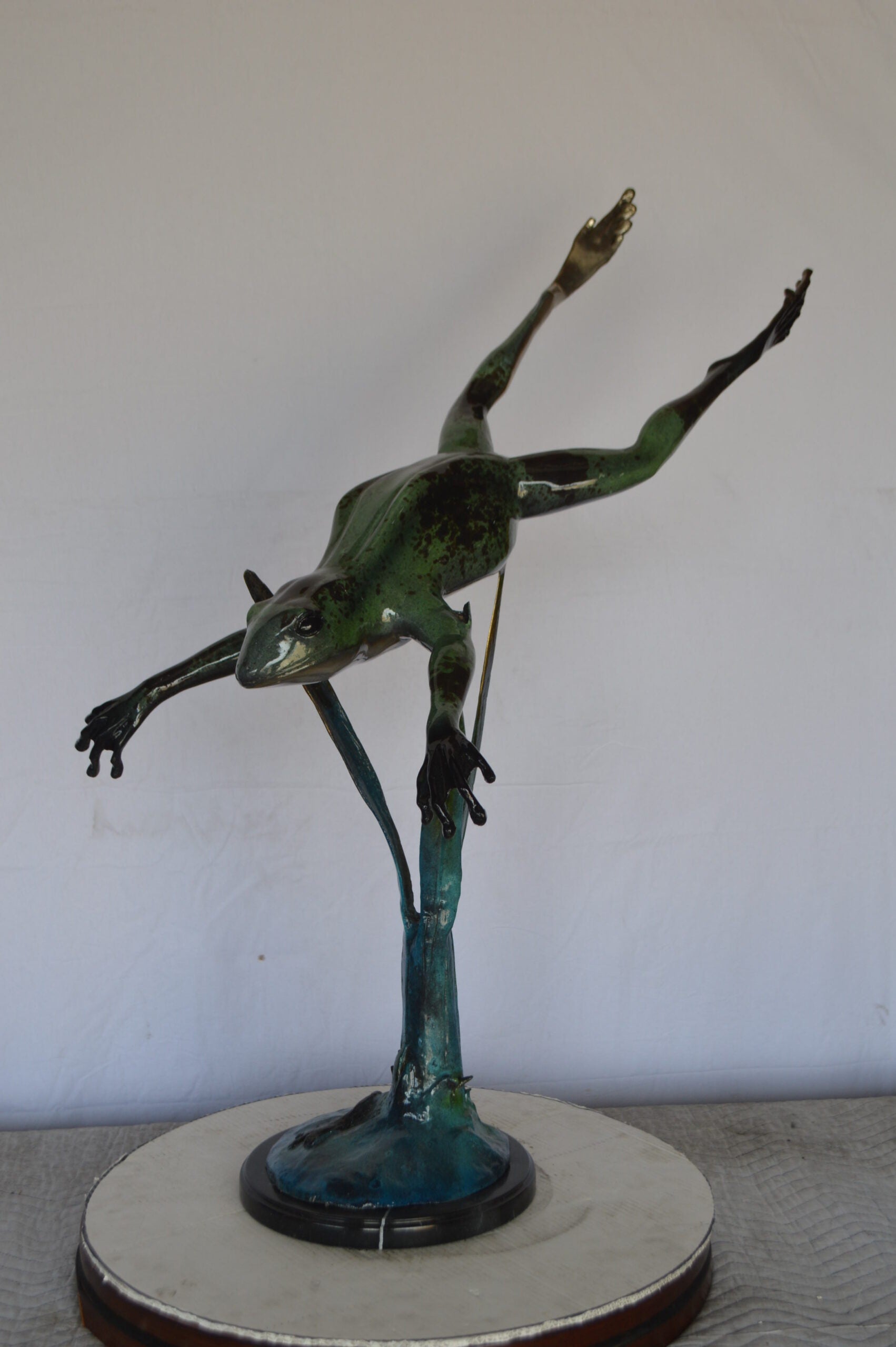 A beautiful large jumping frog statue featuring in a natural form a frog in action. A timeless Creation in lost wax cast bronze, with the most beautiful gallery quality finishing. The patina chosen for this Timeless Creation is a mix of hand finishing with different colors and Polychrome techniques also referred to as enameling over bronze. This impressive Bronze Statue will be a permanent fixture on the grounds of your estate for years to come. Size: 29"L x 21"W x 40"H. Weight is: 30Lb
