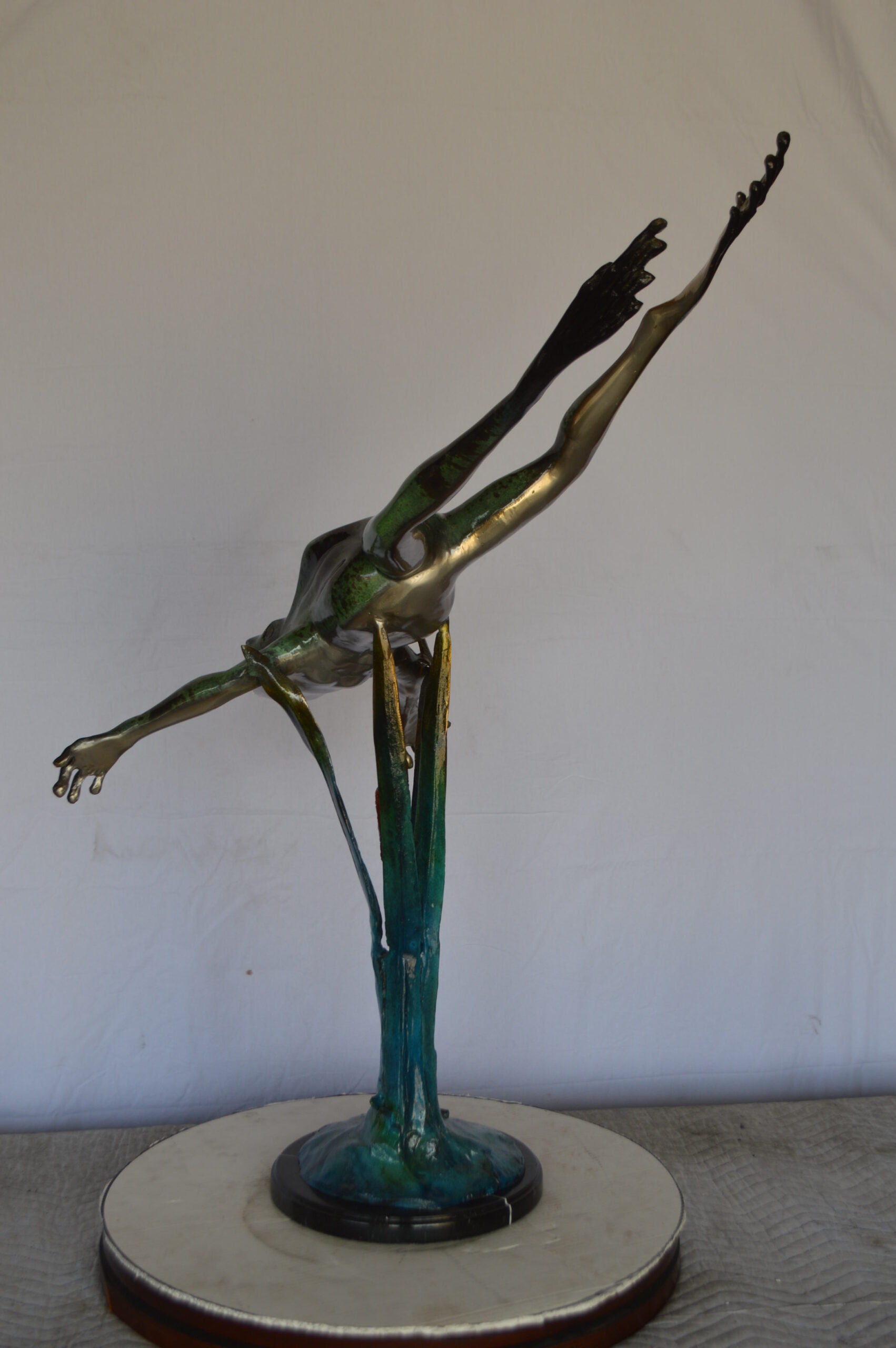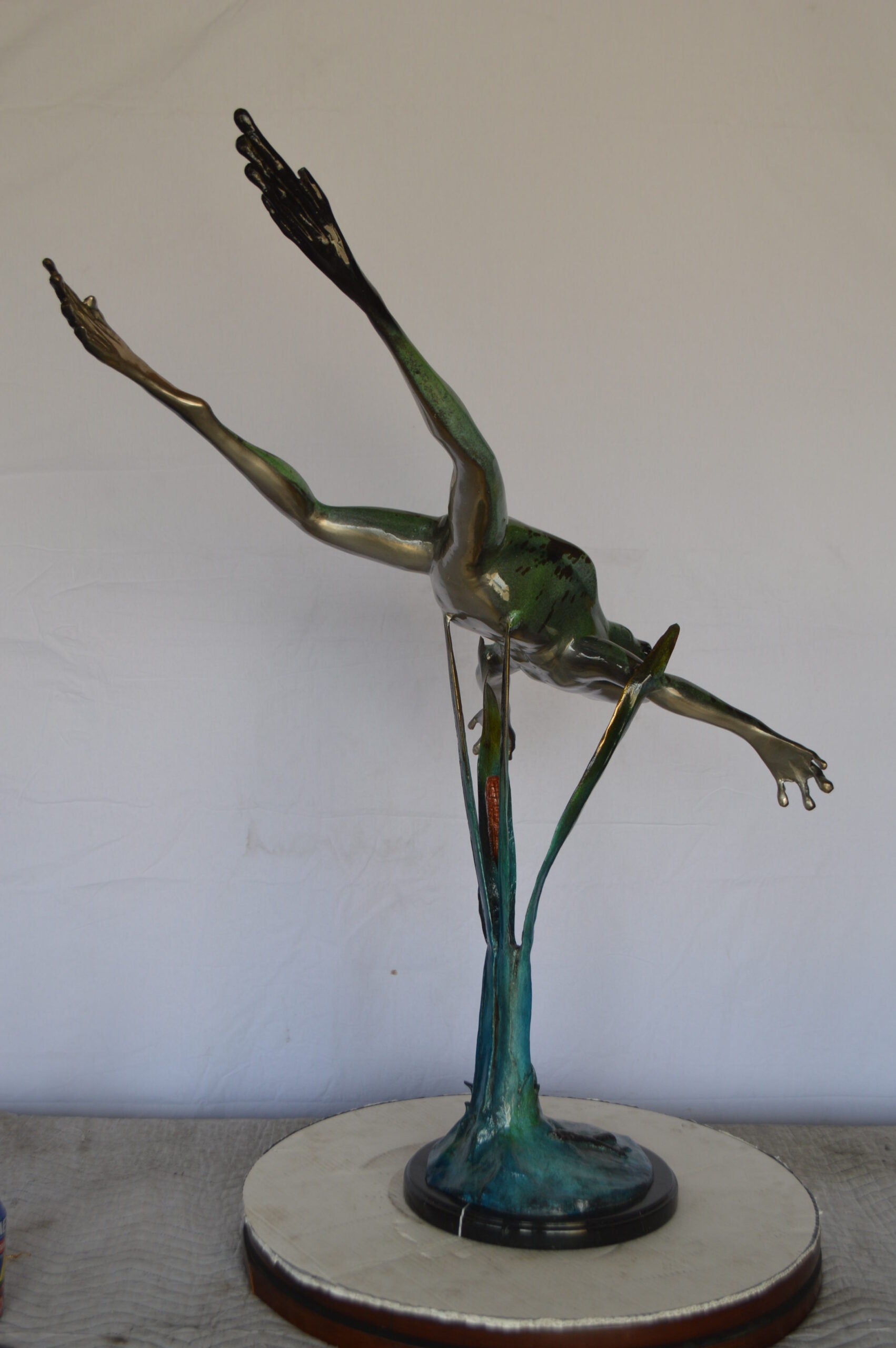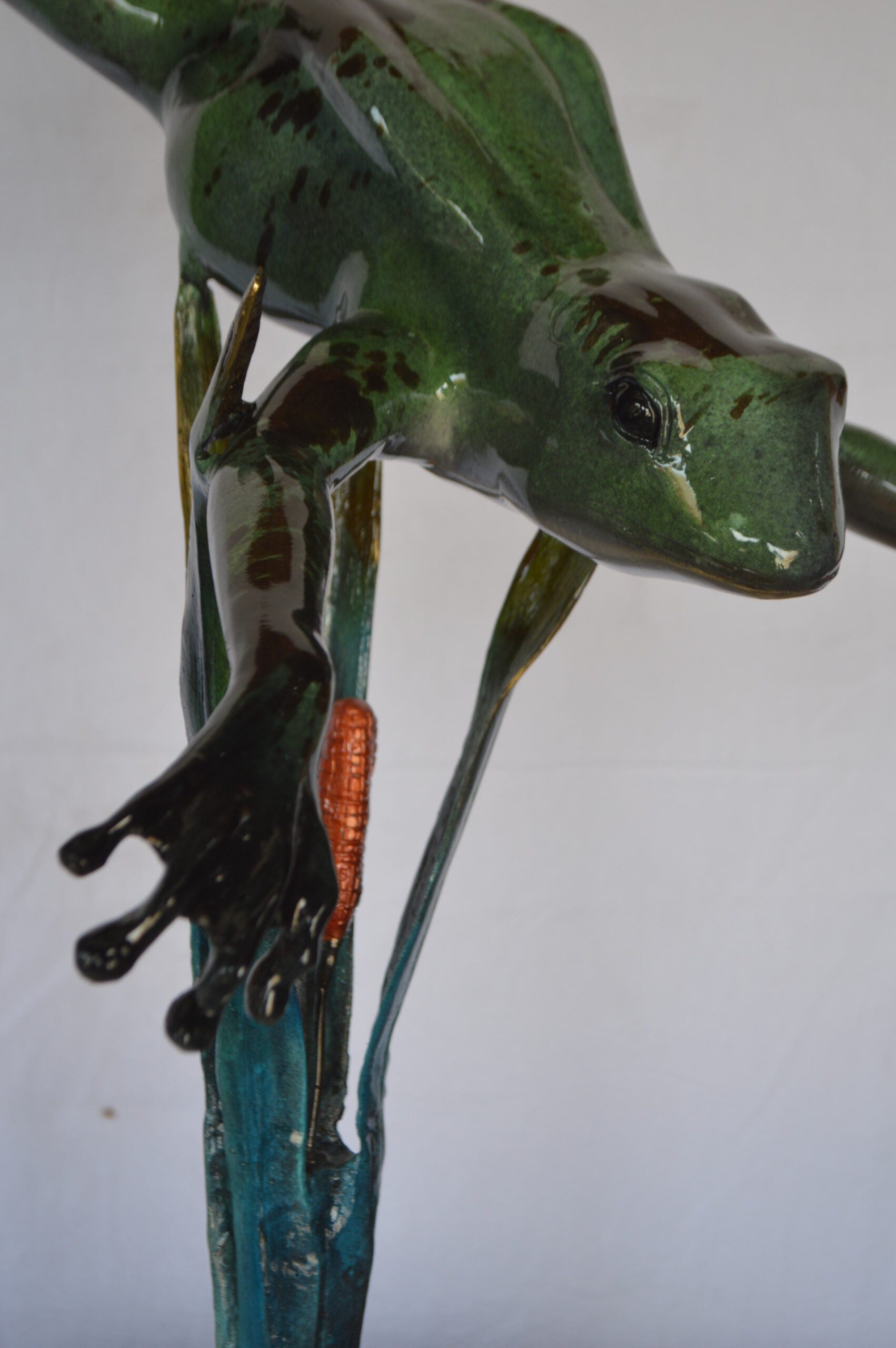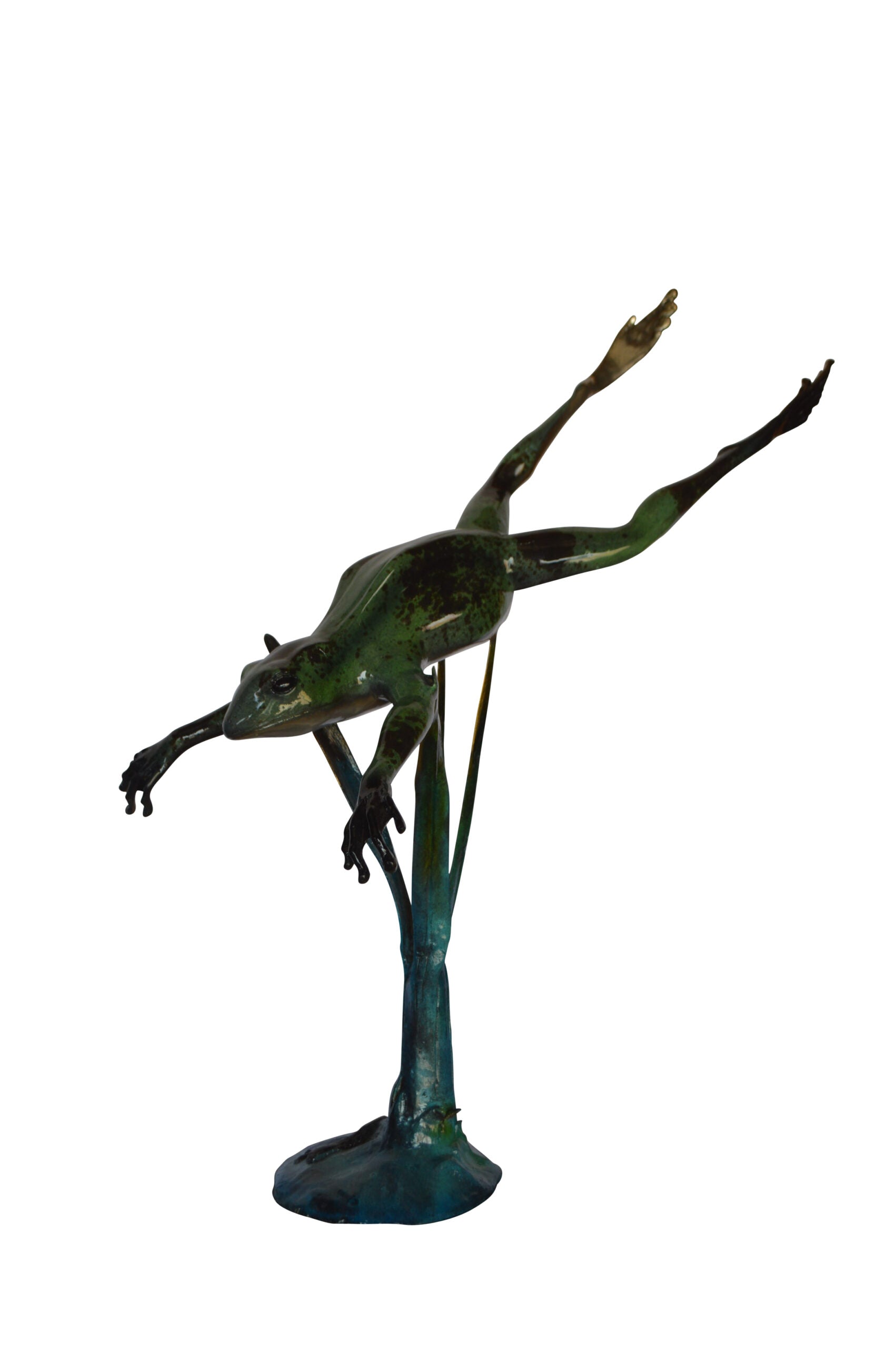 A beautiful large jumping frog statue featuring in a natural form a frog in action. A timeless Creation in lost wax cast bronze, with the most beautiful gallery quality finishing. The patina chosen for this Timeless Creation is a mix of hand finishing with different colors and Polychrome techniques also referred to as enameling over bronze. This impressive Bronze Statue will be a permanent fixture on the grounds of your estate for years to come. Size: 29"L x 21"W x 40"H. Weight is: 30Lb