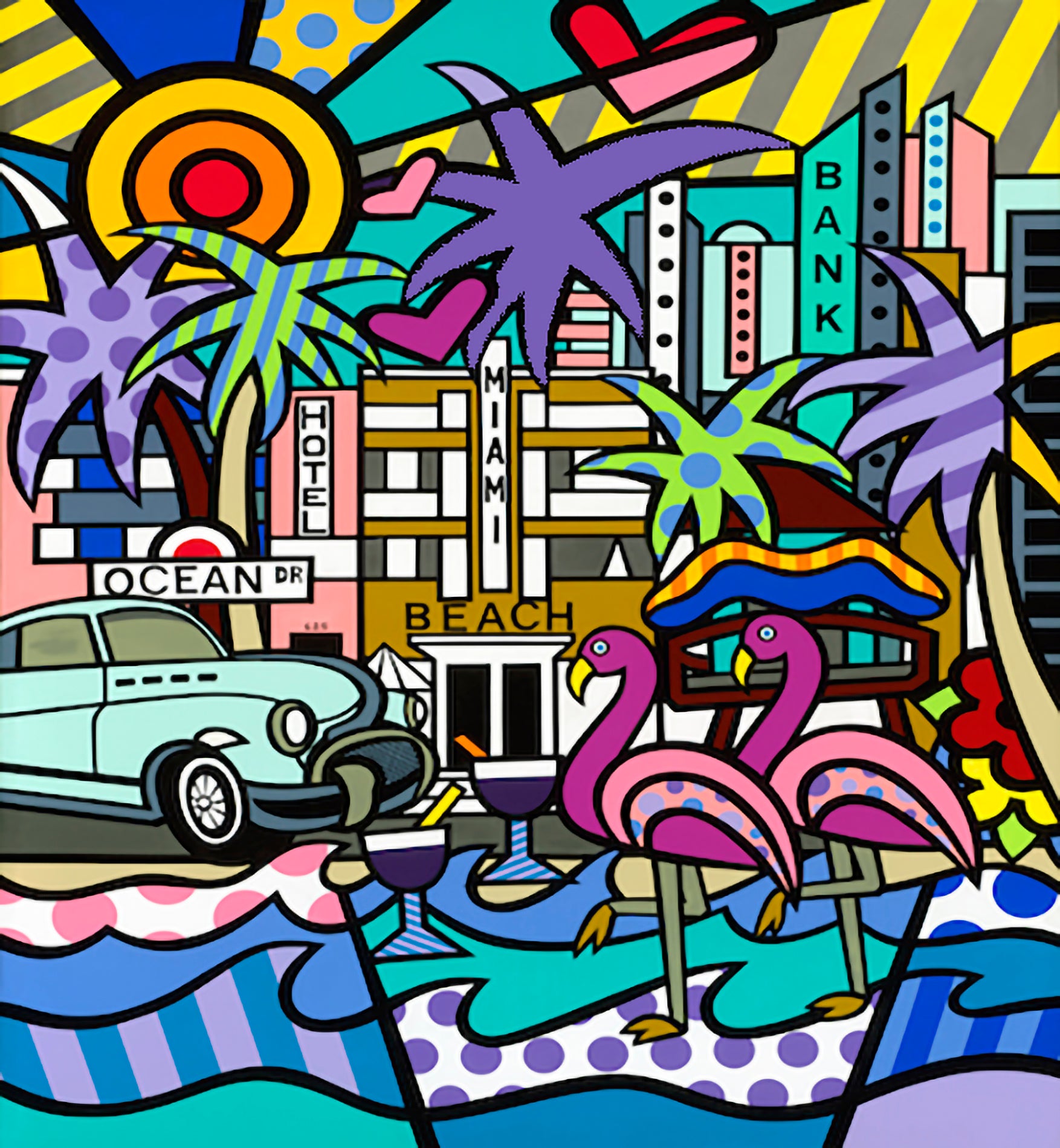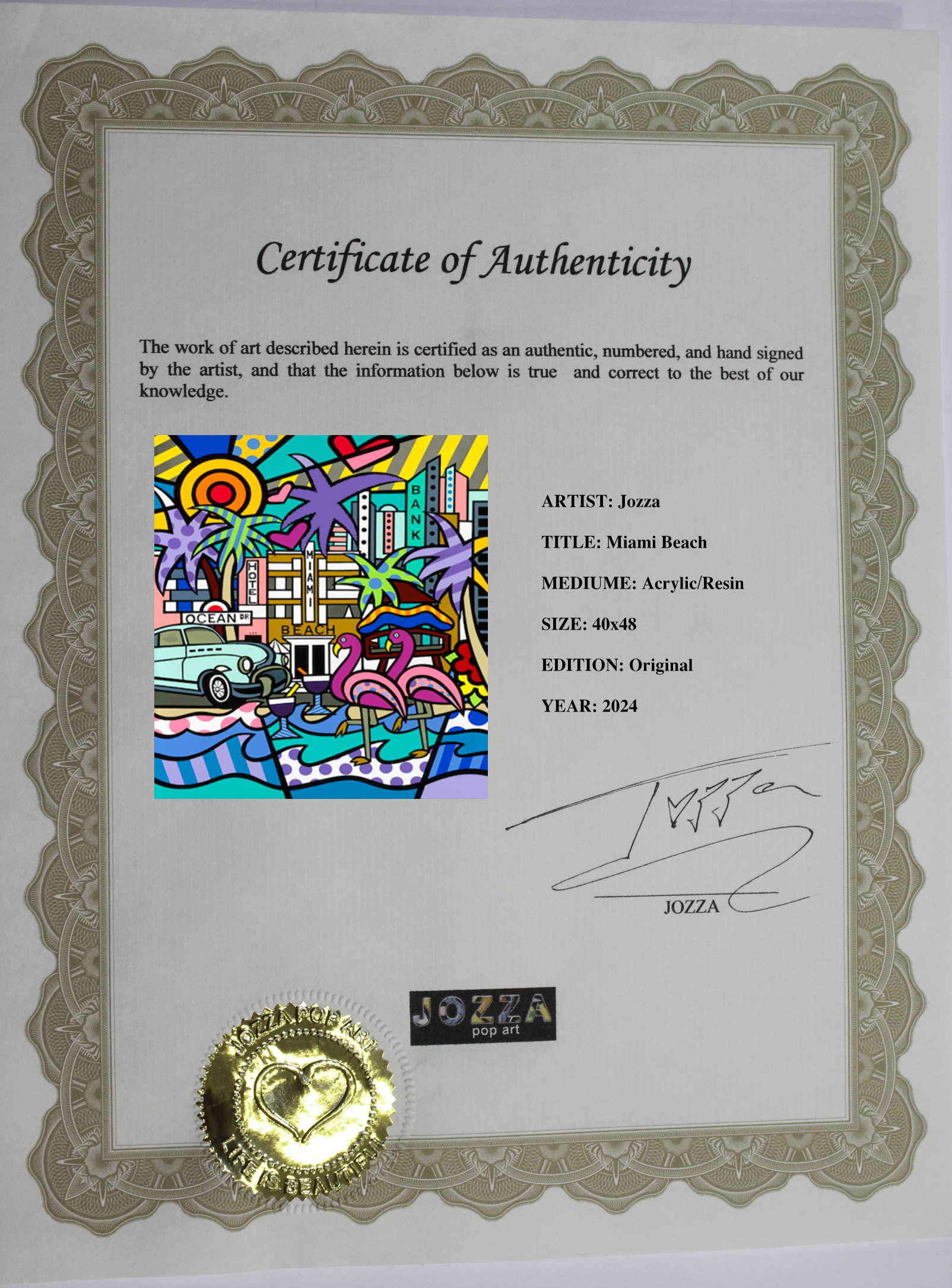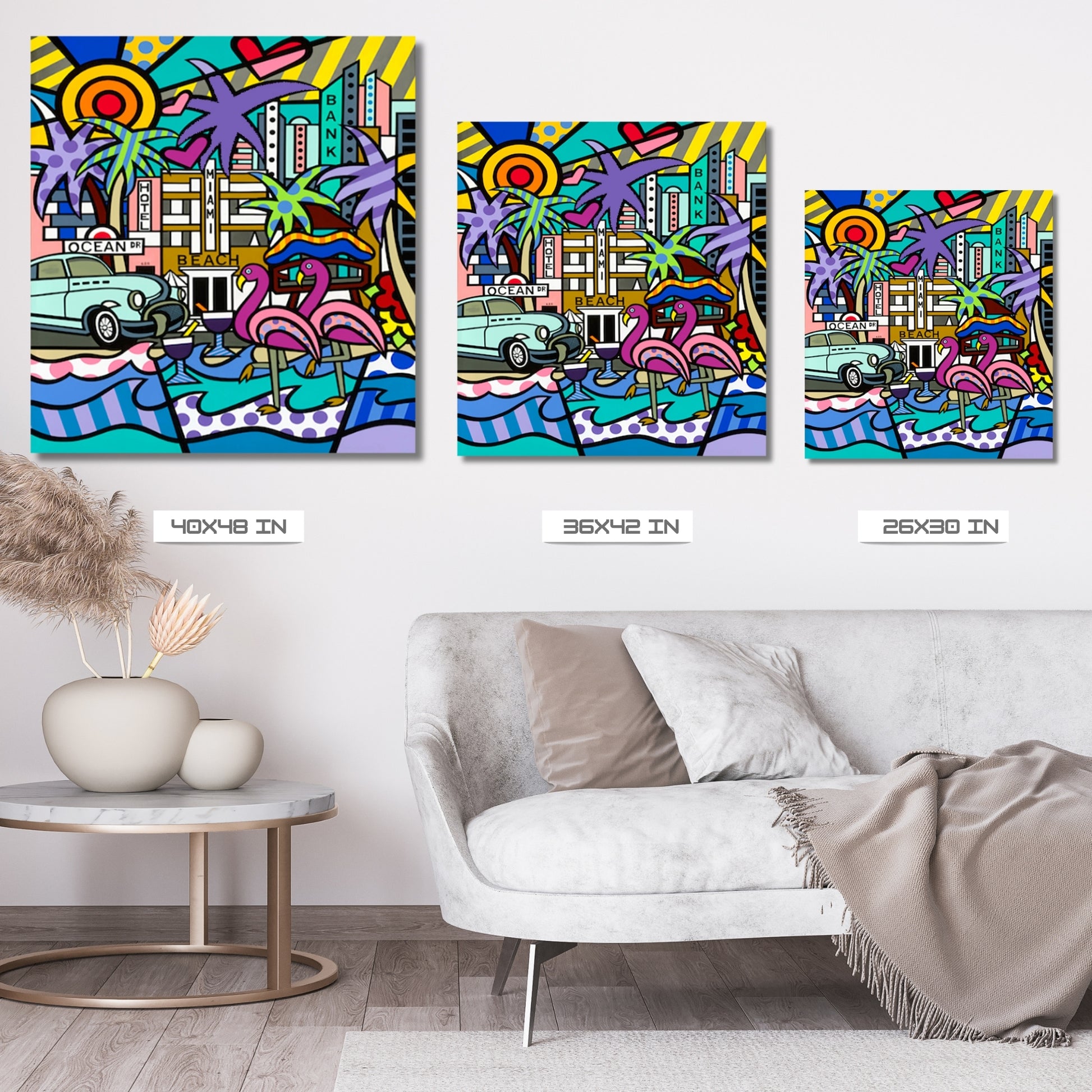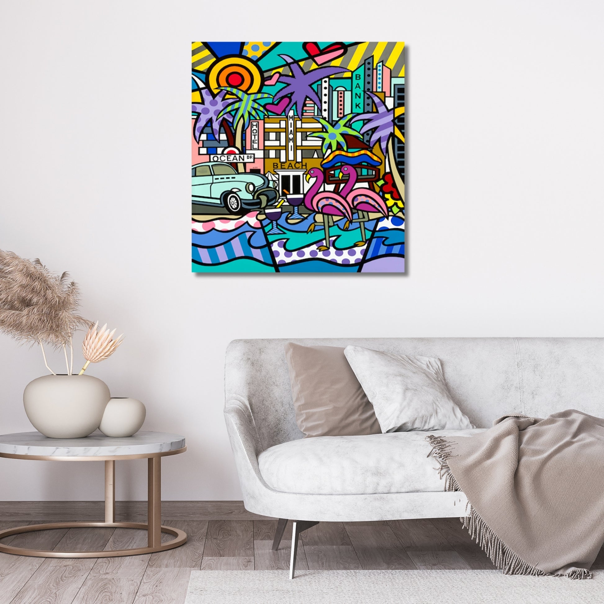 Miami Beach, A Wall Art Painting by Jozza, Original Acrylic print on Canvas, hand signed and numbered by the artist. Jozza, born in 1958 in Hidrolandia, a small town located in central Brazil, one of the most exciting Pop Artists in the world today, creates his artistic vision with vibrant imagery and combinations of bright color and hard-edged abstract subjects. This artwork comes gallery wrapped, stretched ready to hang Size: 40"L x 48"W x 1"H. Weight is: 6Lb
