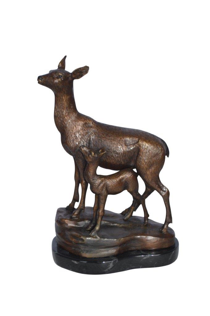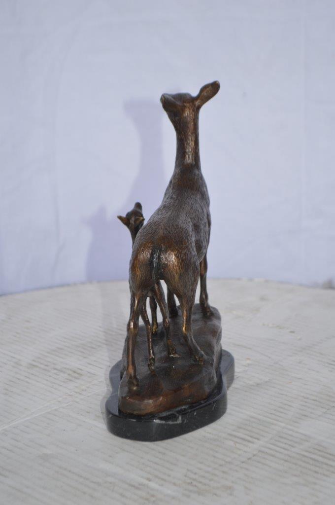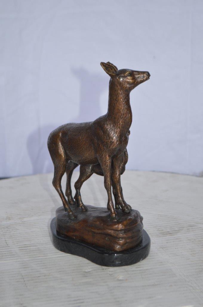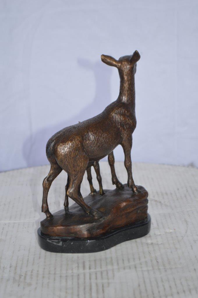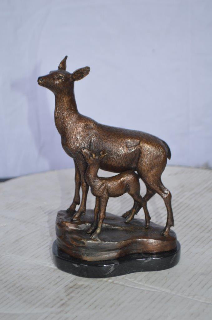 This bronze statue presents a mother deer and her fawn. Any fan of bambi will recognize the beauty in these two deer as they stare off into the distance, alert and curious. This beautiful bronze sculpture is great for anybody who appreciates the natural world or these beautiful animals. Size: 6"L x 4"W x 9"H. Weight is: 4Lb