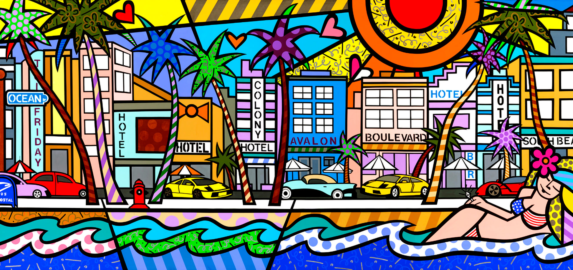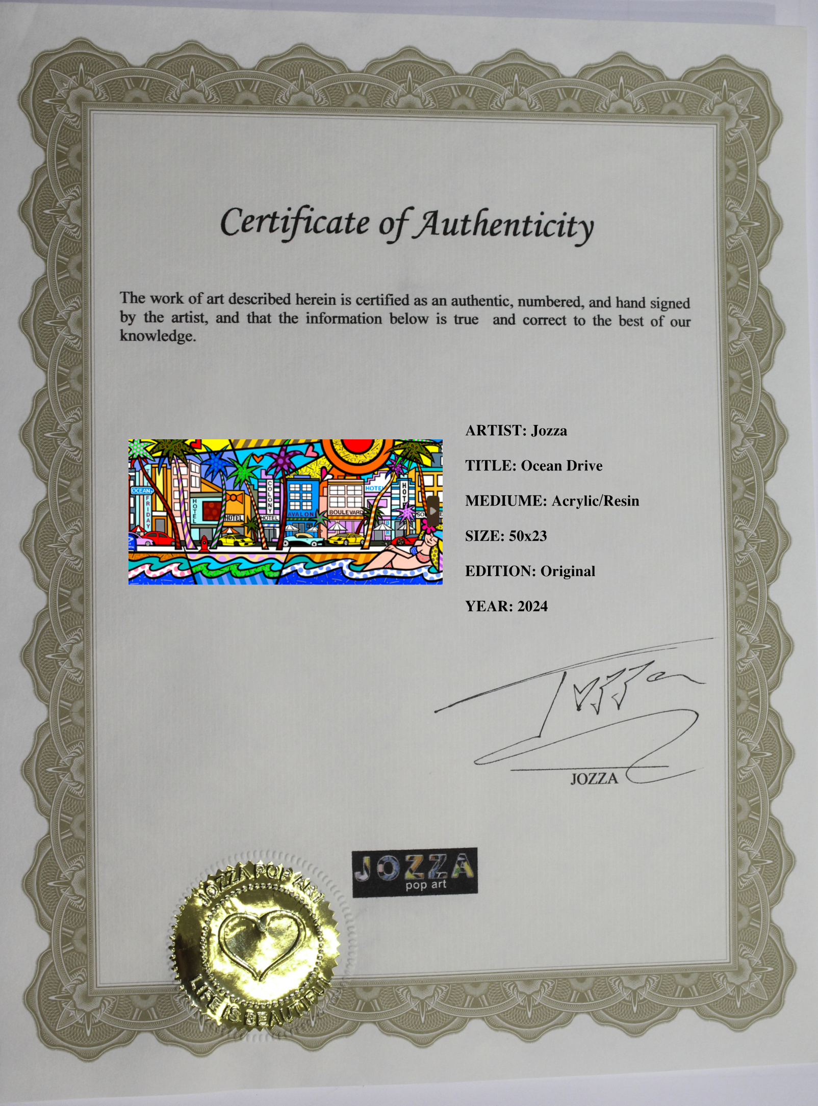 Ocean Drive, A Wall Art Painting by Jozza, Original Acrylic print on Canvas, hand signed and numbered by the artist. Jozza, born in 1958 in Hidrolandia, a small town located in central Brazil, one of the most exciting Pop Artists in the world today, creates his artistic vision with vibrant imagery and combinations of bright color and hard-edged abstract subjects. This artwork comes gallery wrapped, stretched ready to hang Size: 50"L x 23"W x 1"H. Weight is: 7Lb