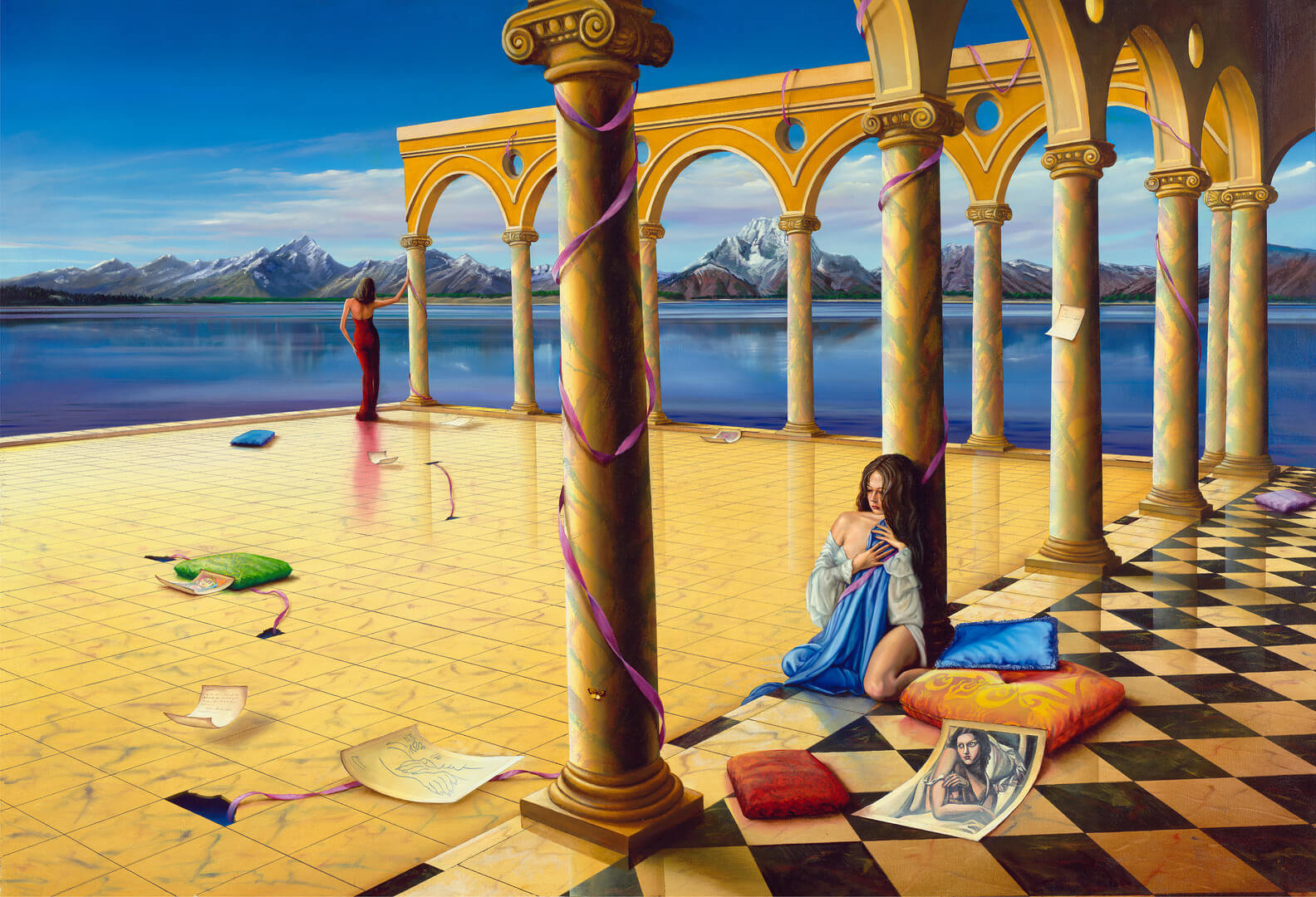 This painting done by Orlando Quevedo, titled Old Memories, incorproates magical realism. From the mountains in the background to the anceitn pillars the woman sits against solemnly, Quevedo did not spare any detailing or creativity in this piece. This piece would be a great addition in any room of your home or office in need of some pure and unique art. Size: 20"L x 15"W