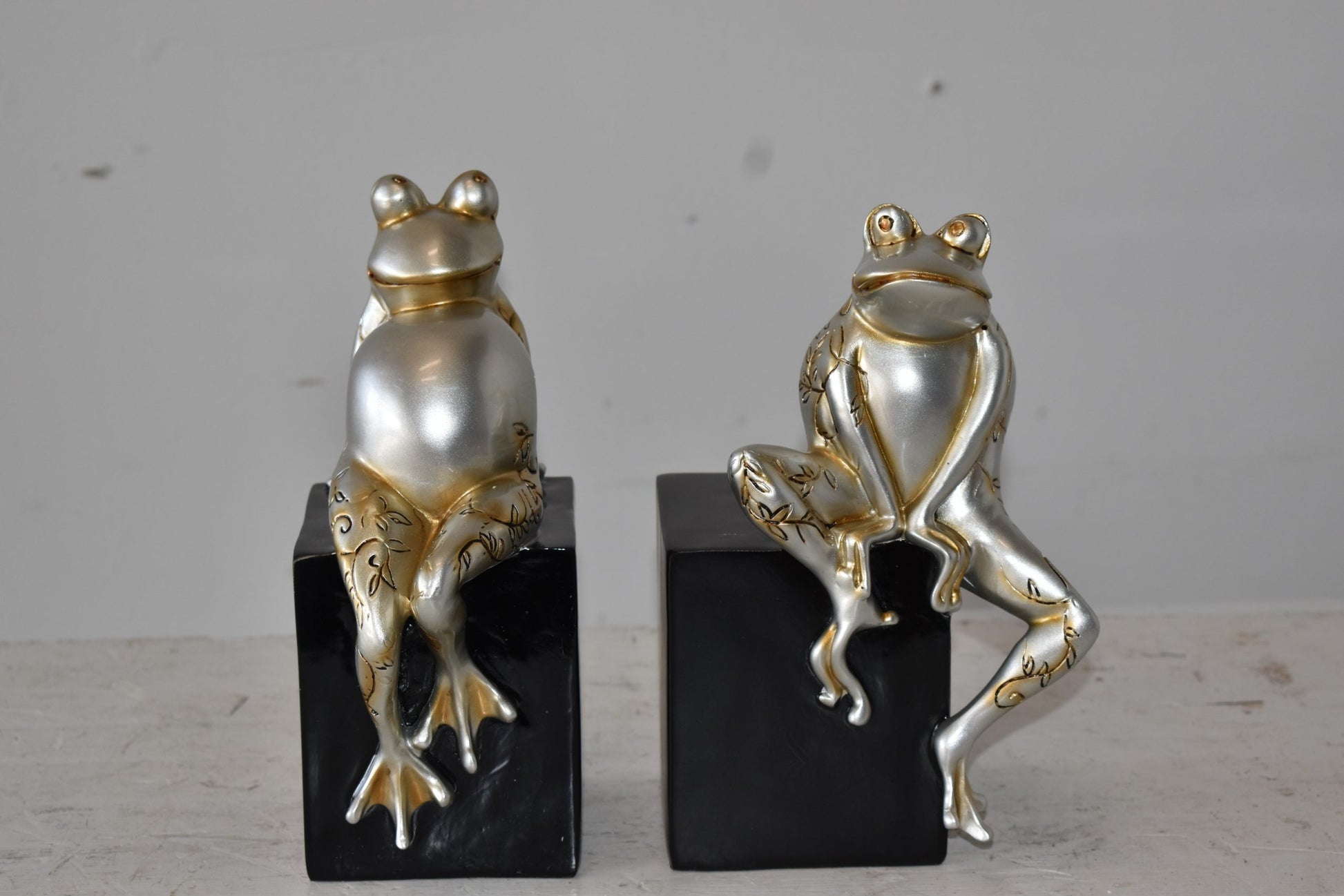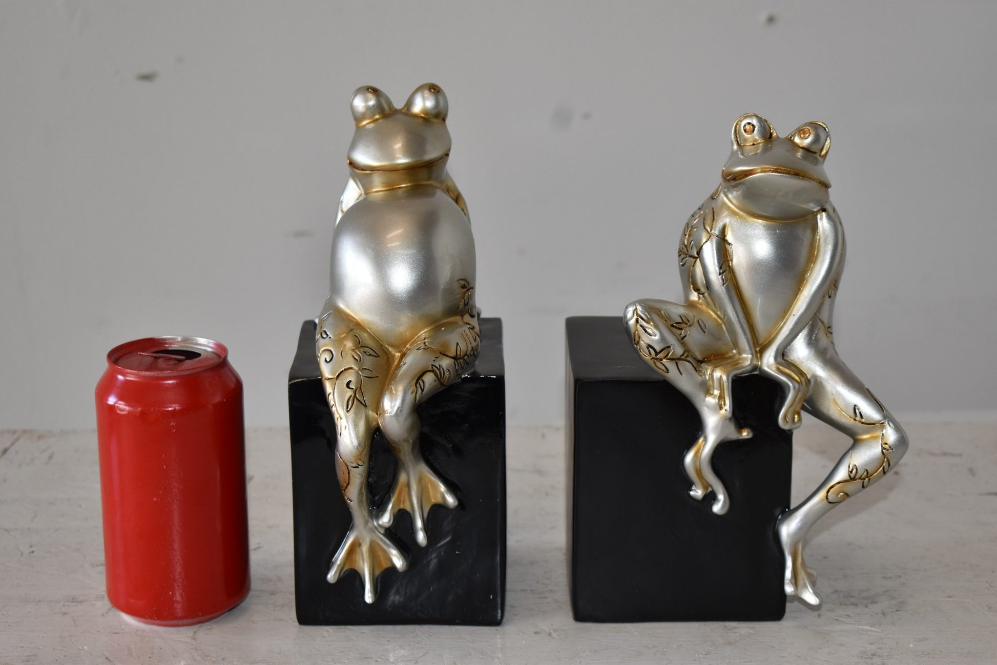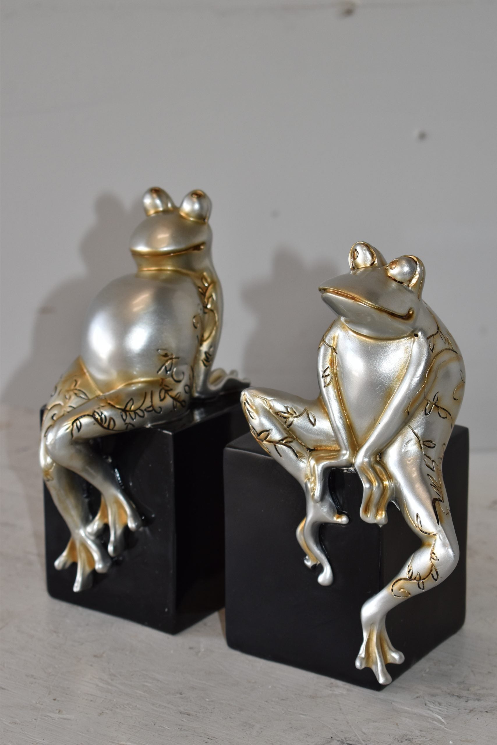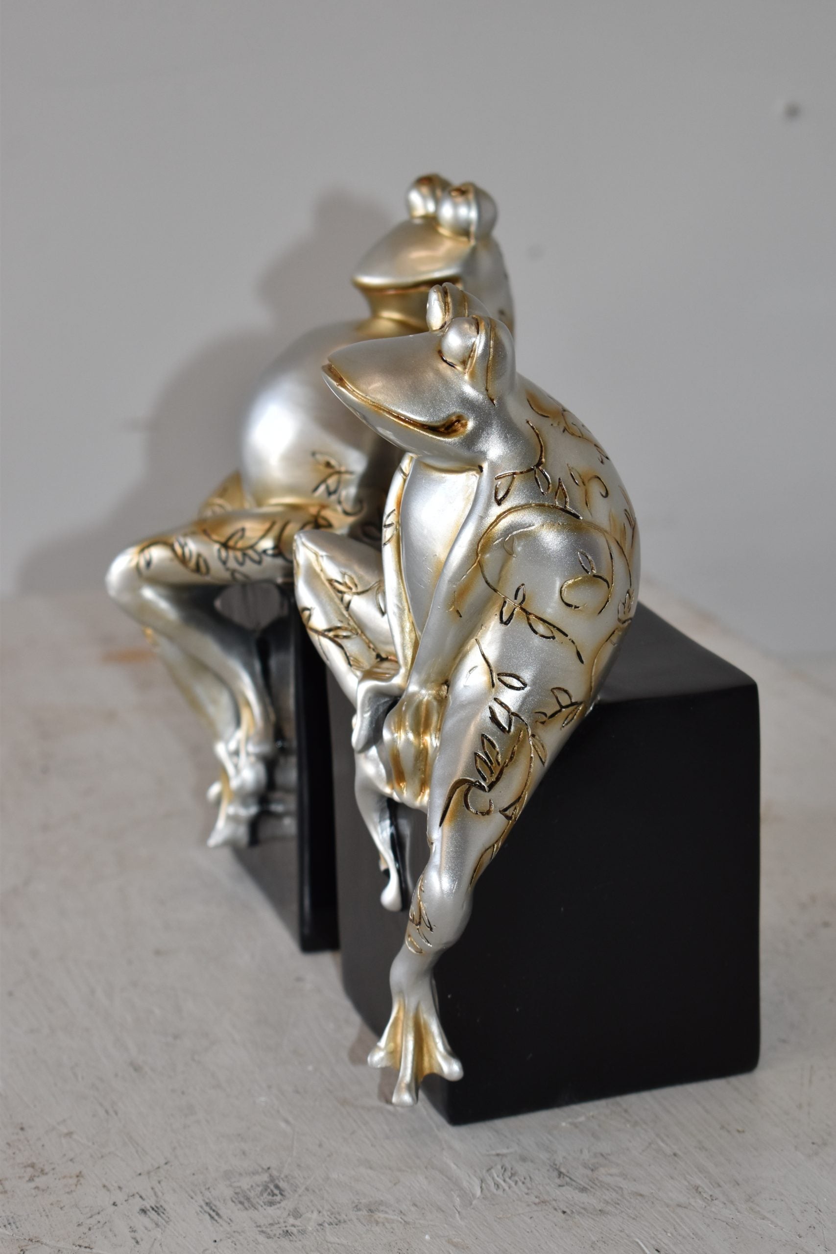 These resin statues of a pair of frogs sitting on a cube are artistic in style and humor. The pieces would stand out in any room and catch the eyes of any viewer, making it a great addition for any space. This bronze statue is a perfect fit for any art or music lover's home. Some people my use it for decoration and other will use it as a funny book stopper Size: 6"L x 4"W x 9"H. Weight is: 4Lb