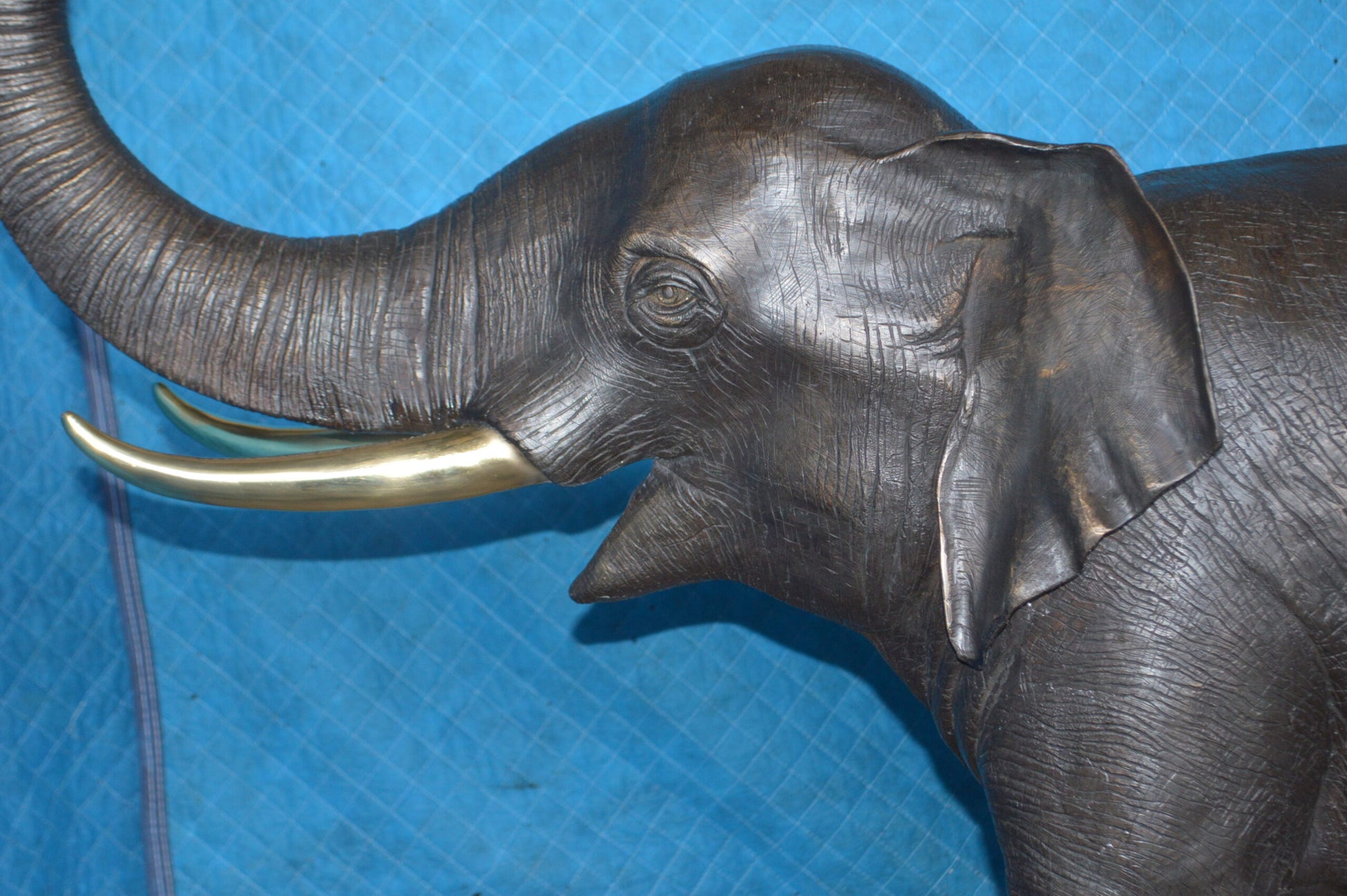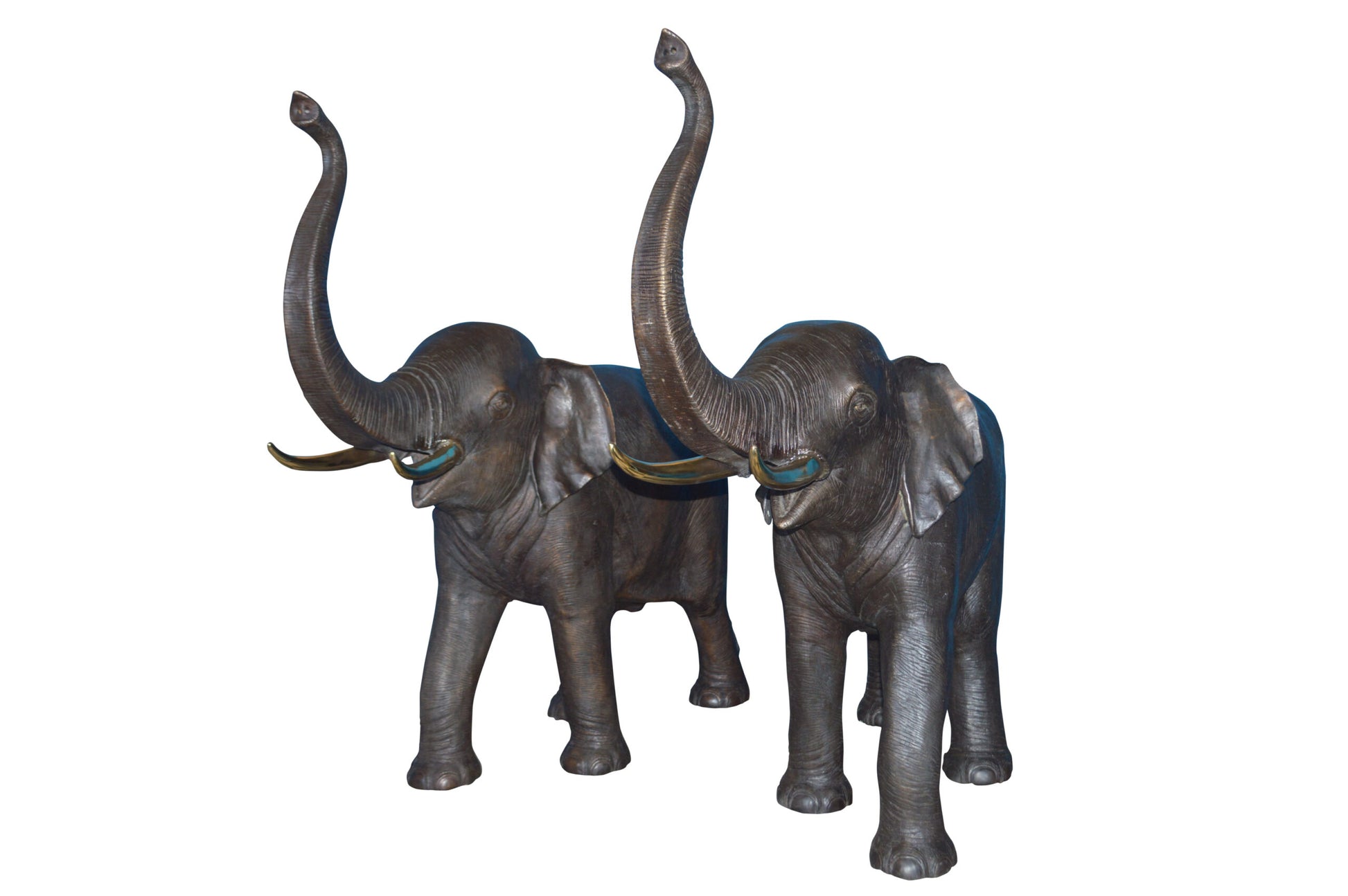A pair of large Elephant statues - Fountain look ready to march out of the pond. It looks that real with the detailing that is found from the texture of the hide of the elephant to the face and trunk, the details make these bronze pieces. The statues are equipped with a hose that leads water out of the elephant trunk, with the use of a fountain pump (pump is not included).The figures feature are from pure bronze that has been crafted to create aged, weathered nuance. This sculpture would be a great addition to your patio, garden, lawn, or anywhere else. Size: 55"L x 17"W x 53"H. Weight is: 316Lb