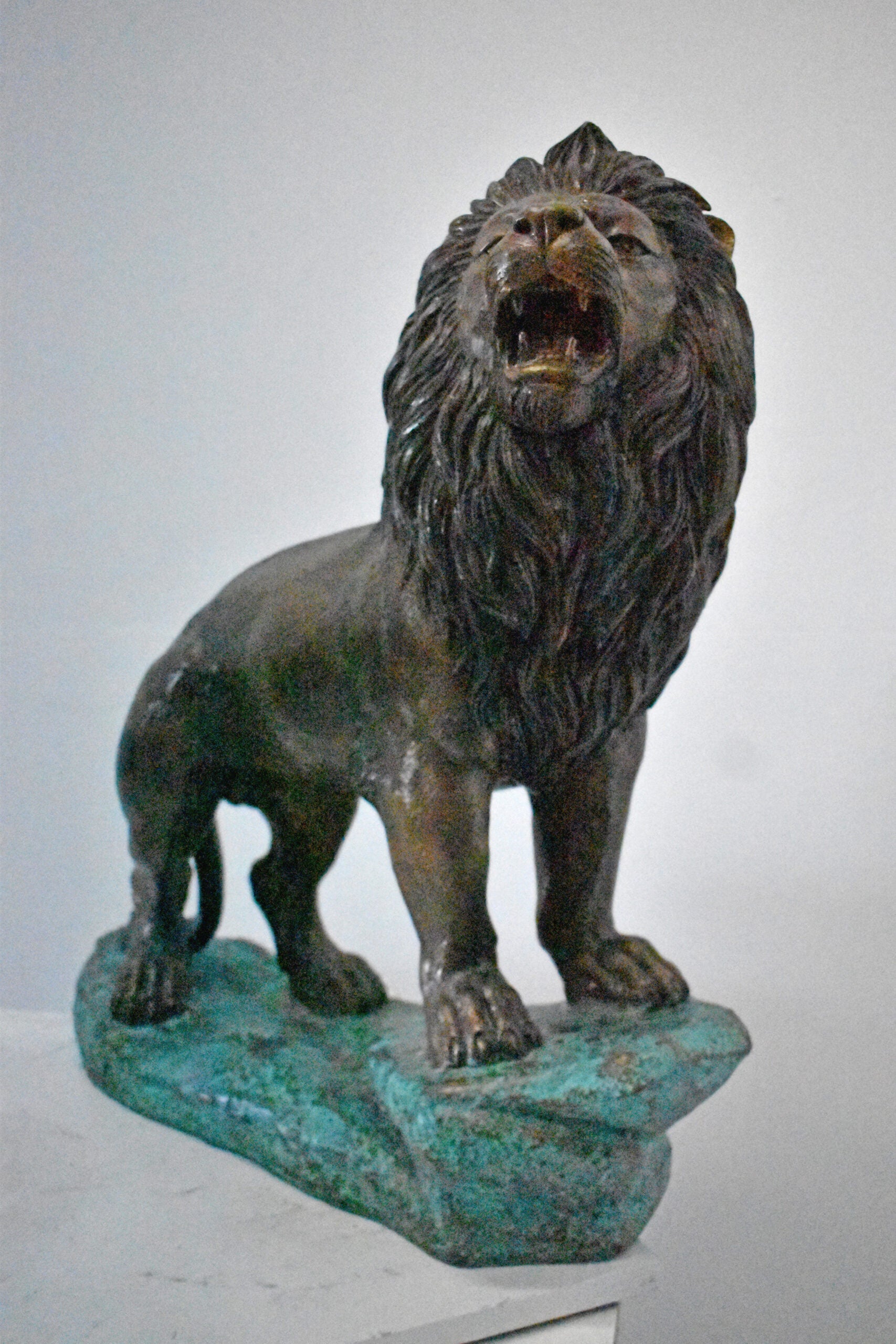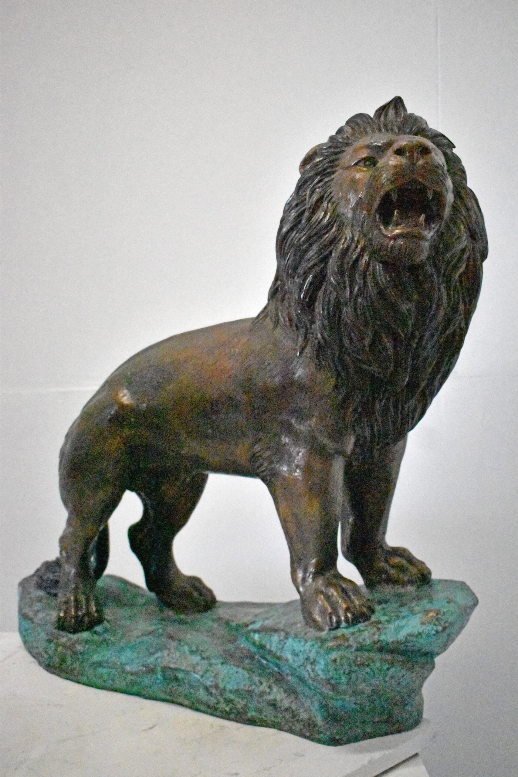 These two large size lions are pridefully standing, looking at their kingdom and growling. Their gorgeous manes are hanging down their body with exquisite details, giving them a particularly majestic look. . The patina chosen for this timeless creation is in brown and green finish. These two are true examples of two pieces of museum quality hand-casted bronze using the Lost Wax Process of bronze casting. Size: 26"L x 11"W x 25"H. Weight is: 42Lb