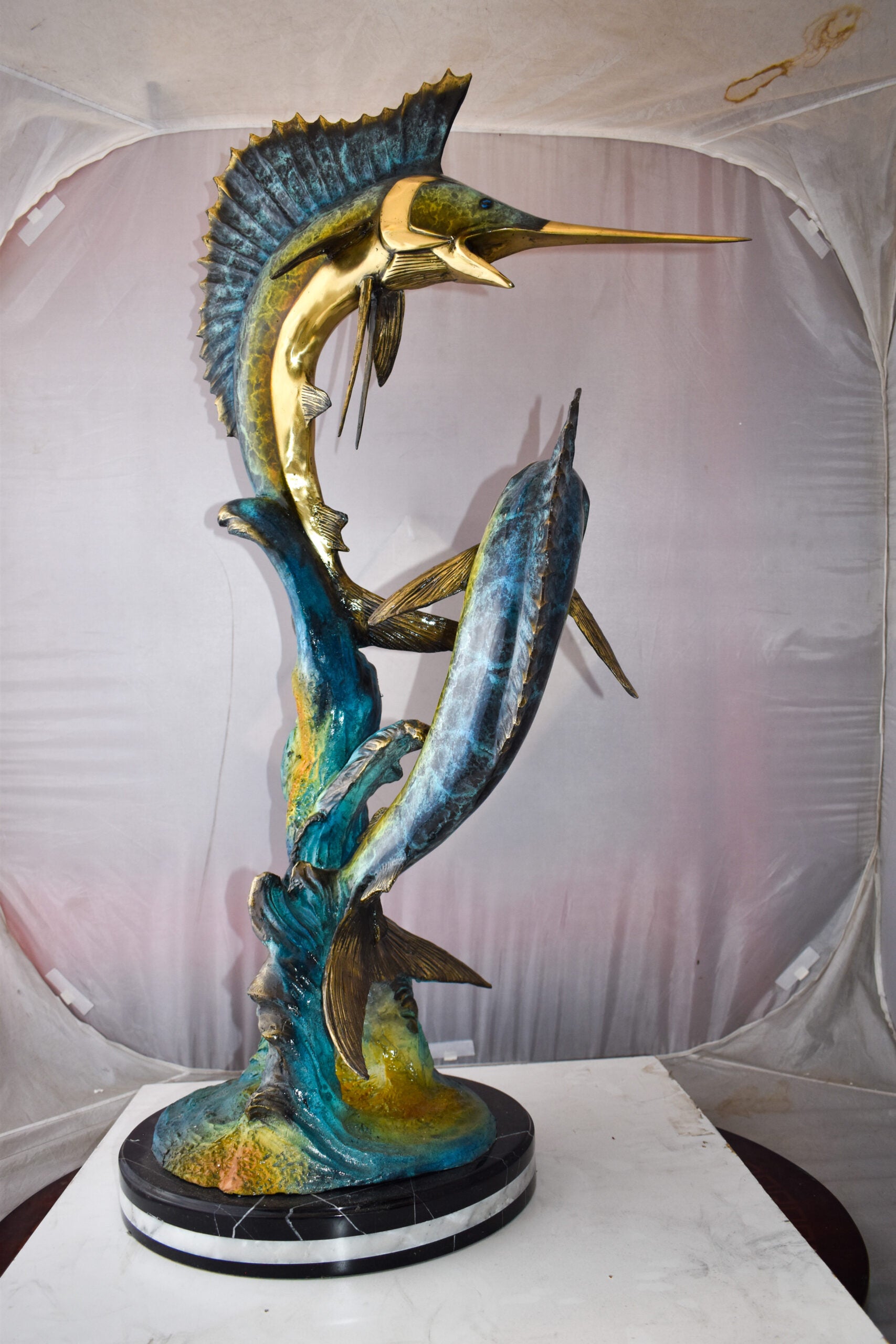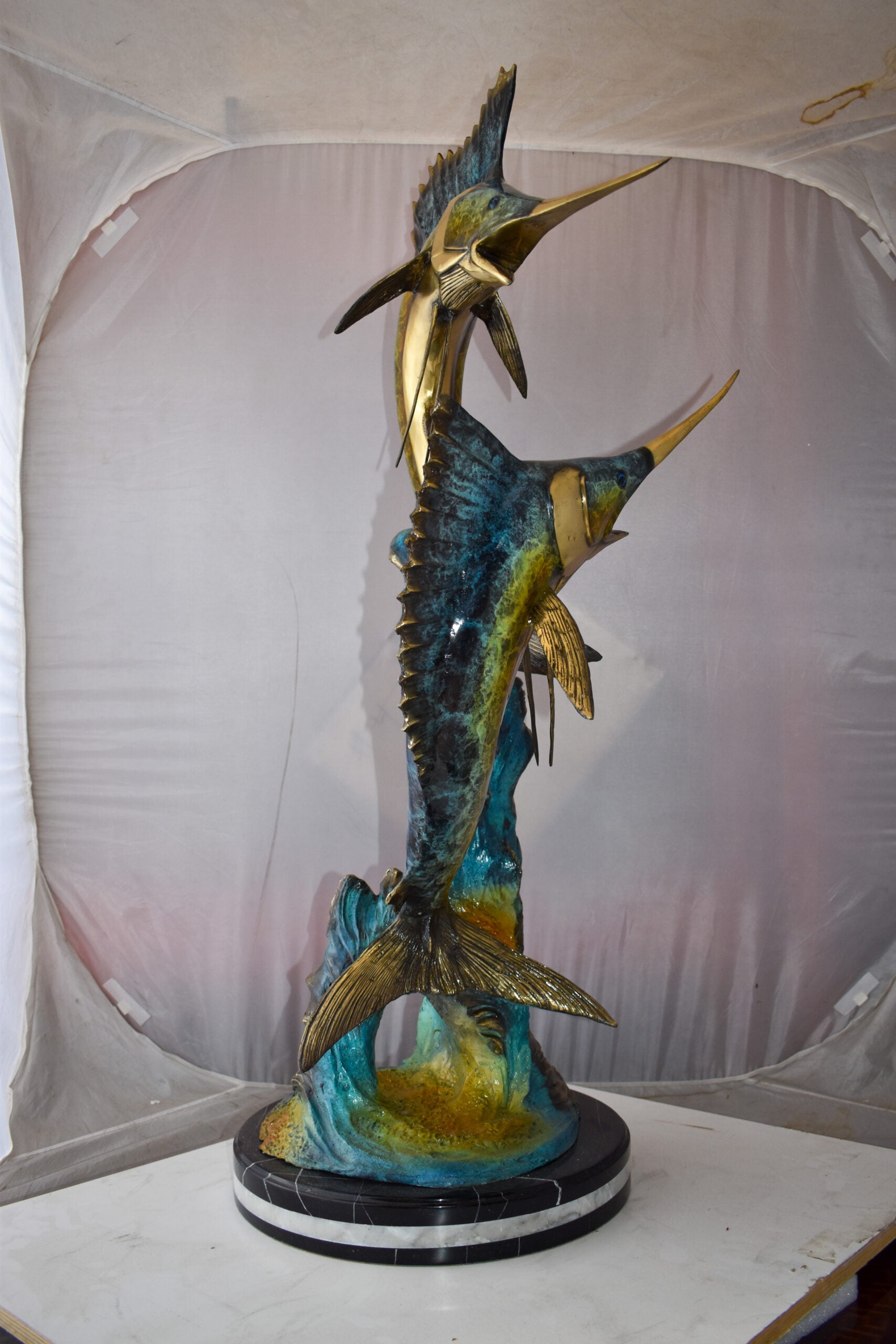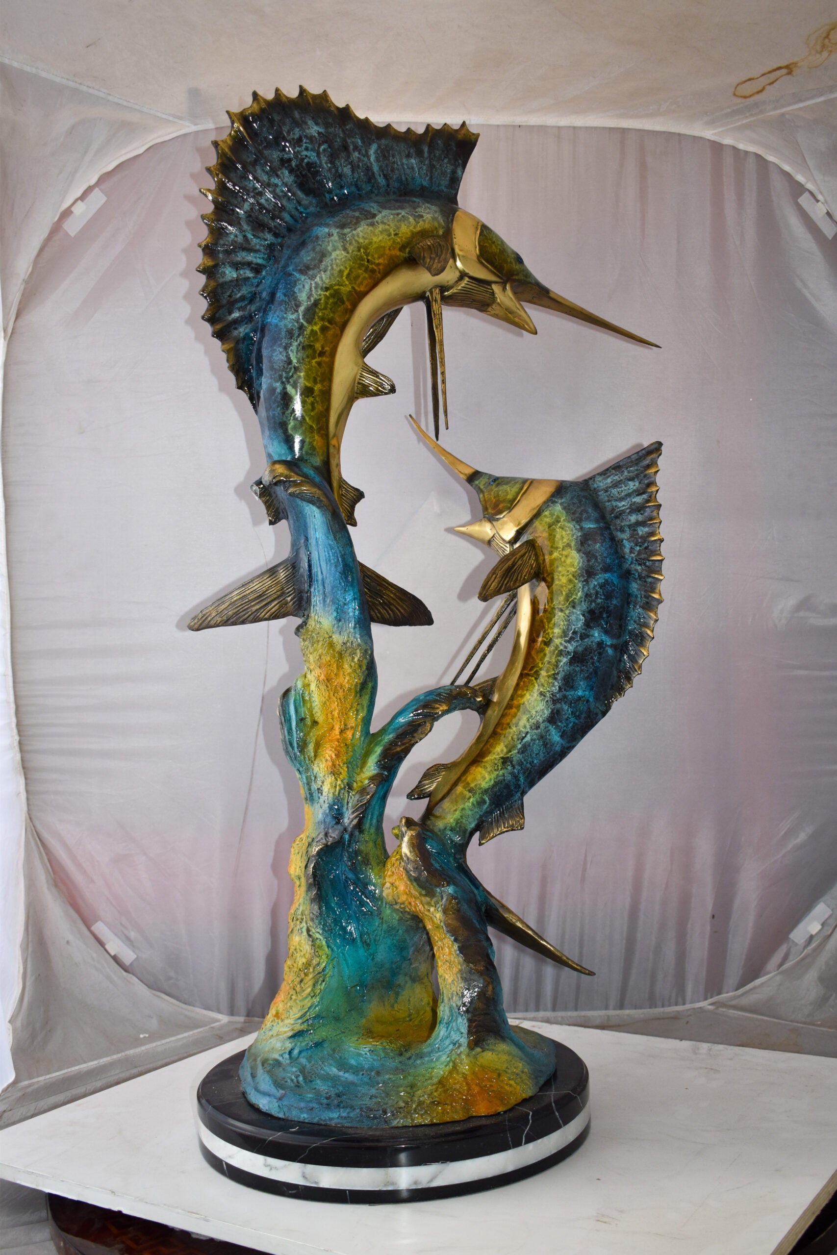 Set Of Intertwined Sailfish and Marlin Colored Bronze Statue 27" x 20" x 47"H