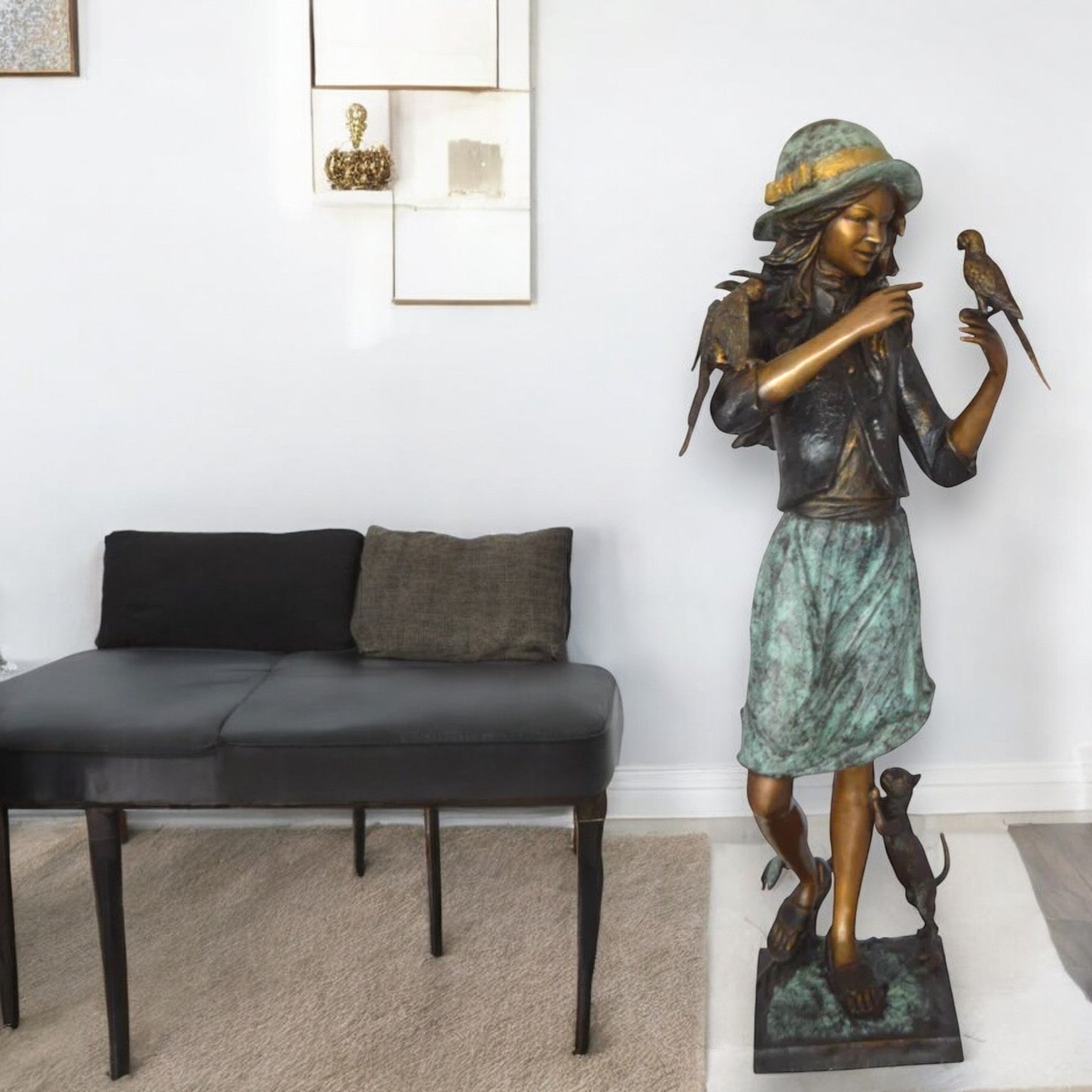 Standing girl with parrots Bronze Statue - Size: 15"L x 16"W x 41"H.
