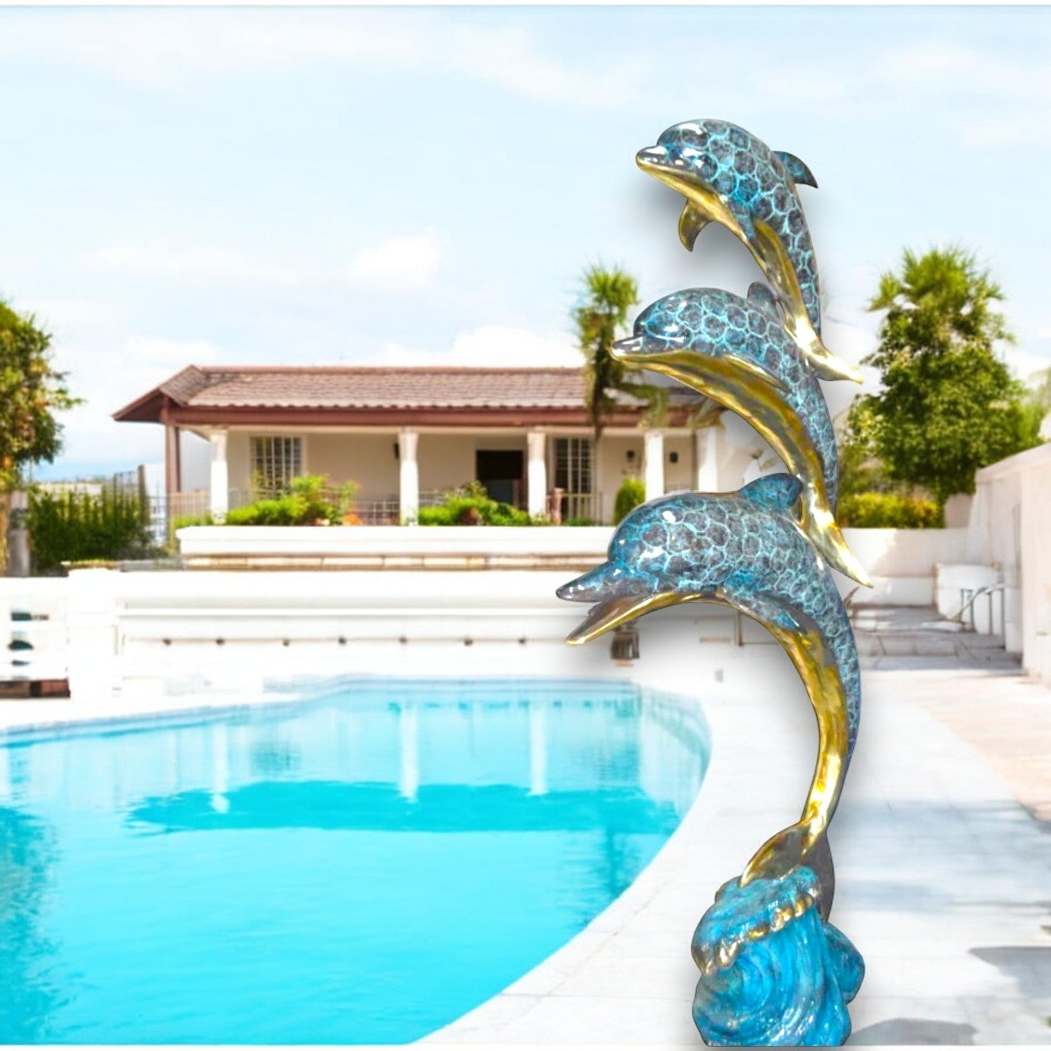 Surprise your garden guests with this large size outdoor Bronze fountain Statue of three Dolphins jumping out of the water. Each one of the dolphins is equipped with a hose that sprays water out of their mouth with the use of a fountain pump (pump is not included). Produced using superior quality bronze and a traditional casting method that yields pristine details. The patina chosen for this Timeless Creation is a mix of hand finishing with different colors and Polychrome techniques also referred to as enameling over bronze. This impressive Bronze Statue will be a permanent fixture on the grounds of your estate for years to come. Size: 28"L x 22"W x 89"H. Weight is: 190Lb