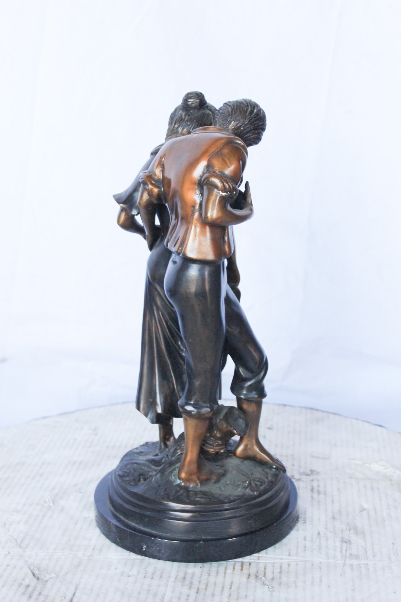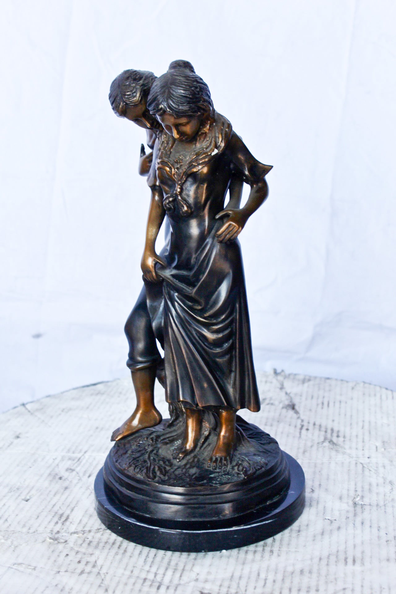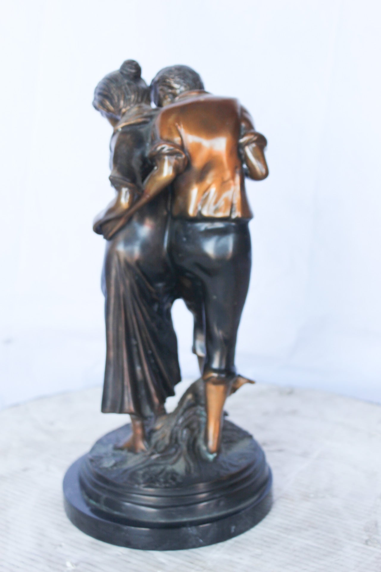 This bronze statue titled "Two shy lovers" illustrates in detail the connection and intimacy between two young individuals in love. Mounted on a marble base, the youg man gently holds the woman who keeps her beautiful and delicate dress off the ground. This gorgeous piece is a worthy purchase for anyone. Size: 8"L x 8"W x 15"H. Weight is: 8Lb