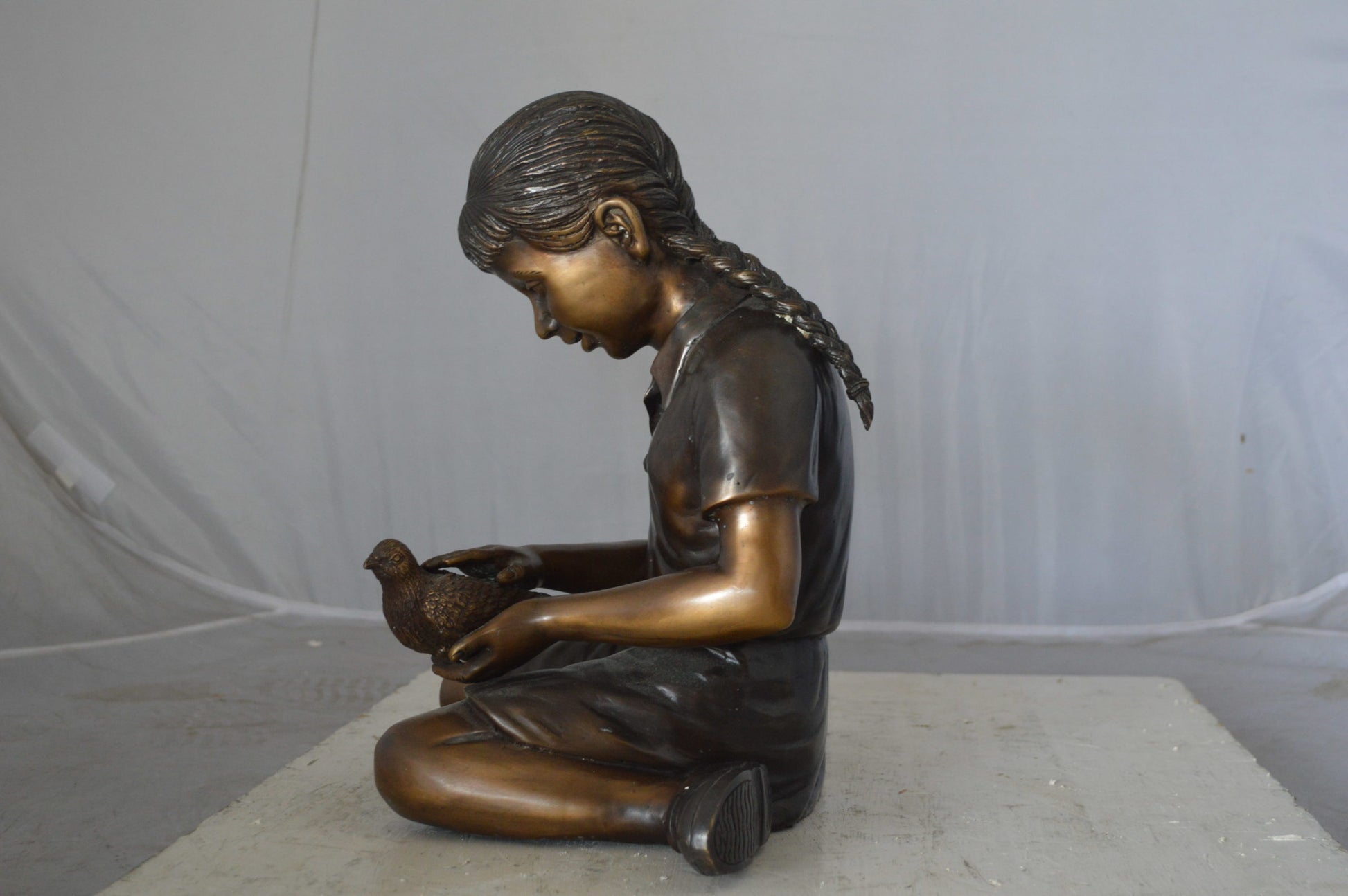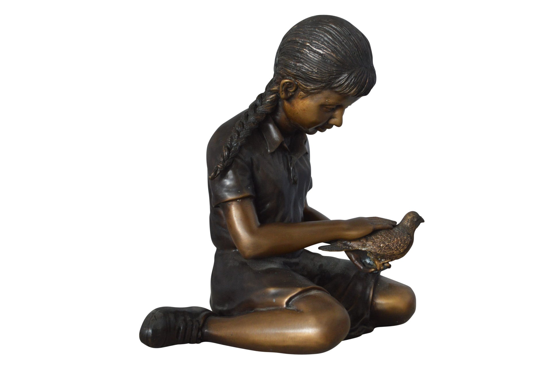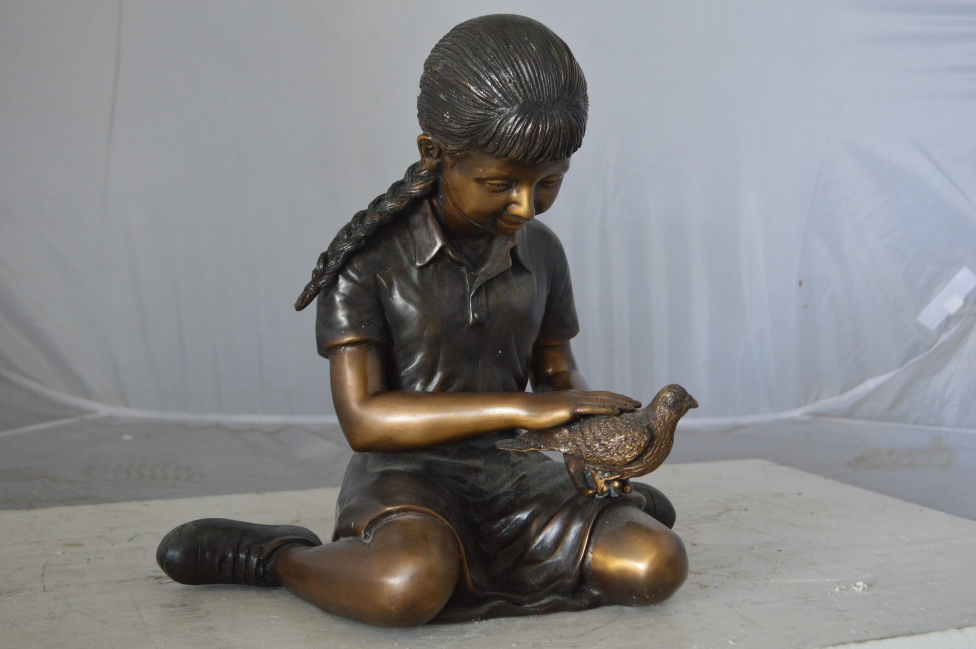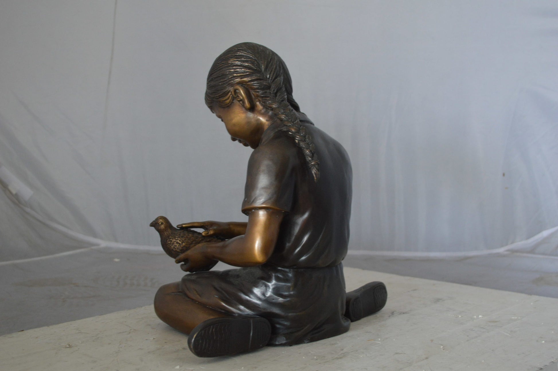 Young seated girl with bird bronze statue - Size: 12"L x 9"W x 14"H.