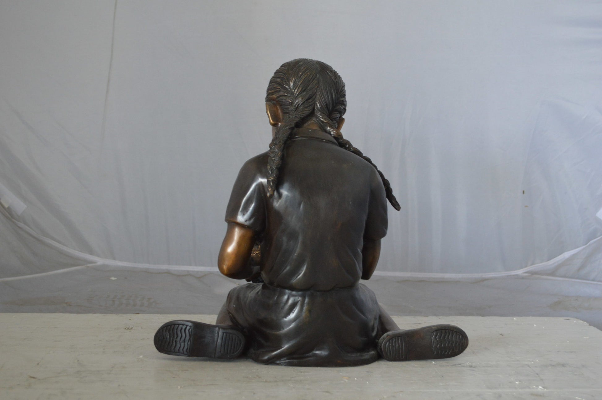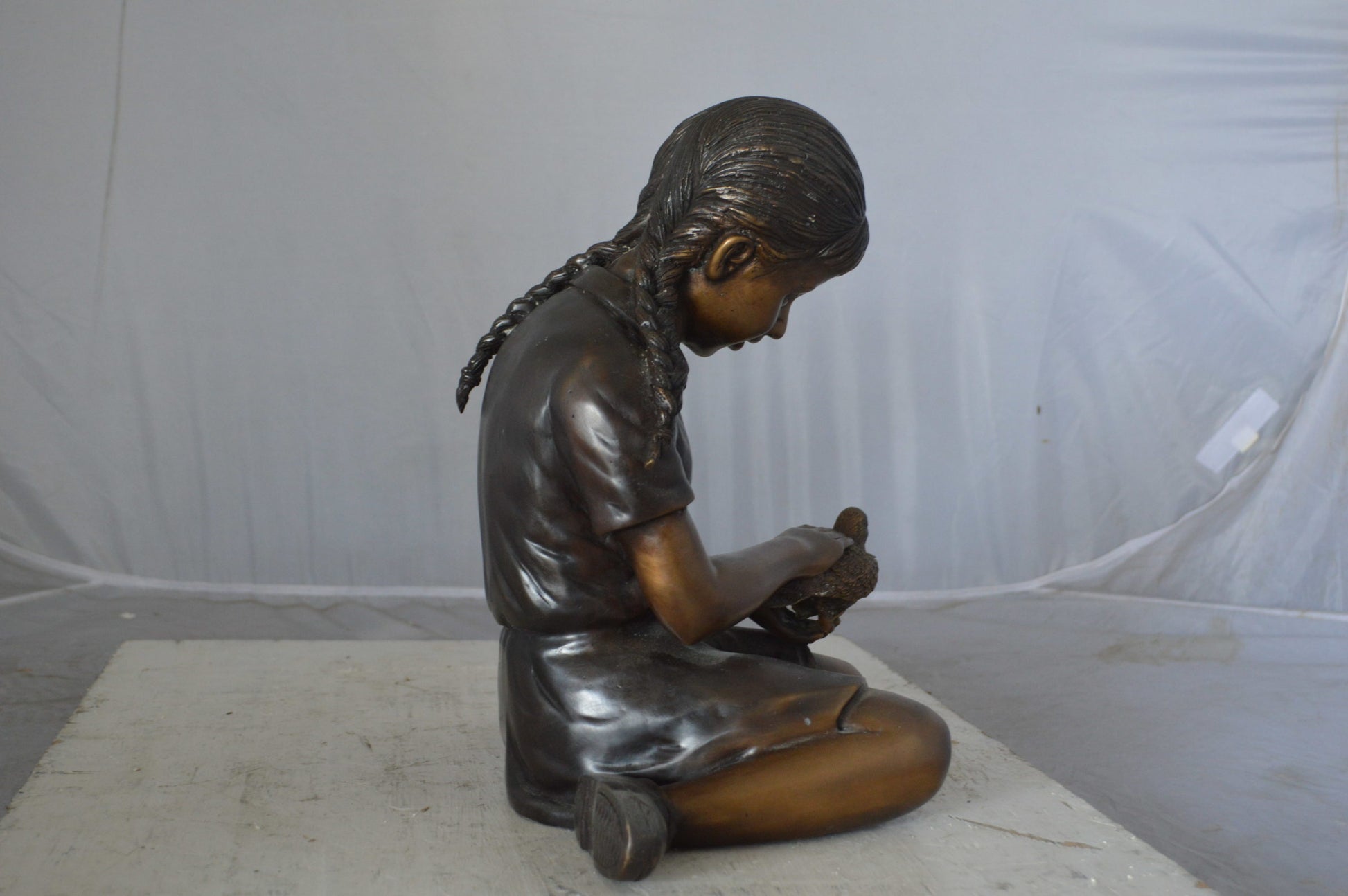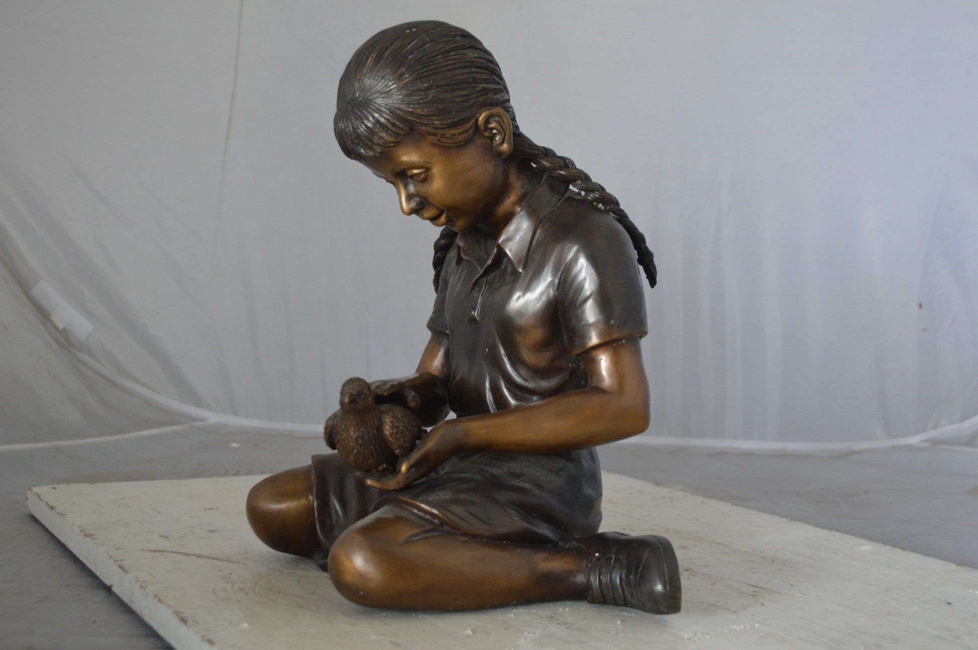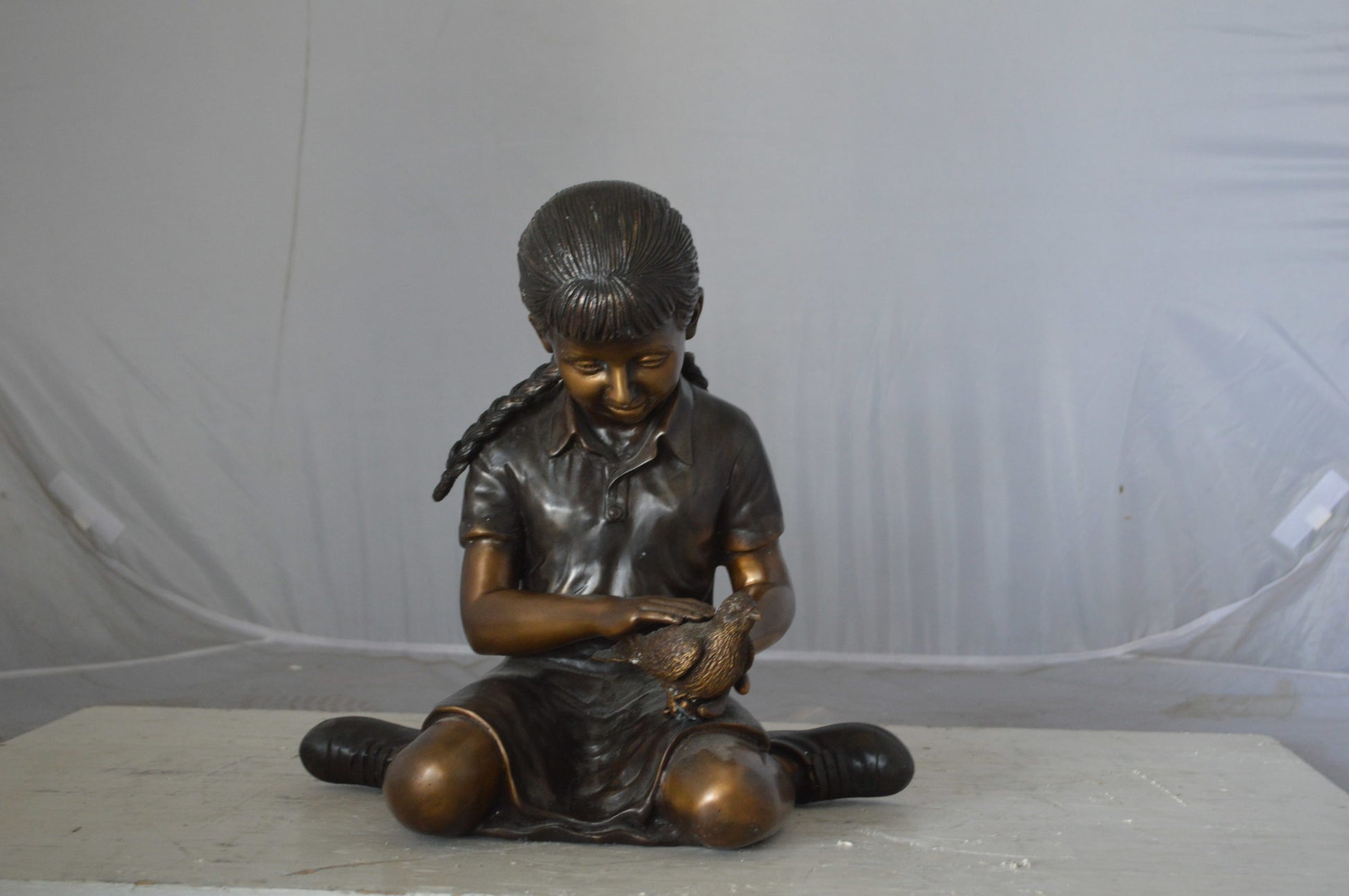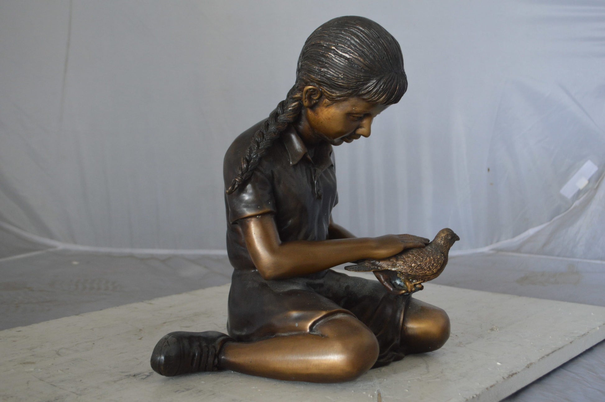 Young seated girl with bird bronze statue - Size: 12"L x 9"W x 14"H.